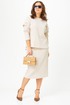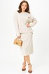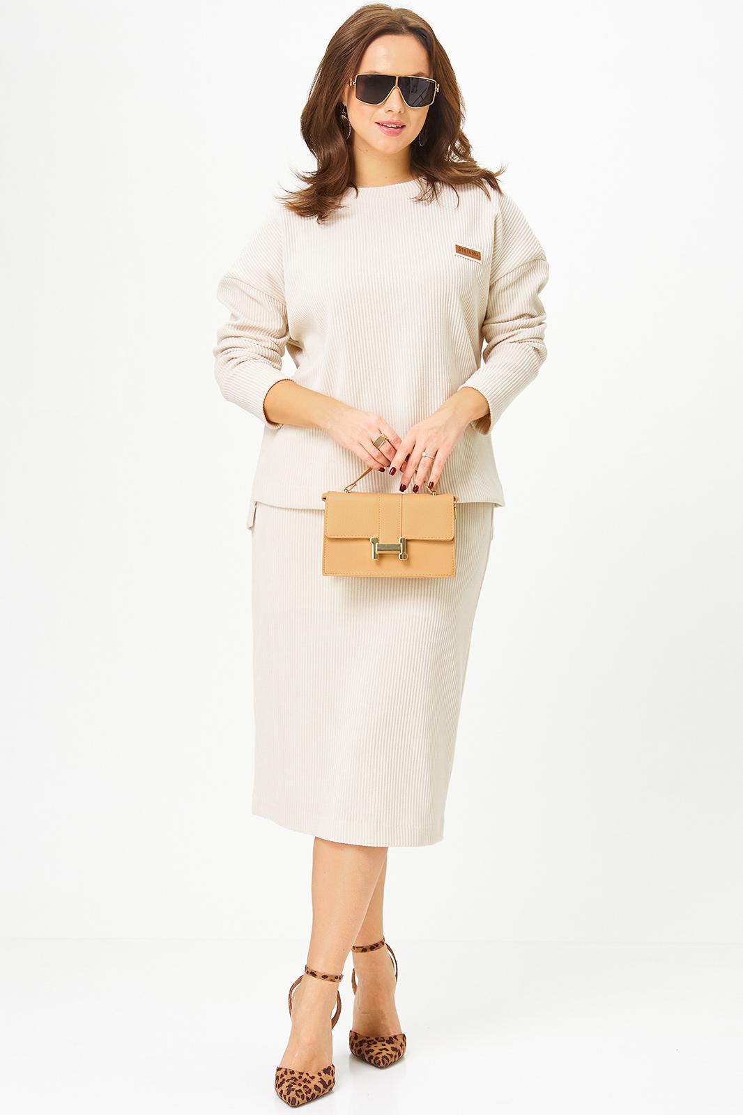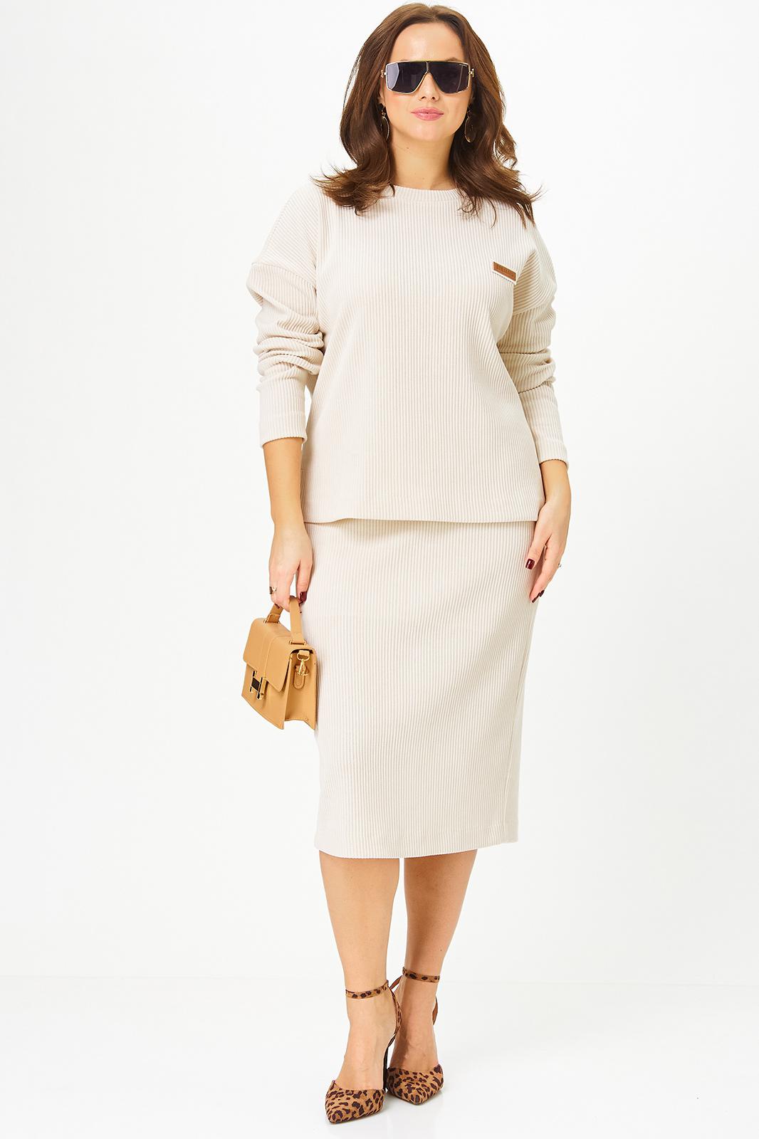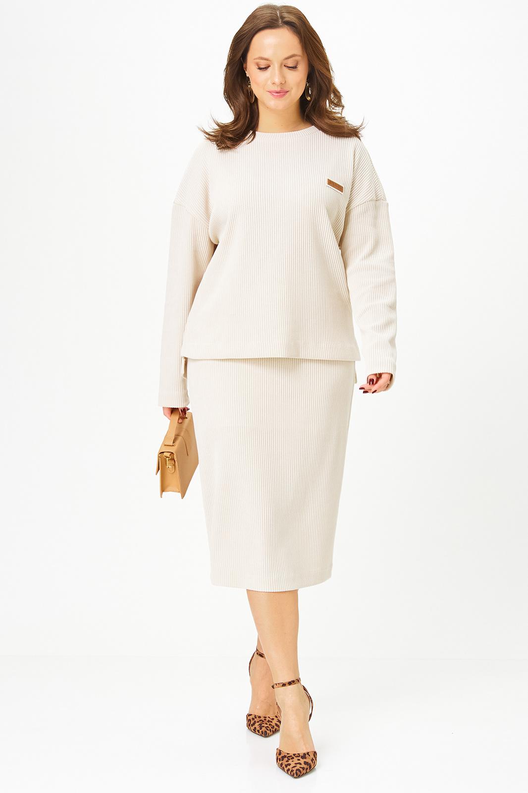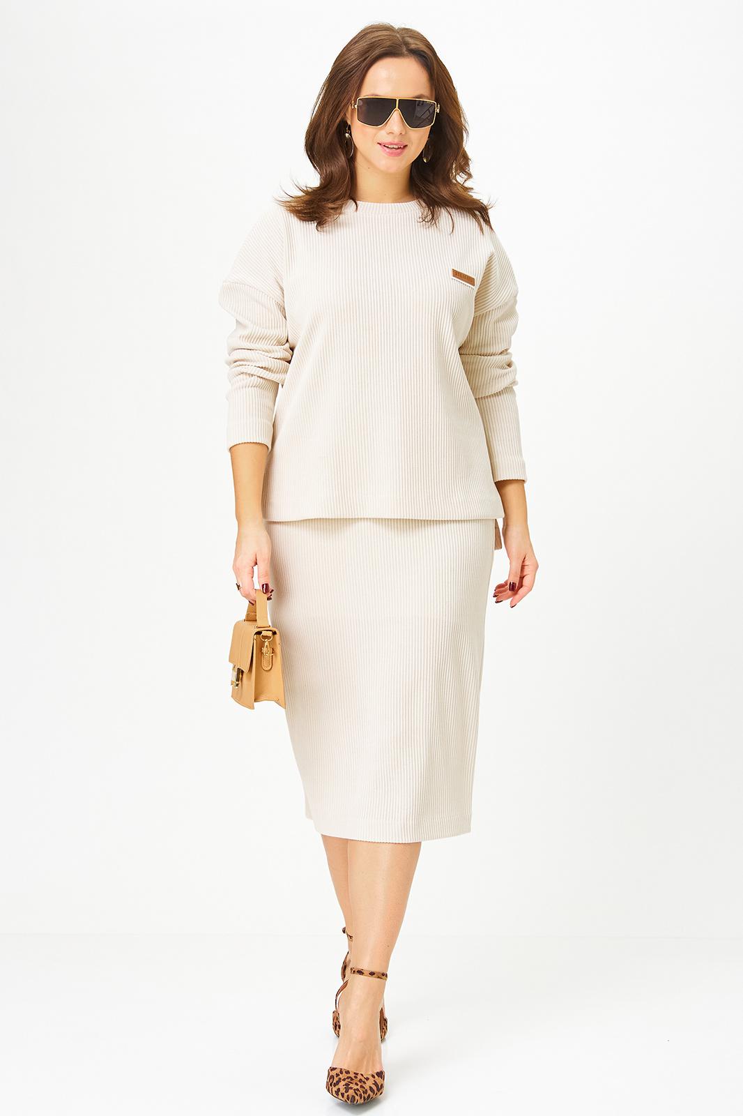 Данный комплект выполнен из мягкого трикотажного полотна, идеально подойдёт для демисезонного периода, благодаря натуральному составу в нём будет тепло но не жарко. Свитшот свободного кроя с длинными рукавами и спущенным плечом, предаёт образу мягкость и непринуждённость. Горловина выполнила из отделочной ткани в рубчик, что является очень функциональным и стильным элементом. Юбка прямая, на подкладке, на поясе, слегка зауженная к низу. Длина ниже линии колена. Средний шов юбки заканчивается шлицей.