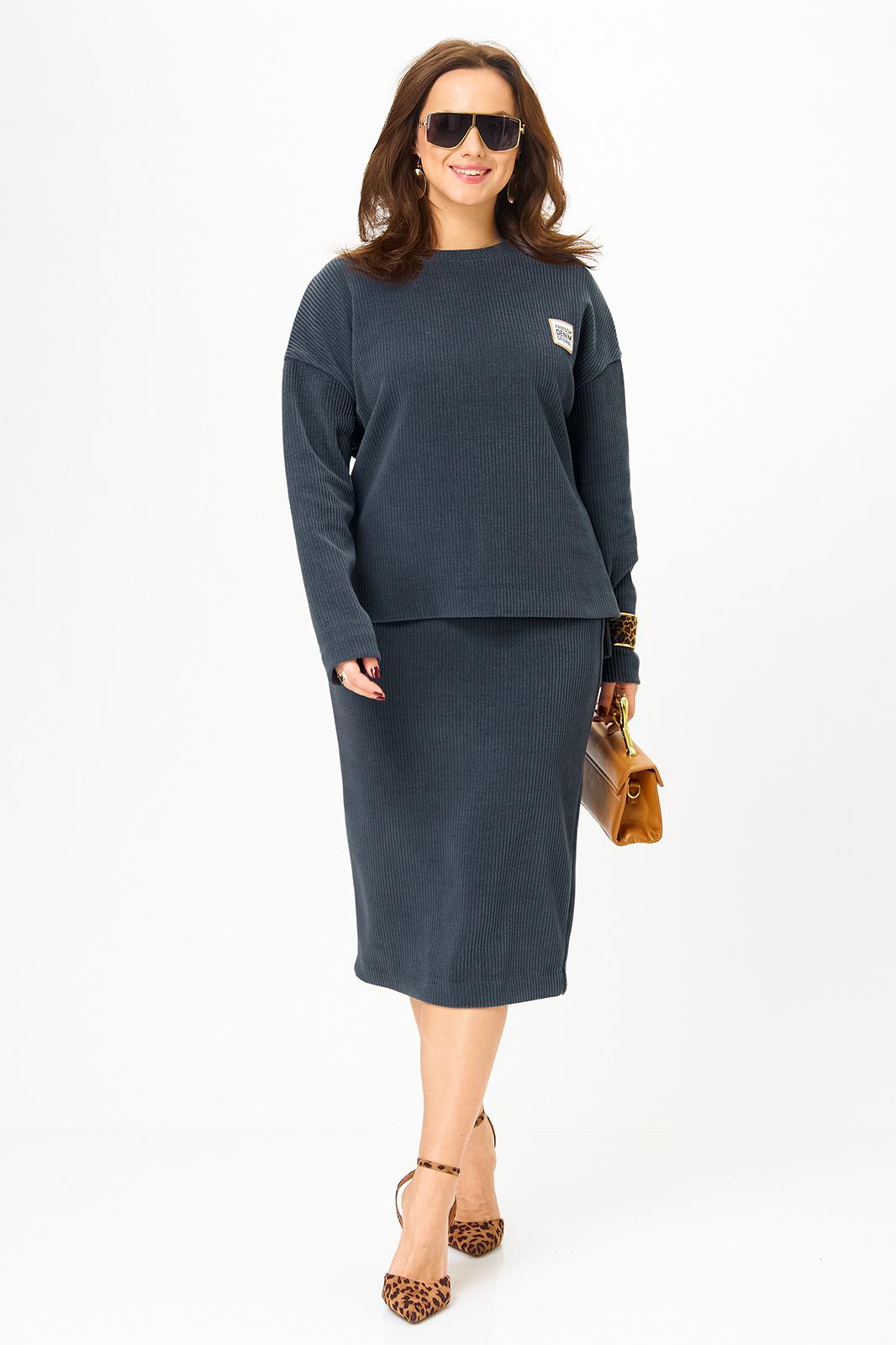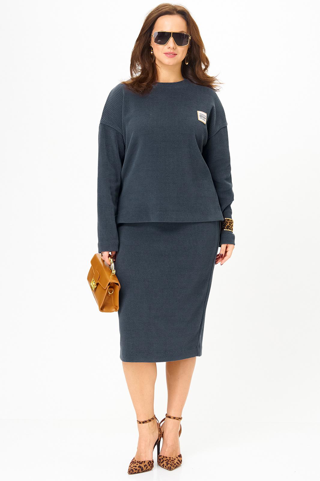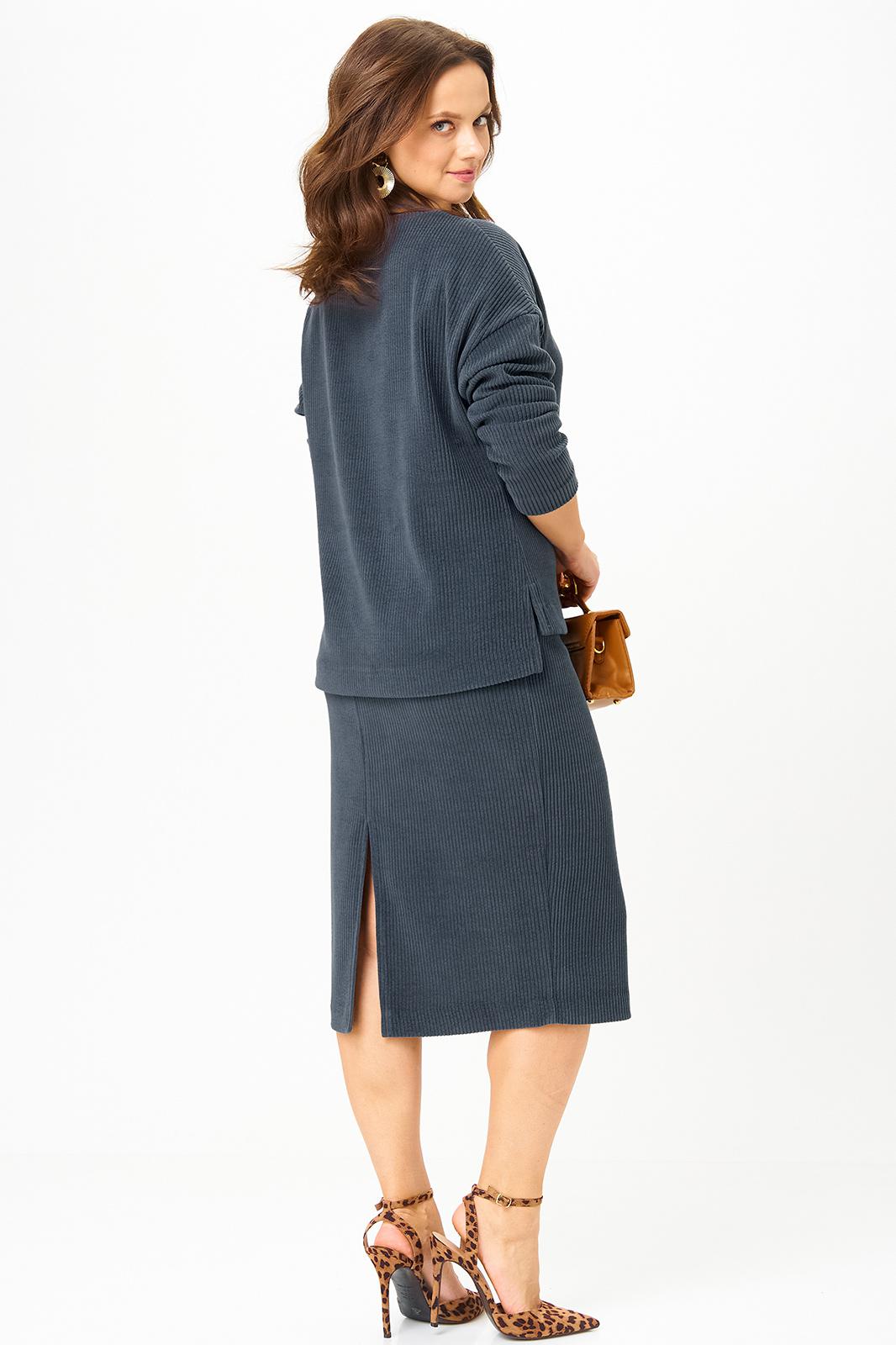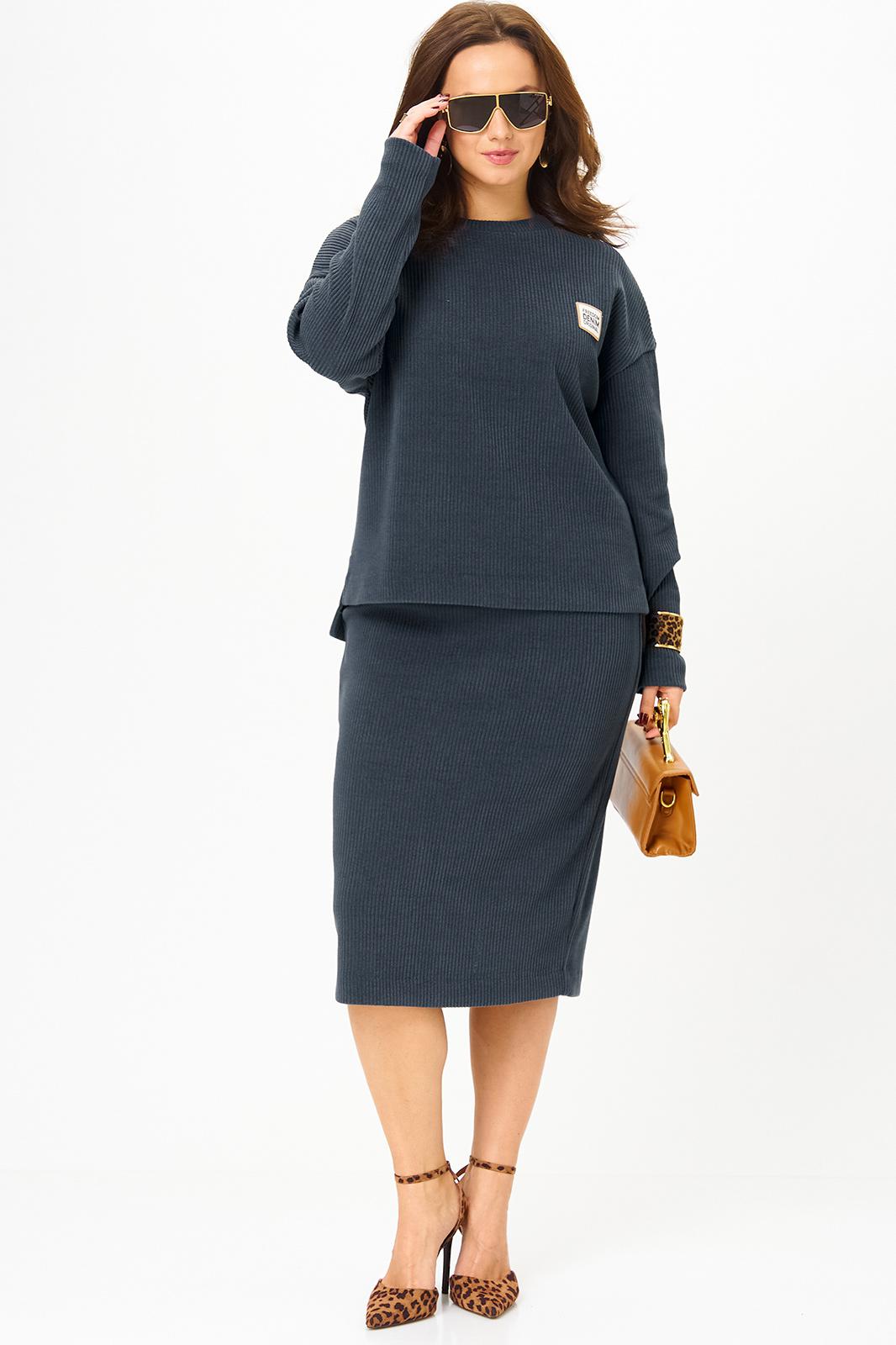 Данный комплект выполнен из мягкого трикотажного полотна, идеально подойдёт для демисезонного периода, благодаря натуральному составу в нём будет тепло но не жарко. Свитшот свободного кроя с длинными рукавами и спущенным плечом, предаёт образу мягкость и непринуждённость. Горловина выполнила из отделочной ткани в рубчик, что является очень функциональным и стильным элементом. Юбка прямая, на подкладке, на поясе, слегка зауженная к низу. Длина ниже линии колена. Средний шов юбки заканчивается шлицей.