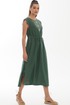 Платье женское прямого силуэта выполнено из льняной ткани с добавлением вискозы. Горловина круглая с застежкой на спинке на пуговицу. Рукав фантазийной формы. На центральной детали переда расположена вышивка в народном стиле. На талии настрочены короткие кулиски по центру спинки и переда, в которые продет декоративный шнур. В боковых швах по низу имеются разрезы по обеим сторонам.