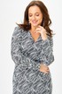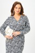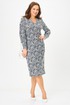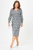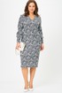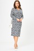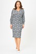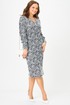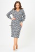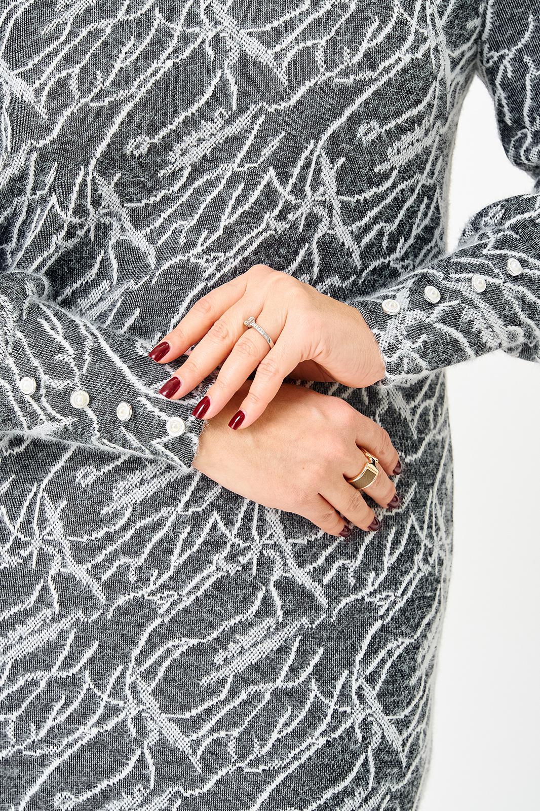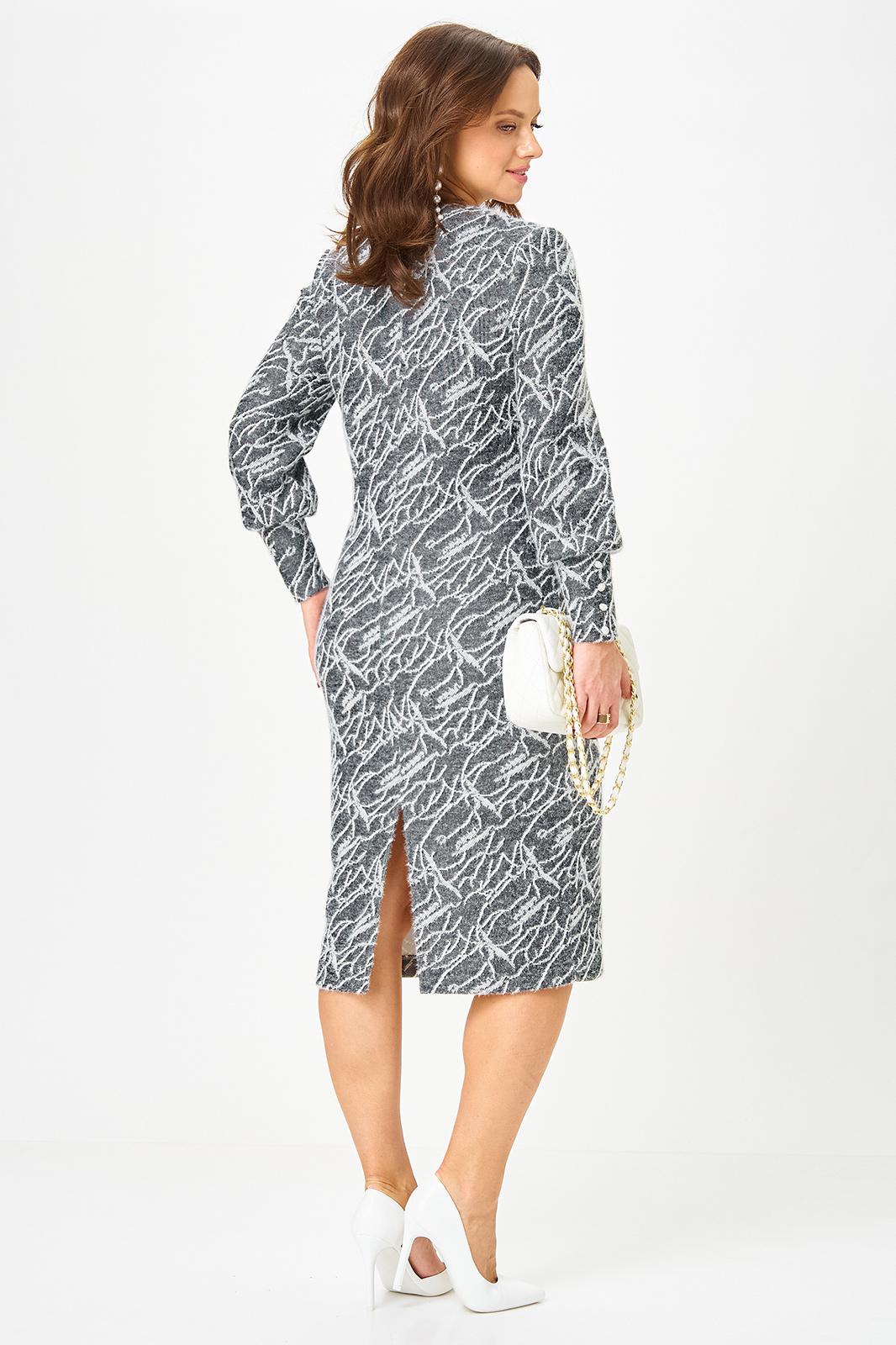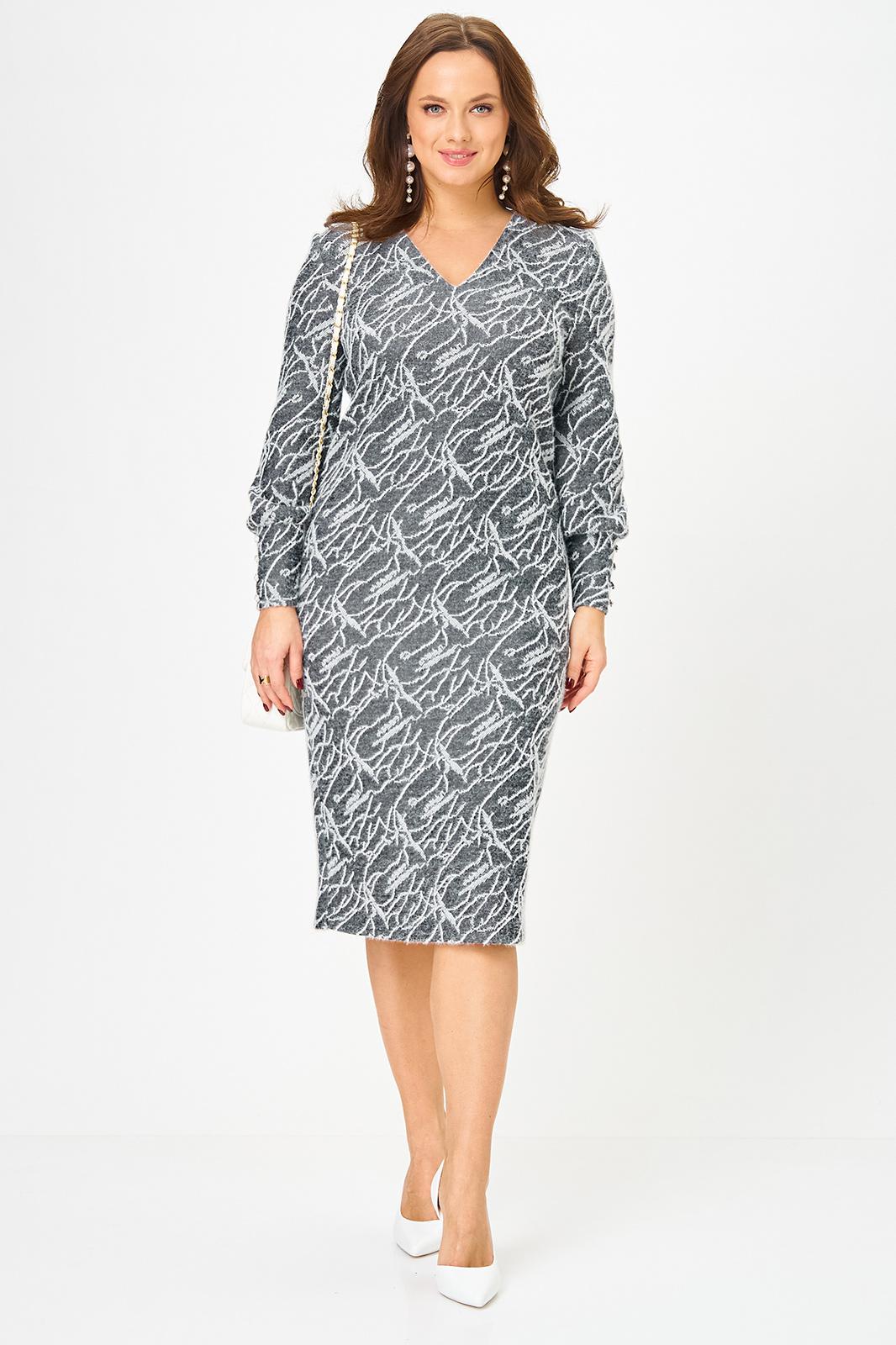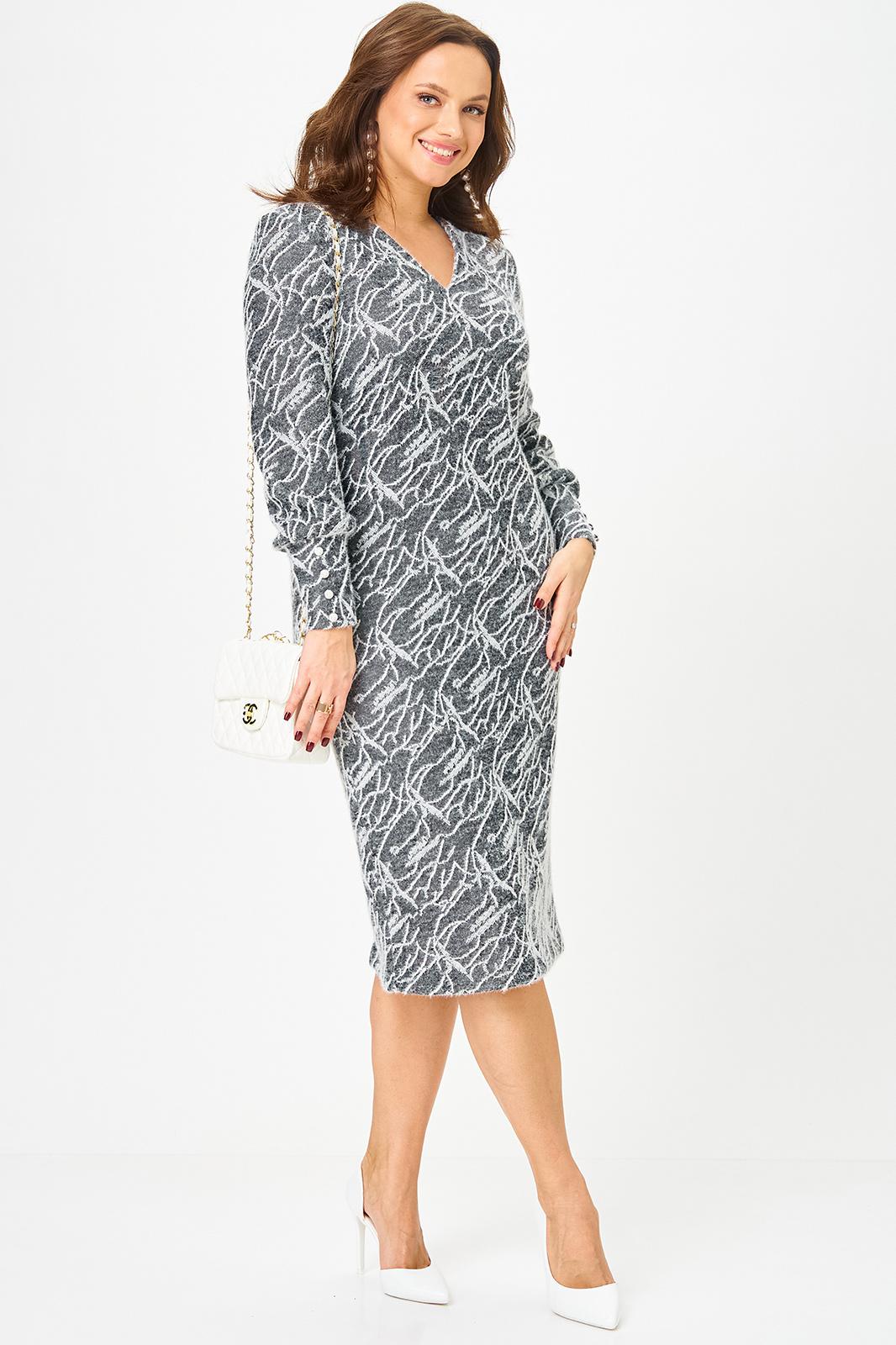 Платье женское, трикотажное полуприлегающего силуэта. v-образным вырезом по переду.Со средним швом заканчивающиеся разрезом.Рукава прямые собирающиеся с низу на манжет. Платье длиной ниже линии колена. На манжетах нашиты 4 декоративные пуговицы.