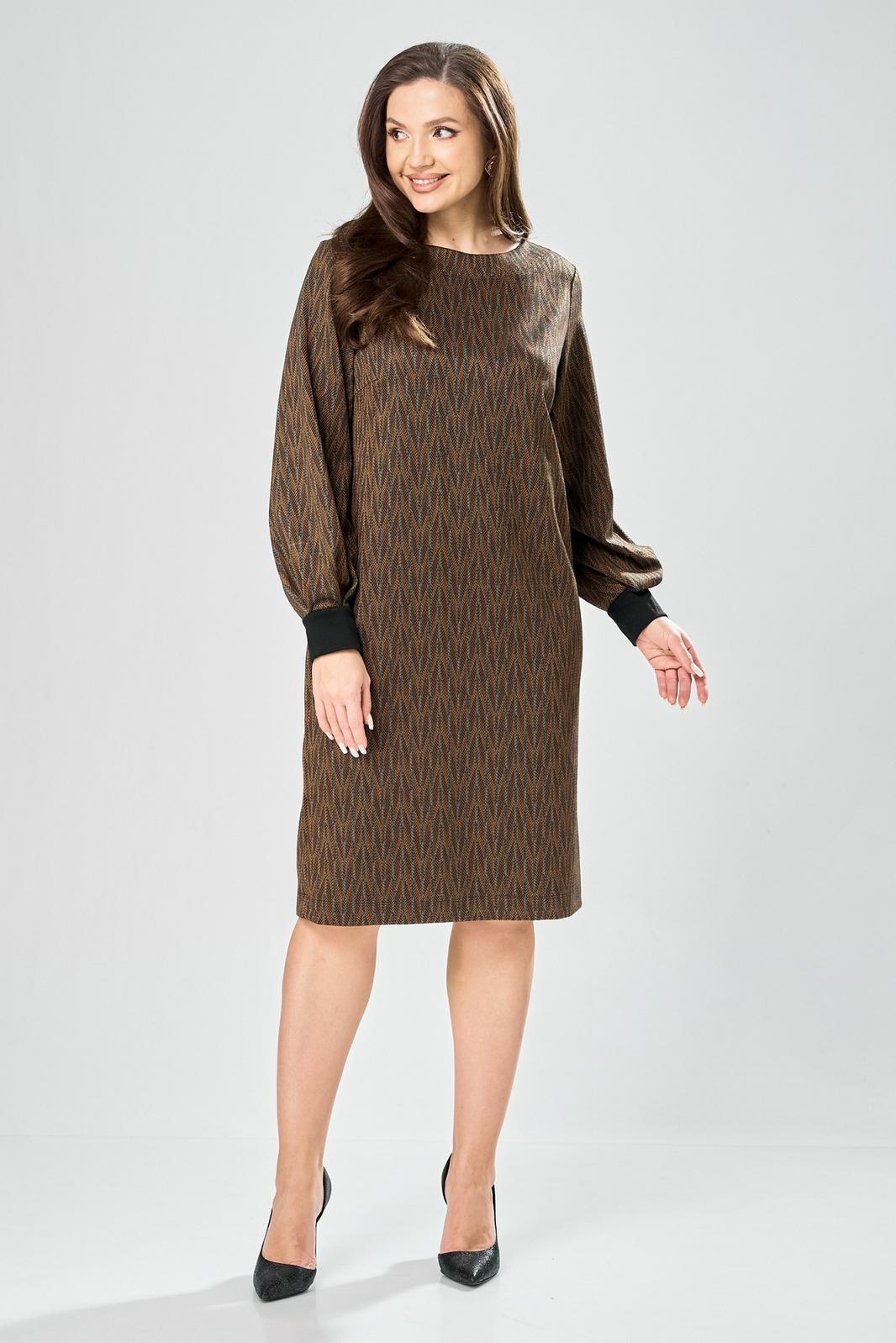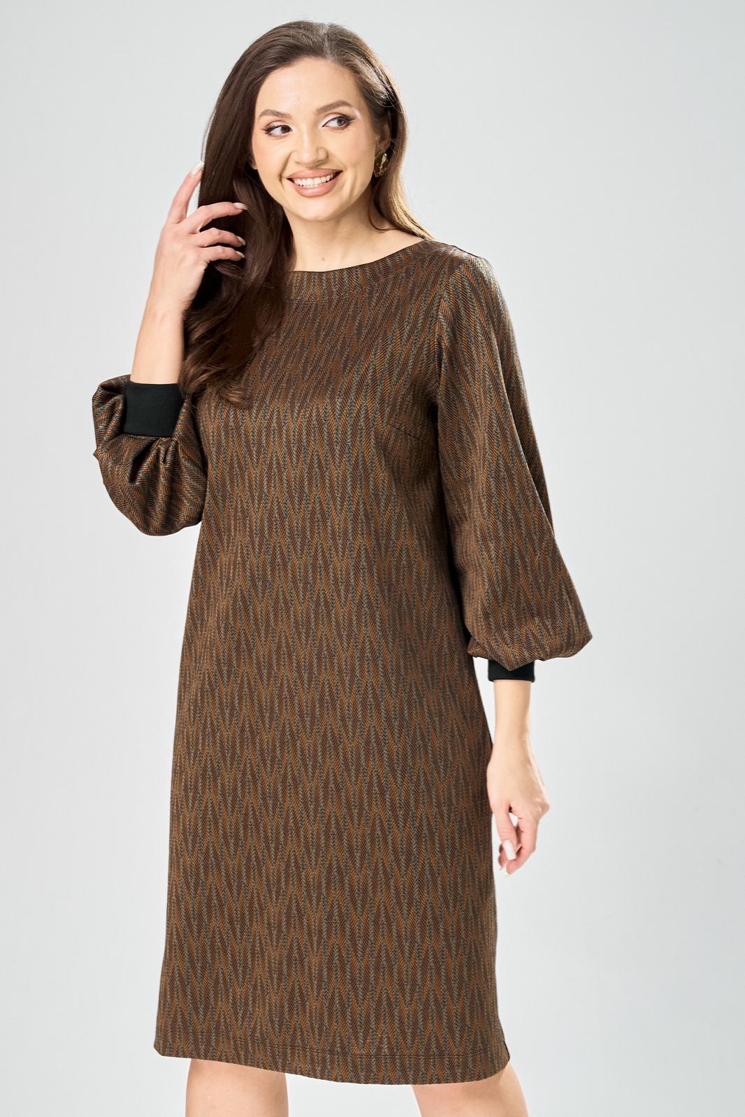 Платье прямого силуэта из плотного трикотажного полотна с рисунком. Перед с нагрудными вытачками. Спинка со средним швом. Горловина лодочкой обработана планкой. Рукав одношовный втачной по низу со складками собранными на манжету. В боковом шве карман. Длина платья-100см, длина рукава-60см.