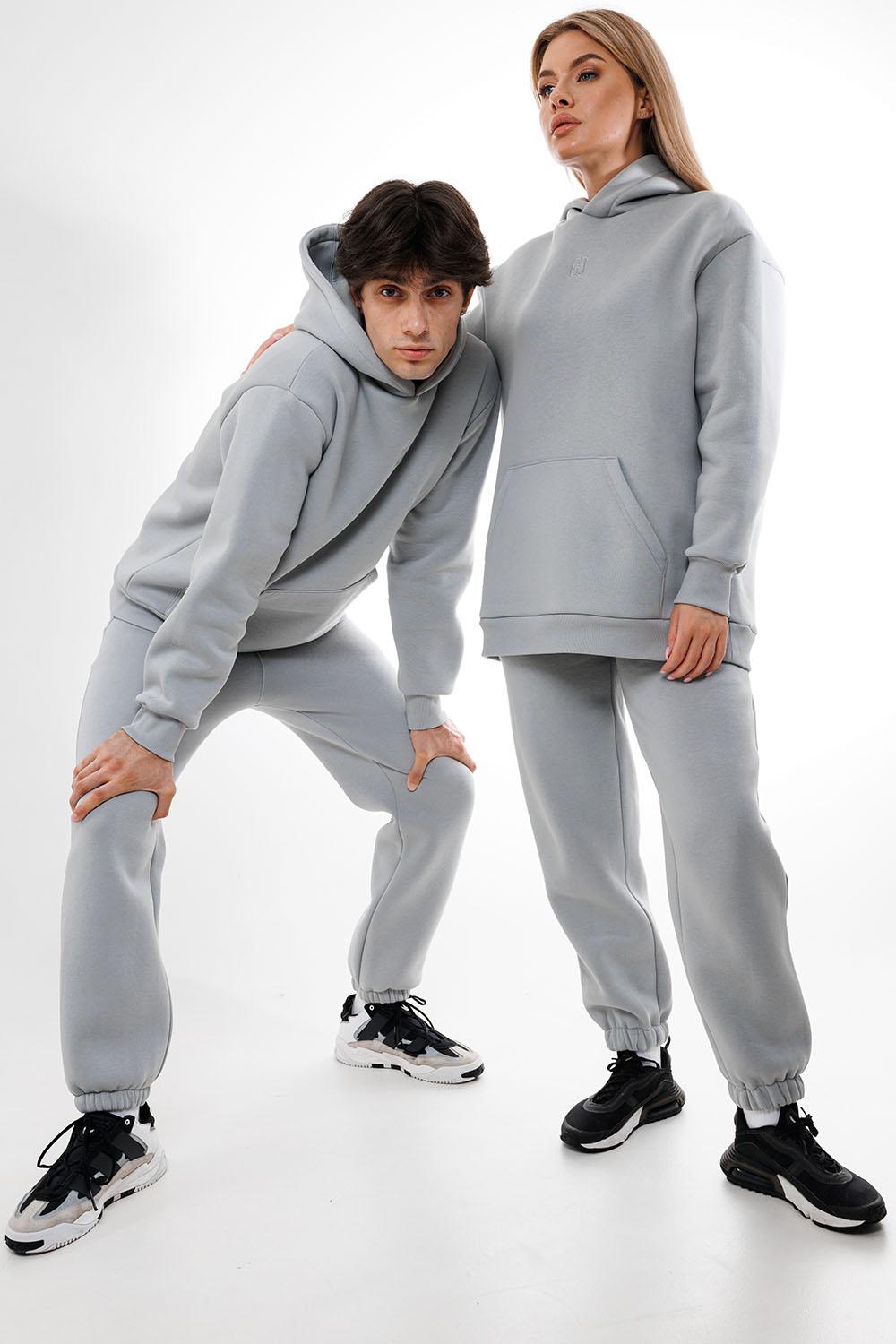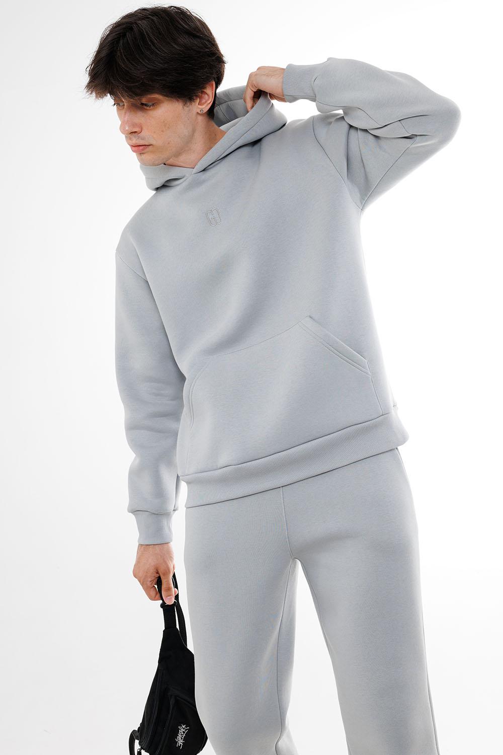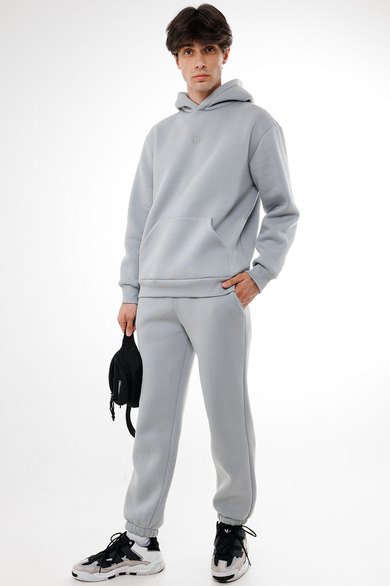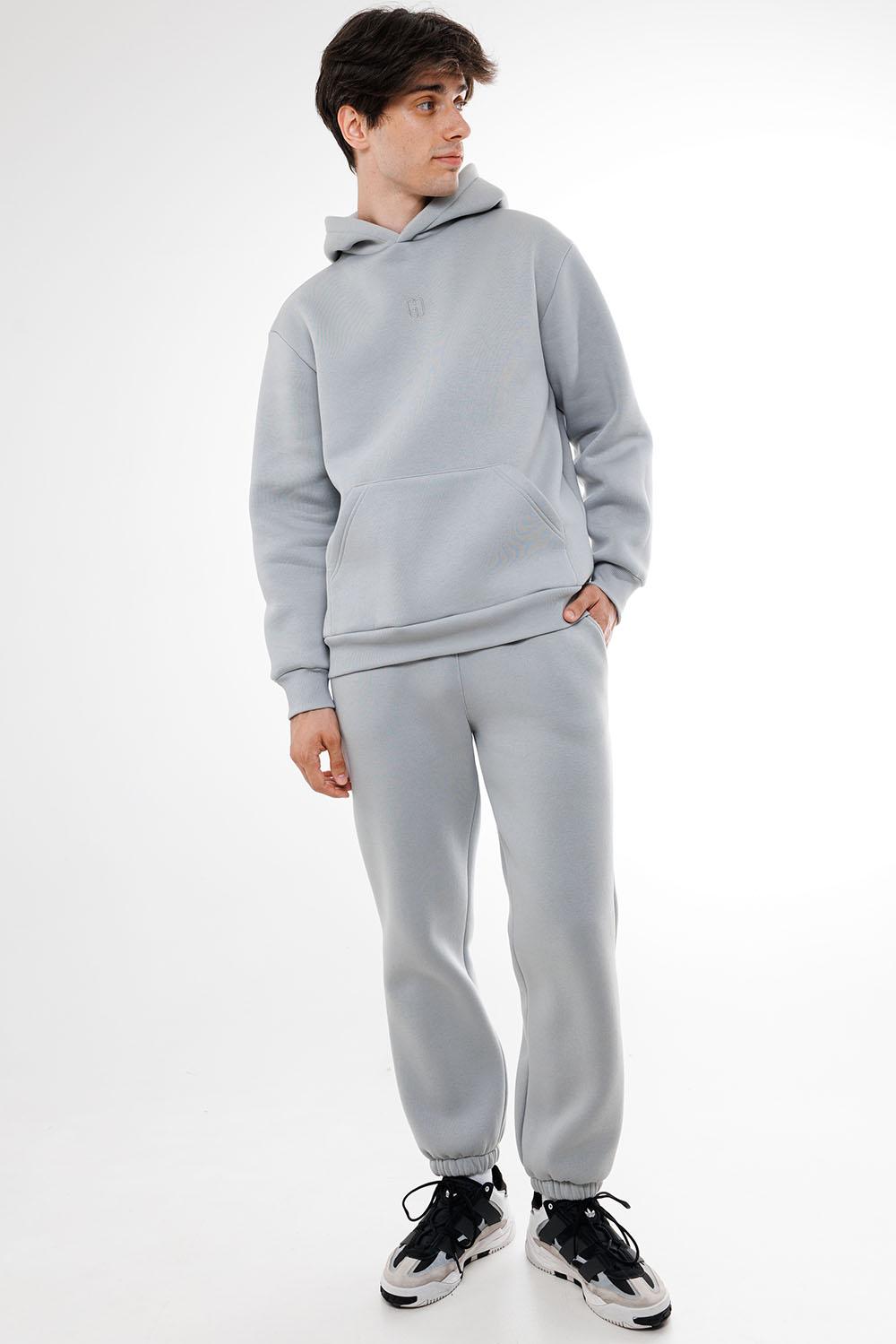 Костюм комфортный покроя oversize, спортивного стиля из комфортной ткани (футера с начесом). Костюм состоит из худи и брюк. Худи прямого силуэта, с притачной манжетой по низу изделия. Худи имеет двойной капюшон с кулисой и шнуром внутри. На переде карман - кенгуру и вышивка – логотип по центру переда в цвет ткани. Рукава втачные с манжетой. Брюки с притачным поясом с резинкой и шнурком внутри. Передняя половинка брюк с боковыми карманами. Низ брюк присобран на резинку.