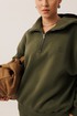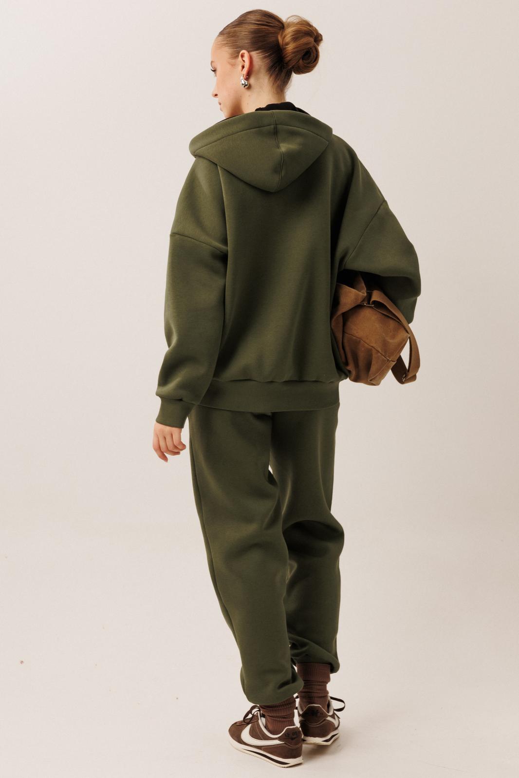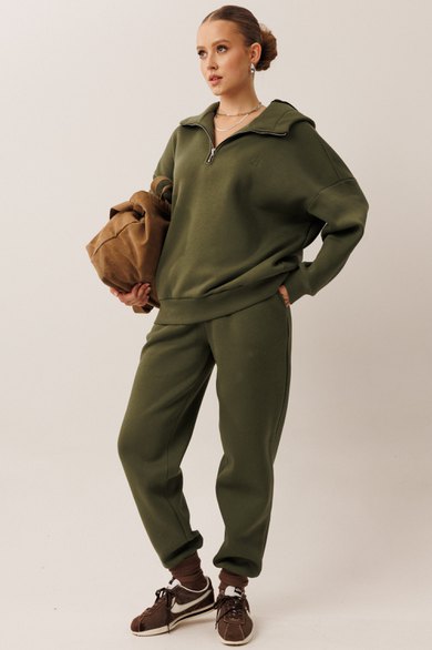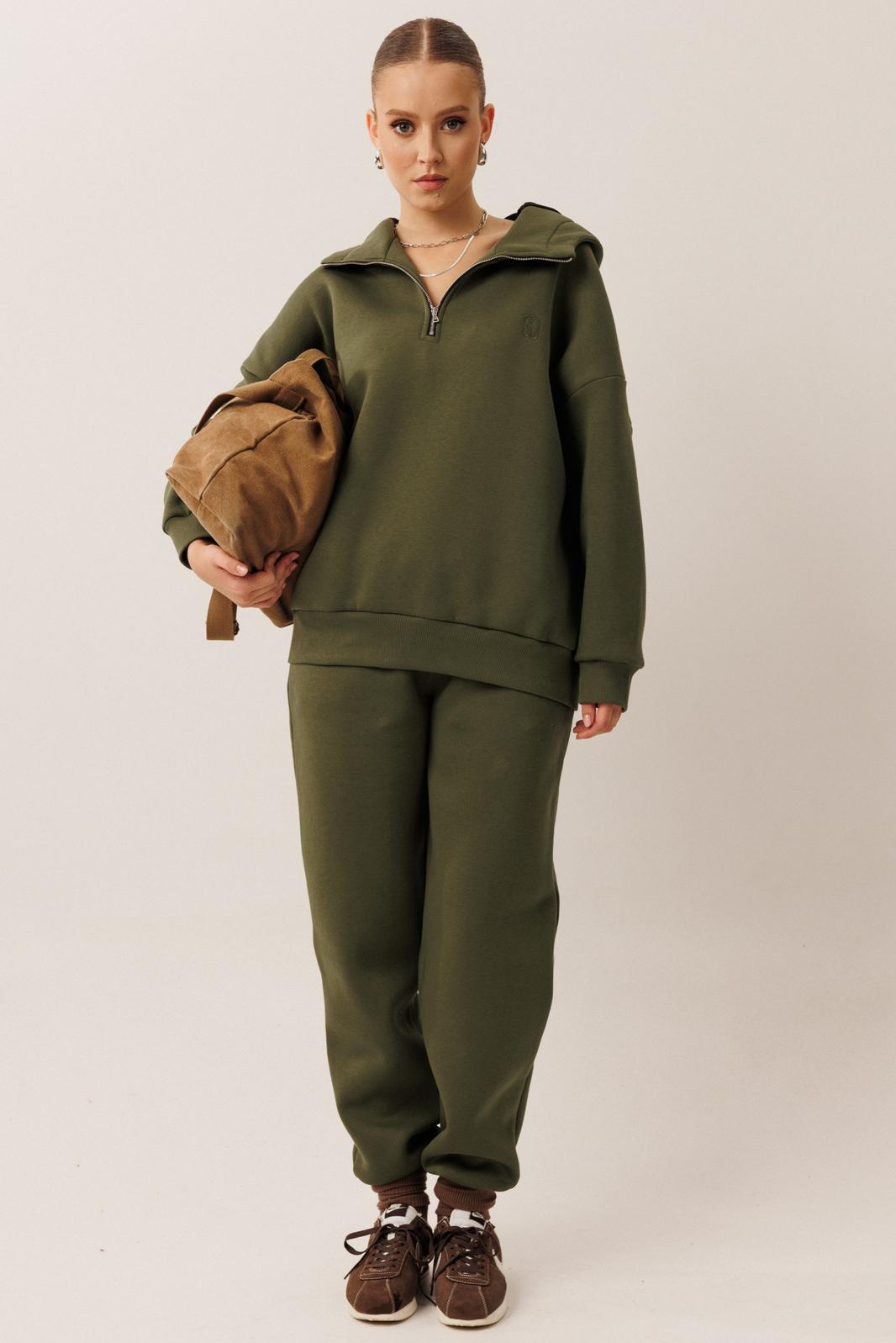 Женский тёплый уютный костюм. Подойдёт для прогулок и отдыха. Изготовлен из футера с начёсом, состоит из джемпера с капюшоном, покроя оверсайз и брюк. Джемпер имеет контрастную короткую застёжку- молнию по центру переда, которая переходит в капюшон. Капюшон двойной, внутренняя часть выполнена из кулирки. Слева на переде вышивка-логотип в цвет ткани. Рукава имеют притачную манжету. Манжеты рукавов и низ изделия выполнены из ткани- компаньона кошкорсе. Брюки немного зауженные, снизу с манжетой. Передние половинки имеют удобные карманы. Пояс с резинкой и шнурком внутри. Пояс и манжеты выполнены из кошкорсе.