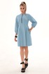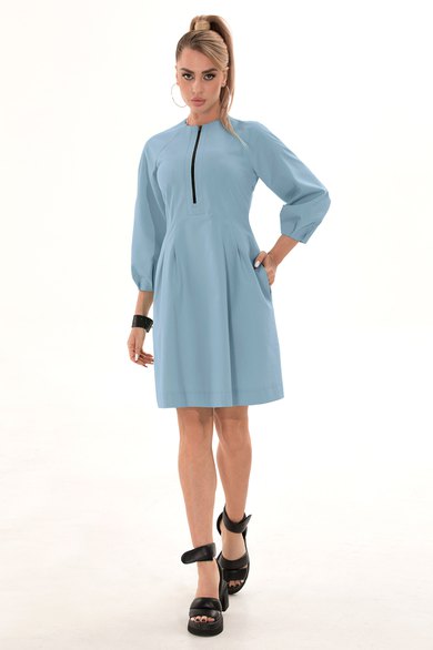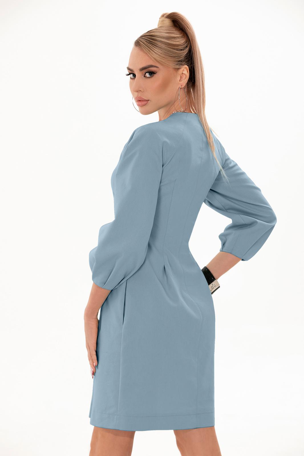Описание внешнего вида: Платье без воротника, с круглым вырезом горловины, застежкой на втачную молнию по вехней части переда. Перед с талиевыми вытачками, переходящими в односторонние складки. Спинка со средним швом, талиевыми вытачками, переходящими в односторонние складки. Рукав реглан, с односторонними складками по низу..