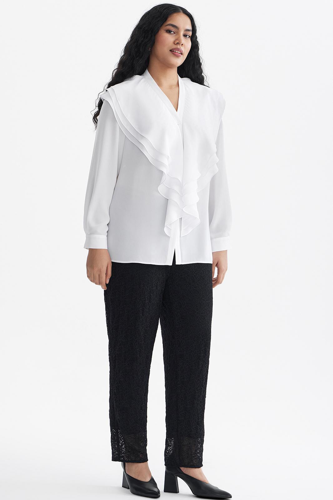 Блузка с центральной застежкой на петли и пуговицы, без воротника, с планкой по борту и горловине. По горловине переда и частично по борту закреплены к планкам три ряда воланов. Спинка цельная. Рукав втачной, длинный, с отрезной манжетой, застегивающейся на две петли и пуговицы.