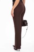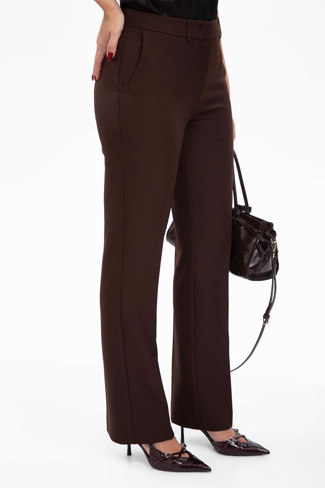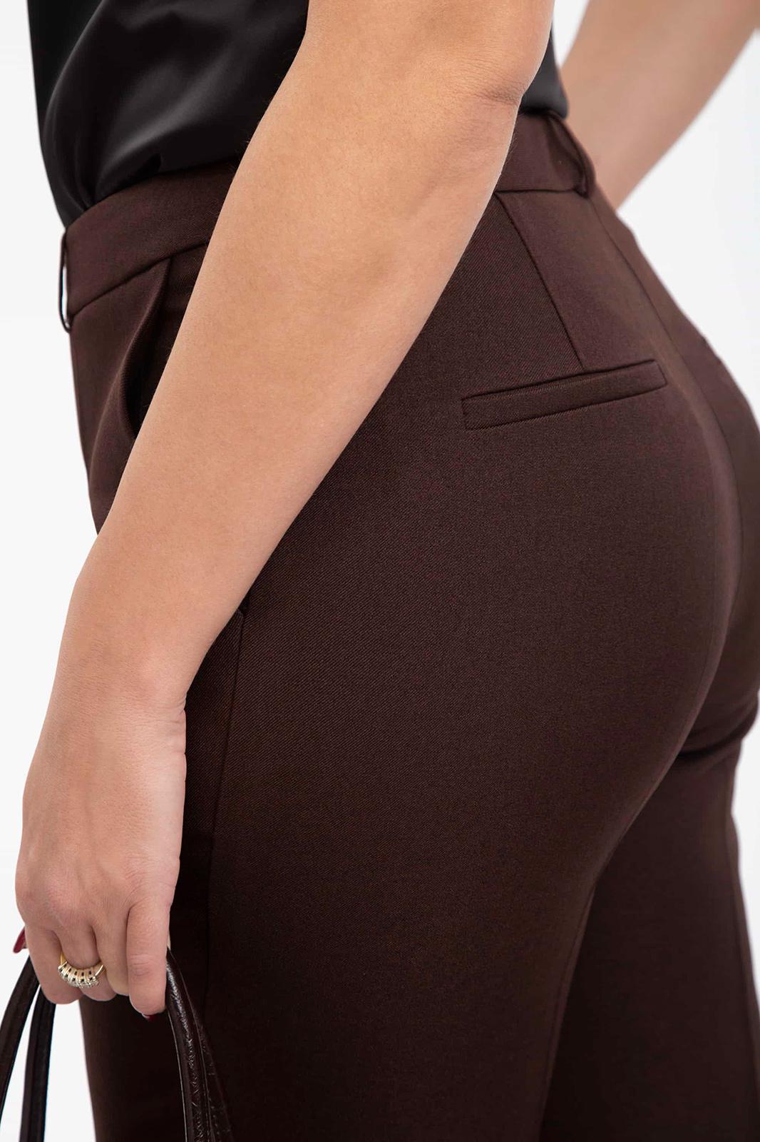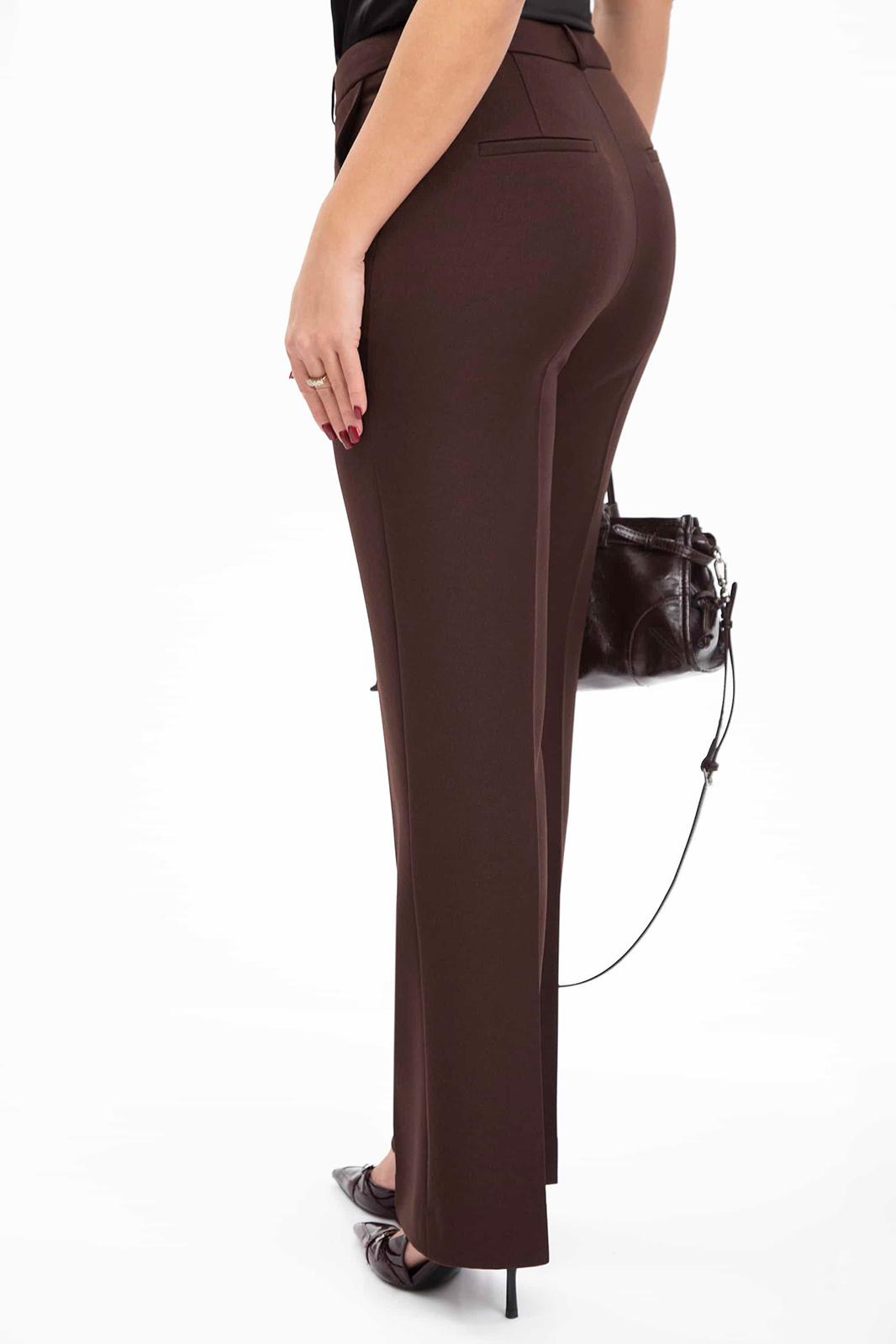 Брюки с отрезным поясом на один брючный крючок и потайную пуговицу, застежку-гульфик. Передние половинки с карманами, наклонными к боковому шву и бочком-подзором. Задние половинки с вытачками и прорезными карманами с листочкой. Брюки со стрелками и настрочными шлевками.