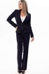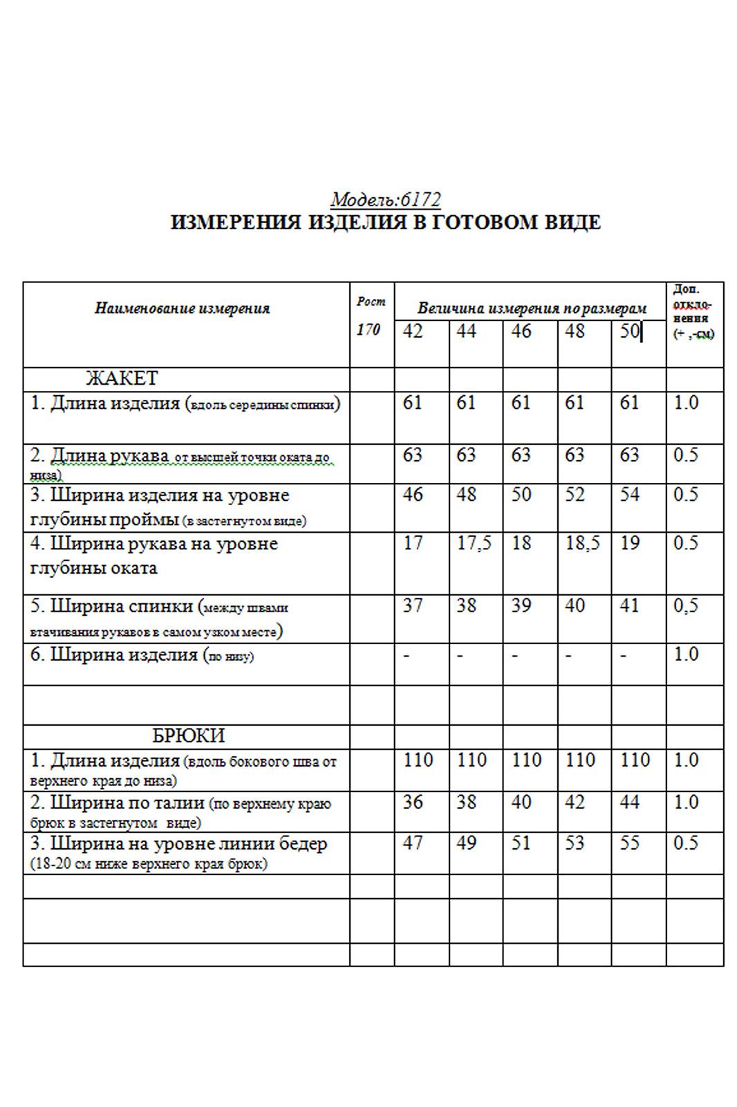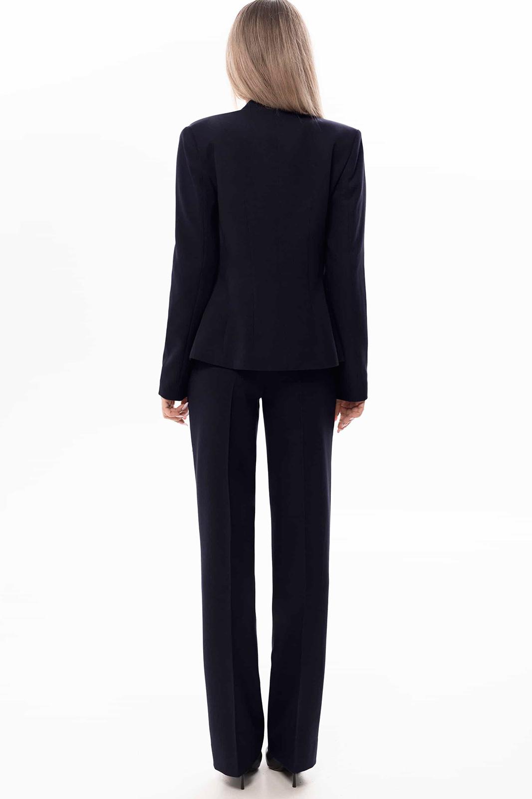 Цветовая гамма для верха, подкладки, фурнитуры, отделки:Жакет и брюки выполнены из эластичной ткани одного вида. Фурнитура металлическая (черненый никель). Все отделочные строчки выполнены в тон основной ткани. Подкладка жакета – контрастный жаккард с рисунком.