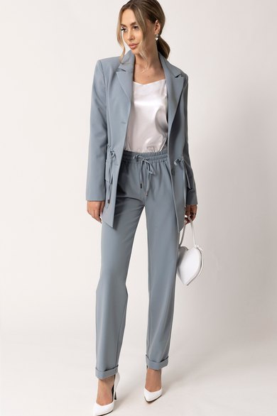 Комплектация: Жакет, брюки. Жакет прямого силуэта на подкладке, с центральной застежкой на петли и пуговицы, отложным воротником и лацканами пиджачного типа. По переду с нагрудными вытачками, накладными карманами с клапанами . Спинка цельная. На уровне линии талии кулиса со шнуром. Рукав втачной, длинный. Брюки с отрезным поясом, присборенным на резинку. Передние половинки с карманами, вход в карман наклонный к боковому шву. По низу брюк отложная манжета.