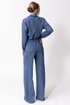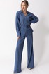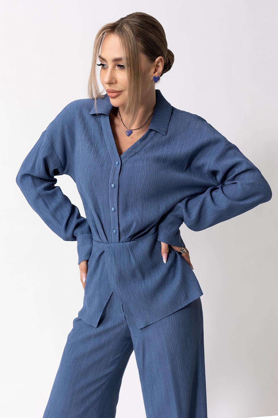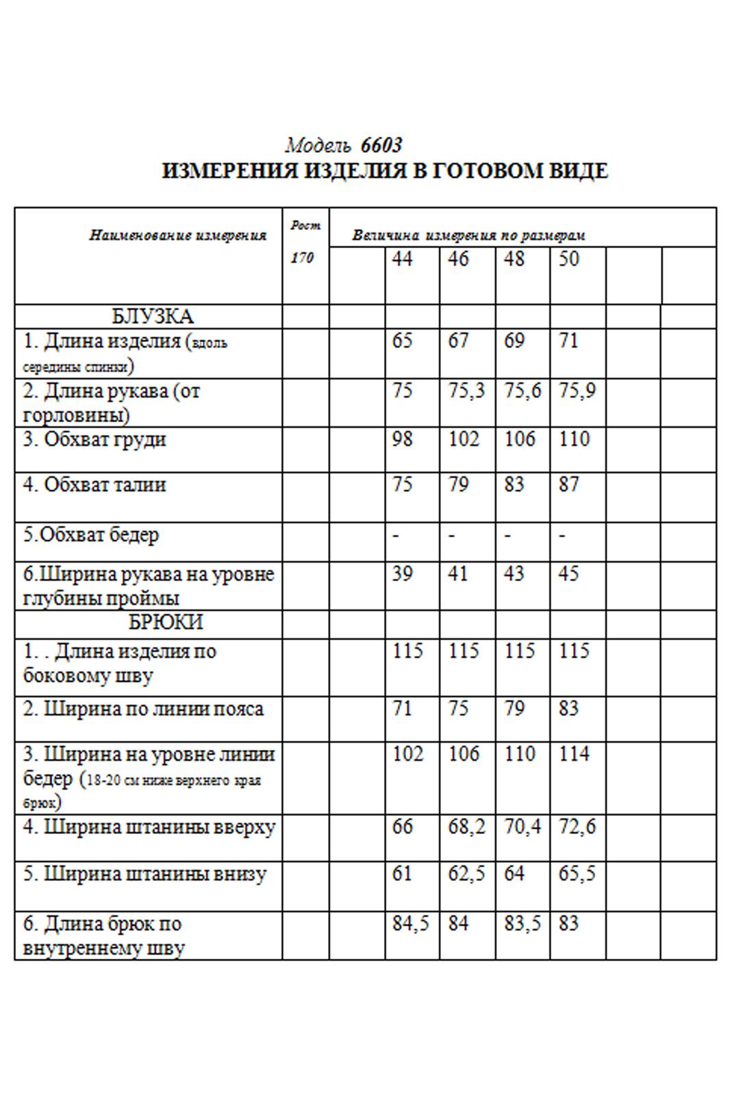 Комплектация: Блузка, брюки. Блузка с центральной застежкой на петли и пуговицы, отложным воротником и отрезной планкой по борту и горловине. Блузка с отрезной баской. По шву притачивания баски по две односторонние складки. По спинке шов притачивания баски присборен на резинку. Плечо спущенное. Рукав втачной, длинный, с отрезной манжетой, застегивающейся на одну петлю и пуговицу. Брюки прямые, без пояса. По спинке верхний срез брюк присборен резинку. Застежка гульфик.
