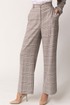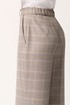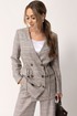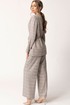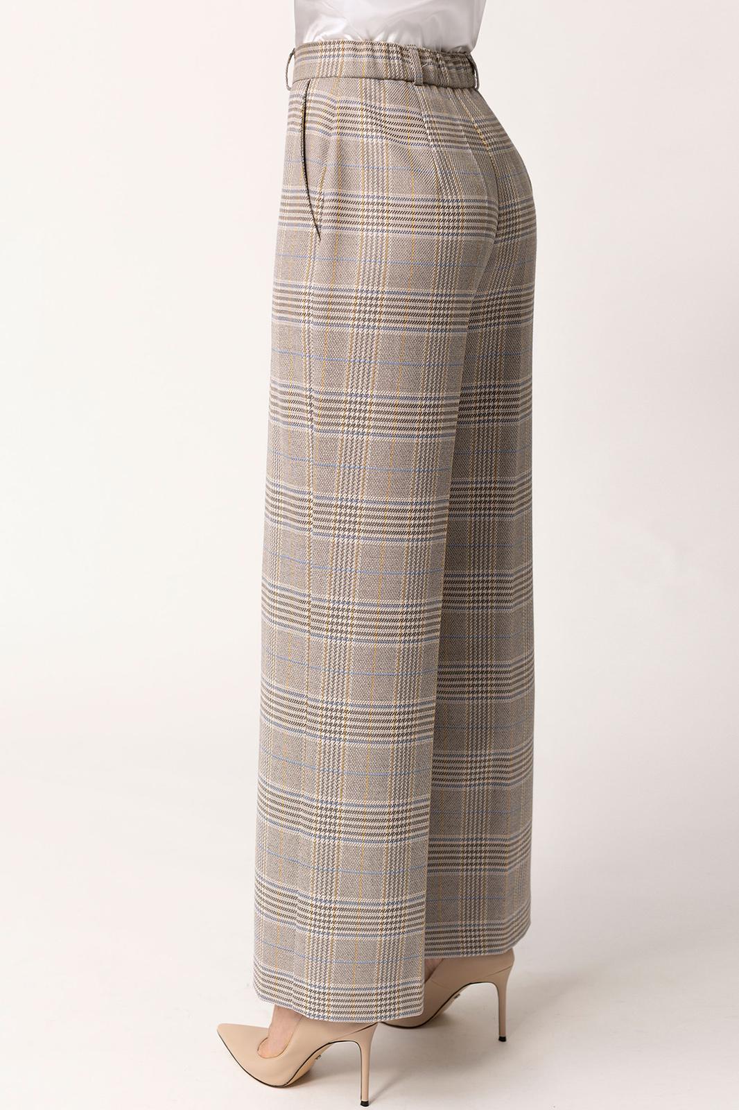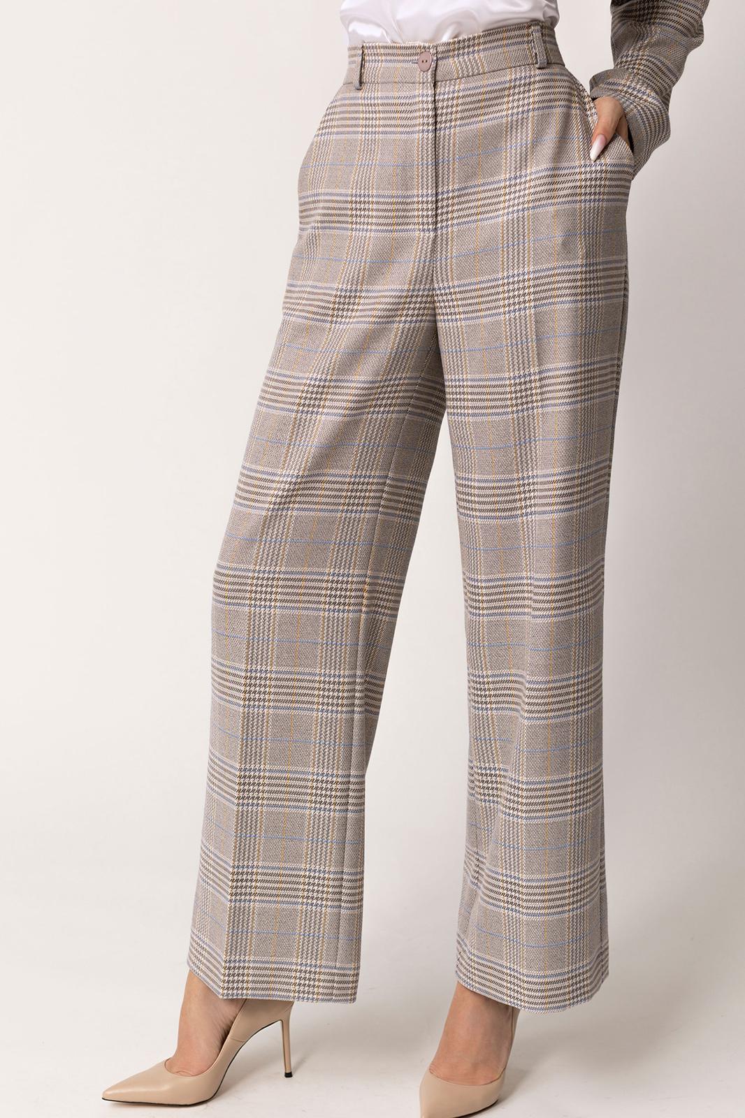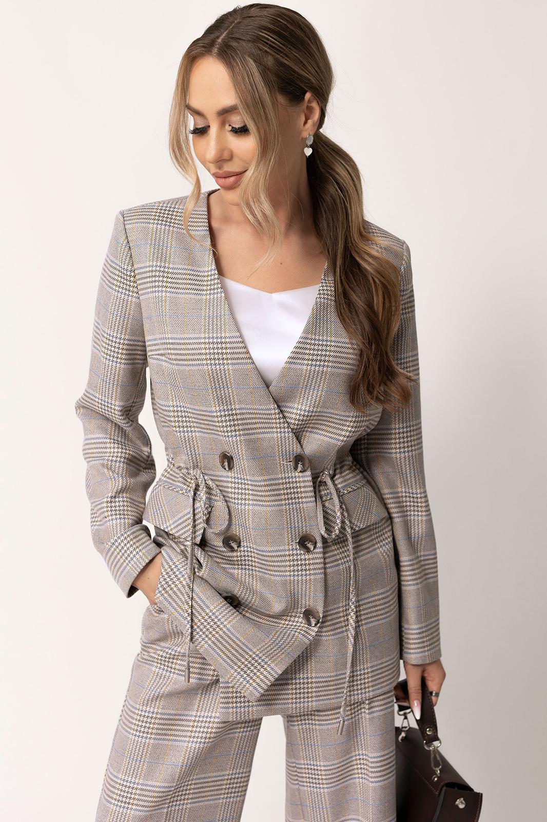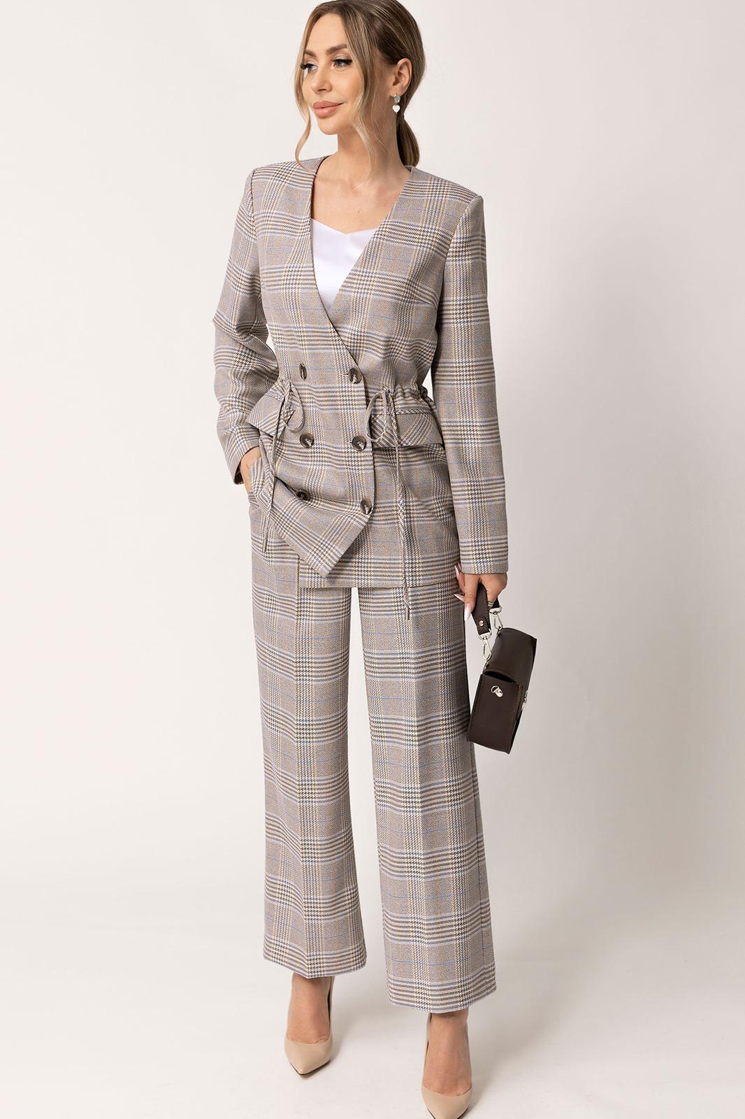 Комплектация: жакет, брюки. жакет прямого силуэта с центральной двубортной застежкой на петли и пуговицы, без воротника, с V-образным вырезом горловины. По линии талии- кулиса со шнуром- завязкой. По переду с нагрудными вытачками. На уровне линии бедер расположены прорезные карманы с клапаном и двумя обтачками. Рукав втачной, длинный. Брюки прямые, с отрезным поясом, на поясе расположены шлевки. По спинке пояс присборен на резинку. По боковым швам расположены карманы. Вход в карман наклонный к боковому шву. Застежка гульфик.