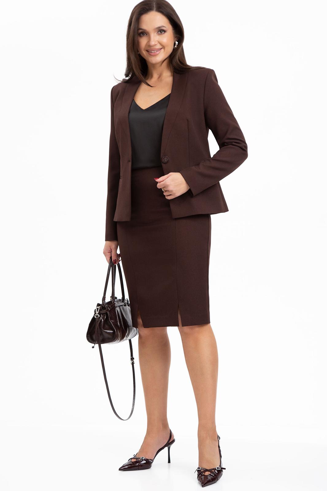 Костюм женский, состоит из жакета и юбки. жакет с центральной застежкой на петлю и пуговицу, с отрезной стойкой. Перед с вытачками от прорезного кармана с листочкой и рельефами от проймы. Бочок спинки жакета переходит на перед. На переде жакета отрезные детали вдоль линии подборта. Спинка со средним швом, вытачками и рельефами выходящим из проймы.