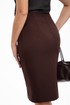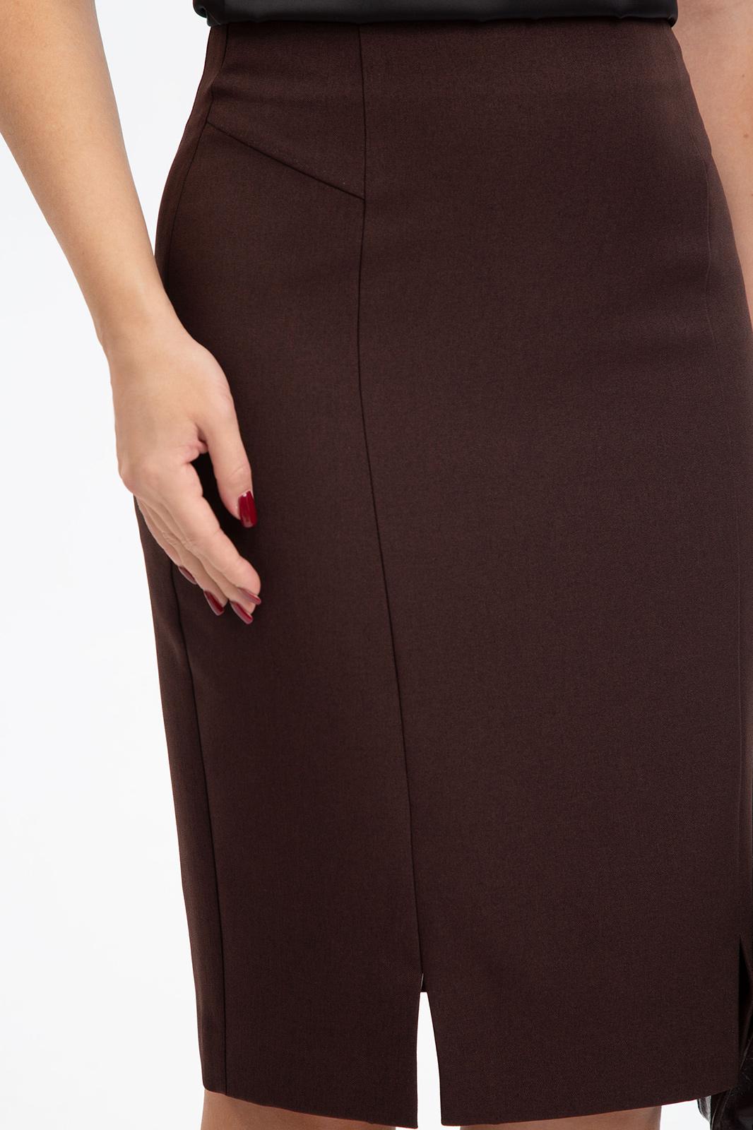 Юбка без пояса, верхний срез обработан обтачками. Переднее полотнище юбки с рельефными швами, заканчивающимися разрезами. Заднее полотнище юбки со средним швом, талиевыми вытачками.