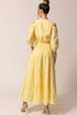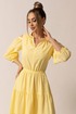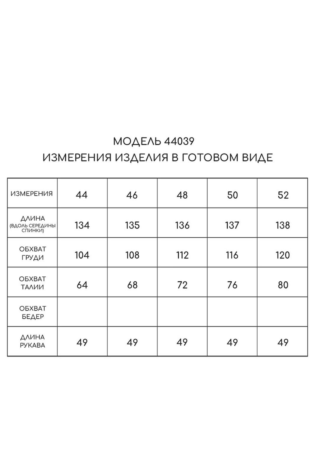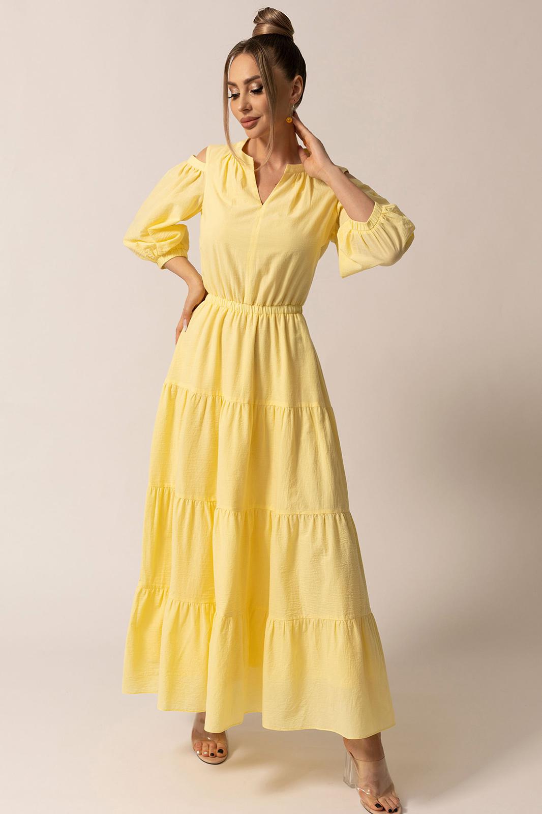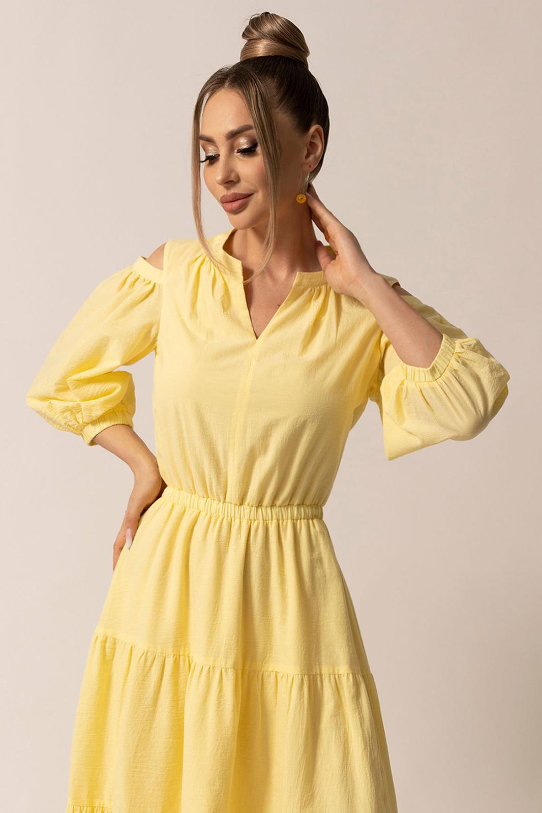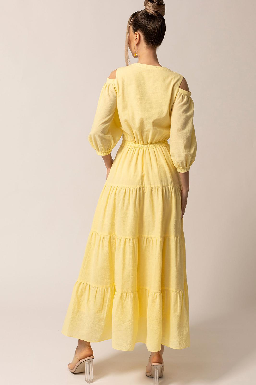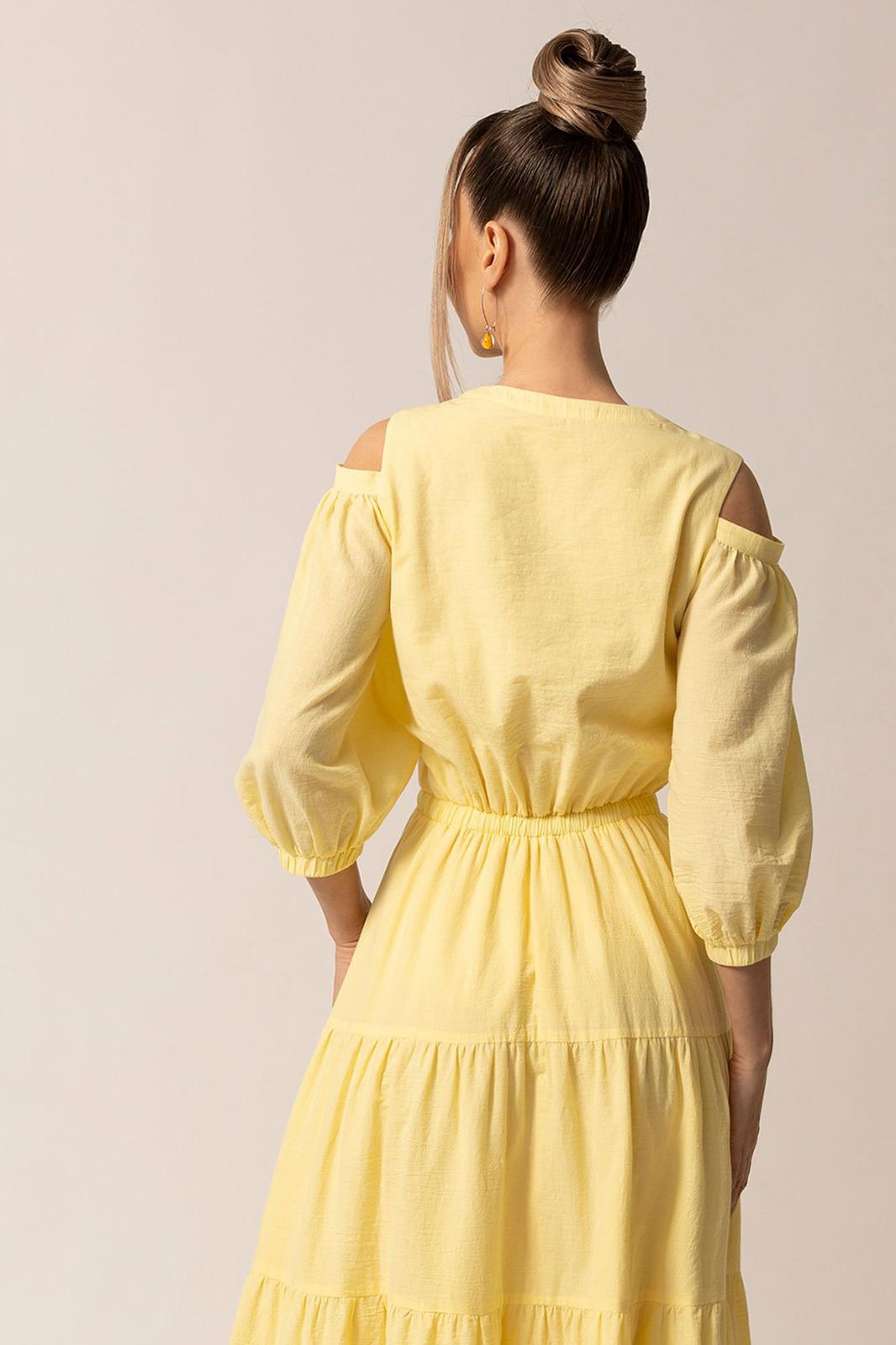 Платье, без застежки, с V-образным вырезом горловины, отрезной планкой горловины. Платье отрезное по линии талии, шов по талии присборен на резинку. Лиф переда со средним швом. Нижняя часть платья с воланами. Рукав втачной, 3/4, с открытым плечом , отрезной планкой по верху, манжетой, присборенной на резинку. Верх и низ рукава присборен. Платье на подкладке.