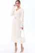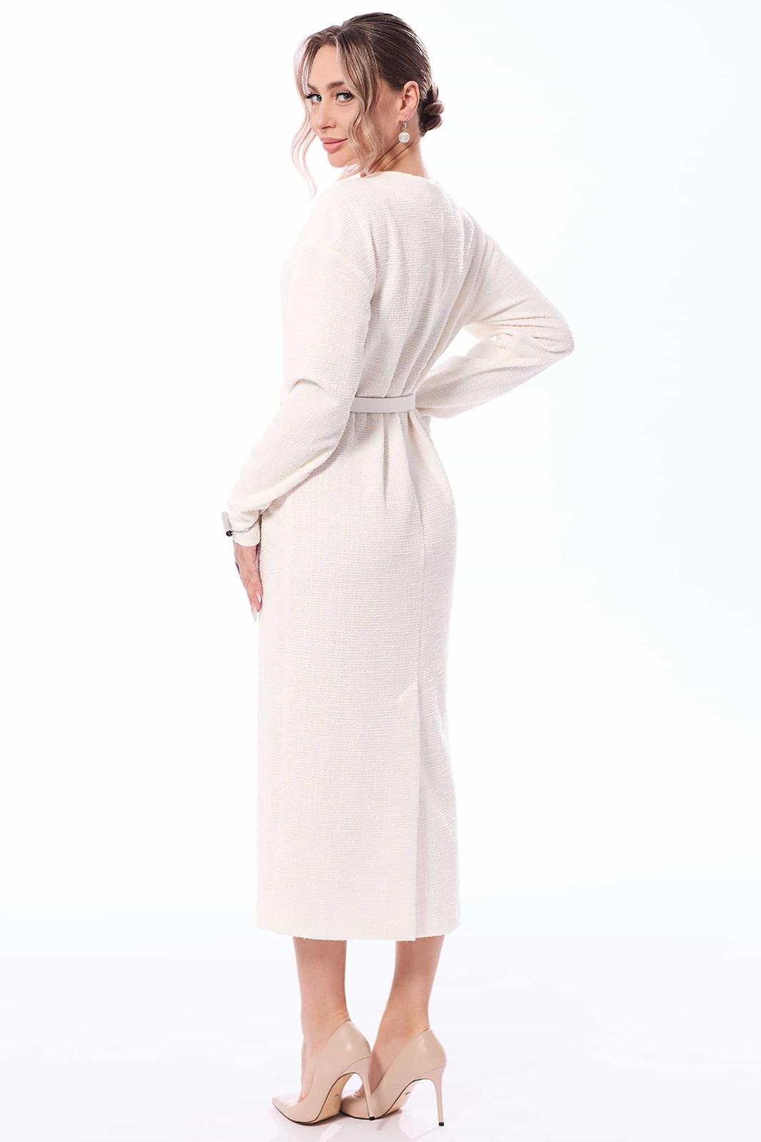 Платье без застежки, без воротника, с V-образным вырезом горловины. Перед цельный, спинка со средним швом, заканчивающимся шлицей. Рукав втачной, длинный. Платье со съемным поясом из кожезаменителя.