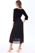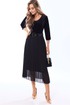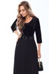 Платье полуприлегающего силуэта, с застежкой на потайную молнию в левом боковом шве, без воротника, с круглым вырезом горловины, отрезное по линии талии . Шов по талии присборен на резинку. Лиф переда с нагрудными и талиевыми вытачками. Спинка с талиевыми вытачками. Нижняя часть переда расклешенная к низу, с гофрировкой. Рукав втачной, длинный. Платье с декоративным поясом. По боковым швам расположены шлевки для пояса. Верхняя часть платья из бархата, нижняя часть- из шифона.