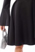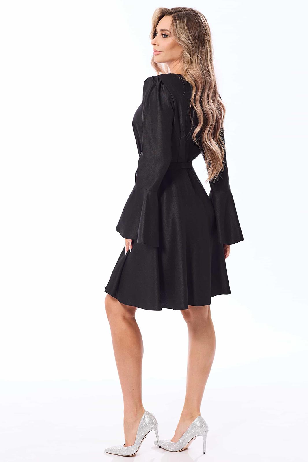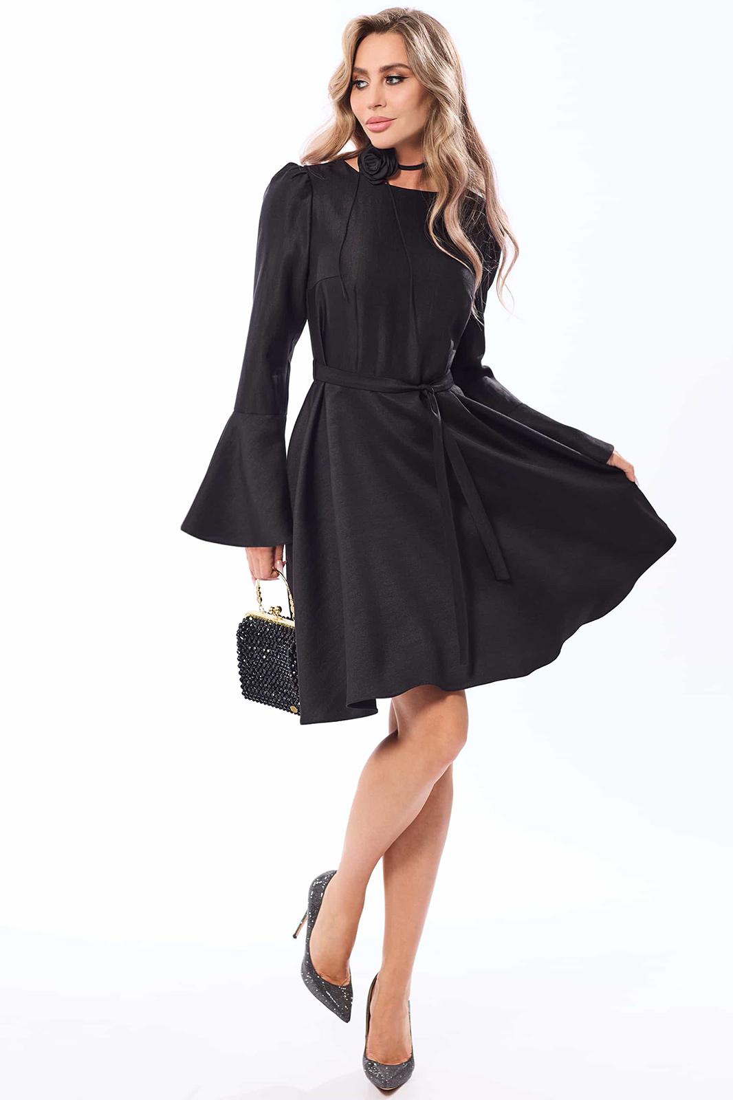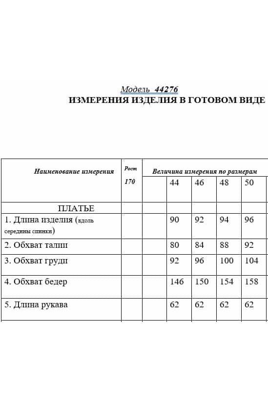 Платье без воротника, с круглым вырезом горловины, застежкой на потайную молнию в среднем шве спинки. Платье отрезное по линии талии. Лиф переда с талиевыми и нагрудными вытачками. Нижняя часть платья расклешенная. Спинка со средним швом, талиевыми вытачками. Рукав втачной, длинный, с отрезной манжетой. Окат рукава со сборкой. Манжеты расширенные к низу. Платье со съемным поясом. На талии расположены шлевки для съемного пояса.