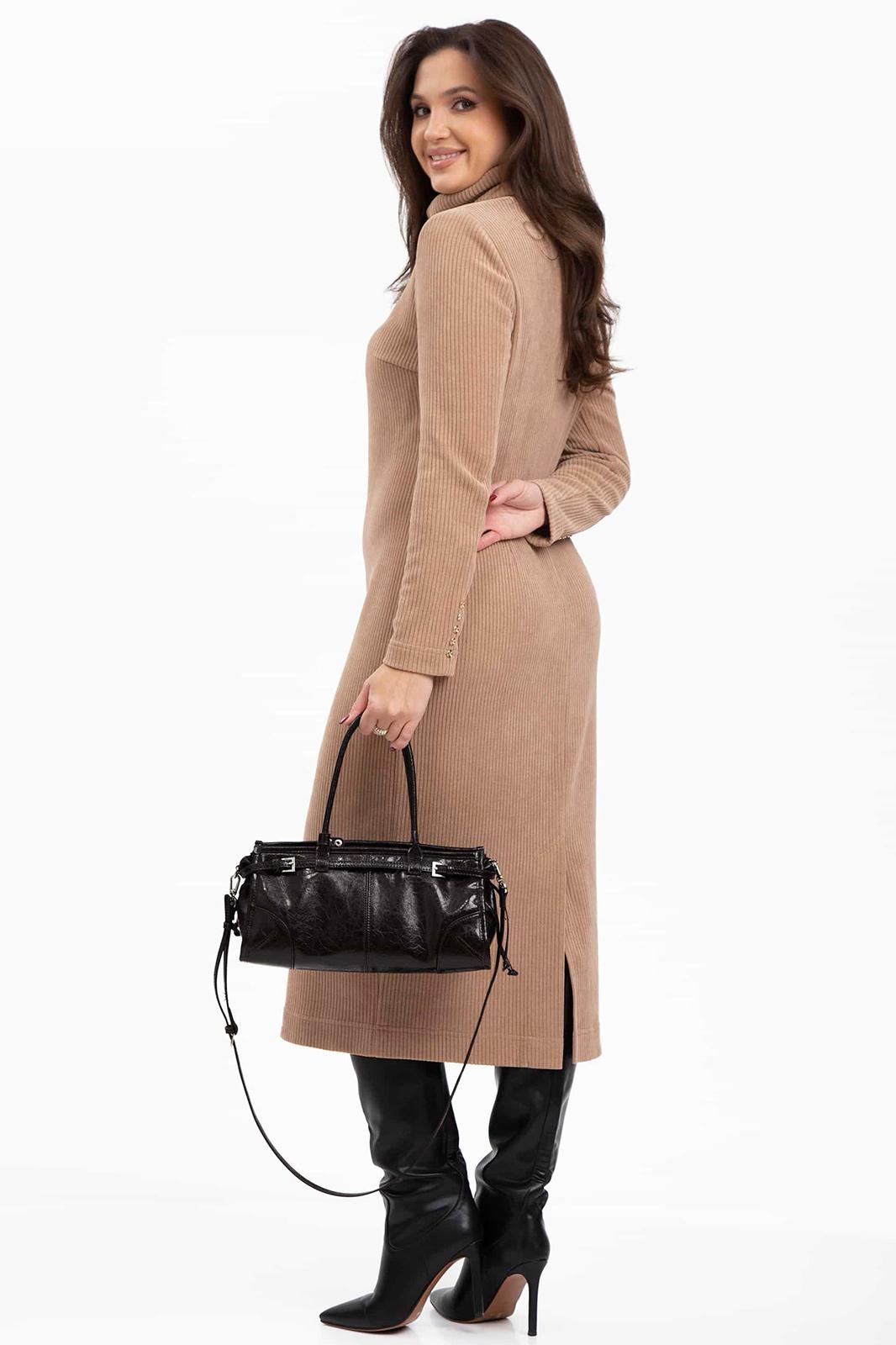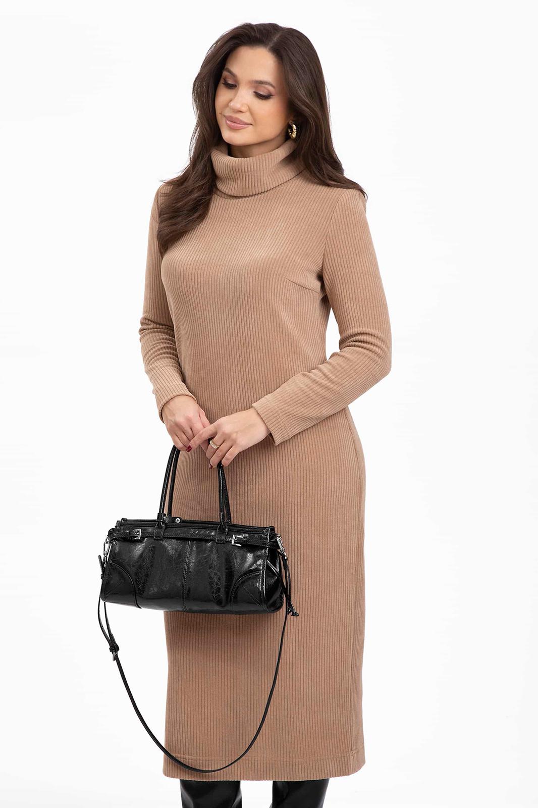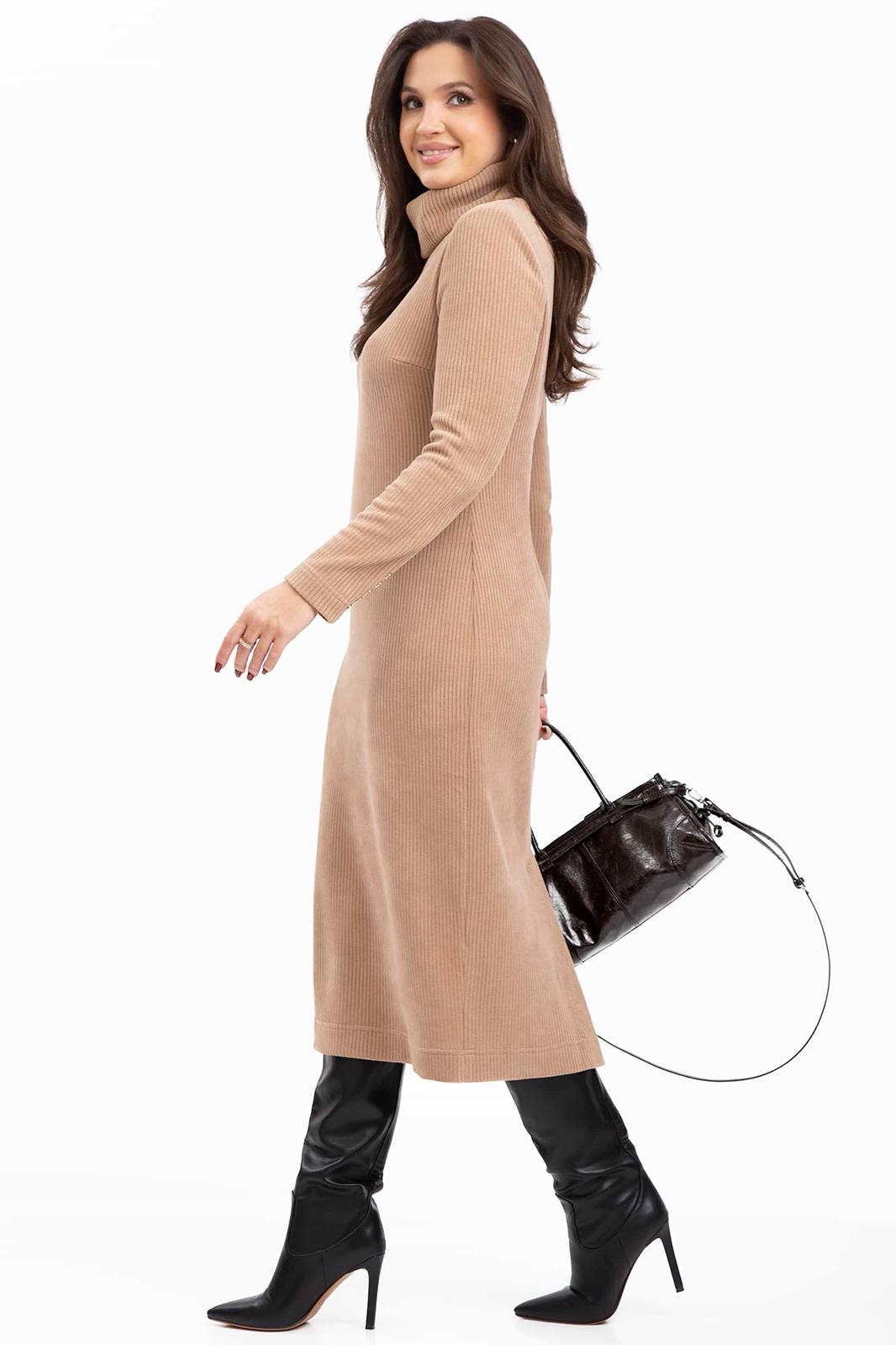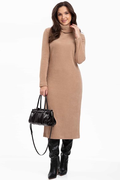 Платье без застежки, с отрезным воротником- хомут. Перед с нагрудными вытачками. Спинка с талиевыми вытачками, средним швом, заканчивающимся шлицей. Рукав втачной, длинный, двухшовный.