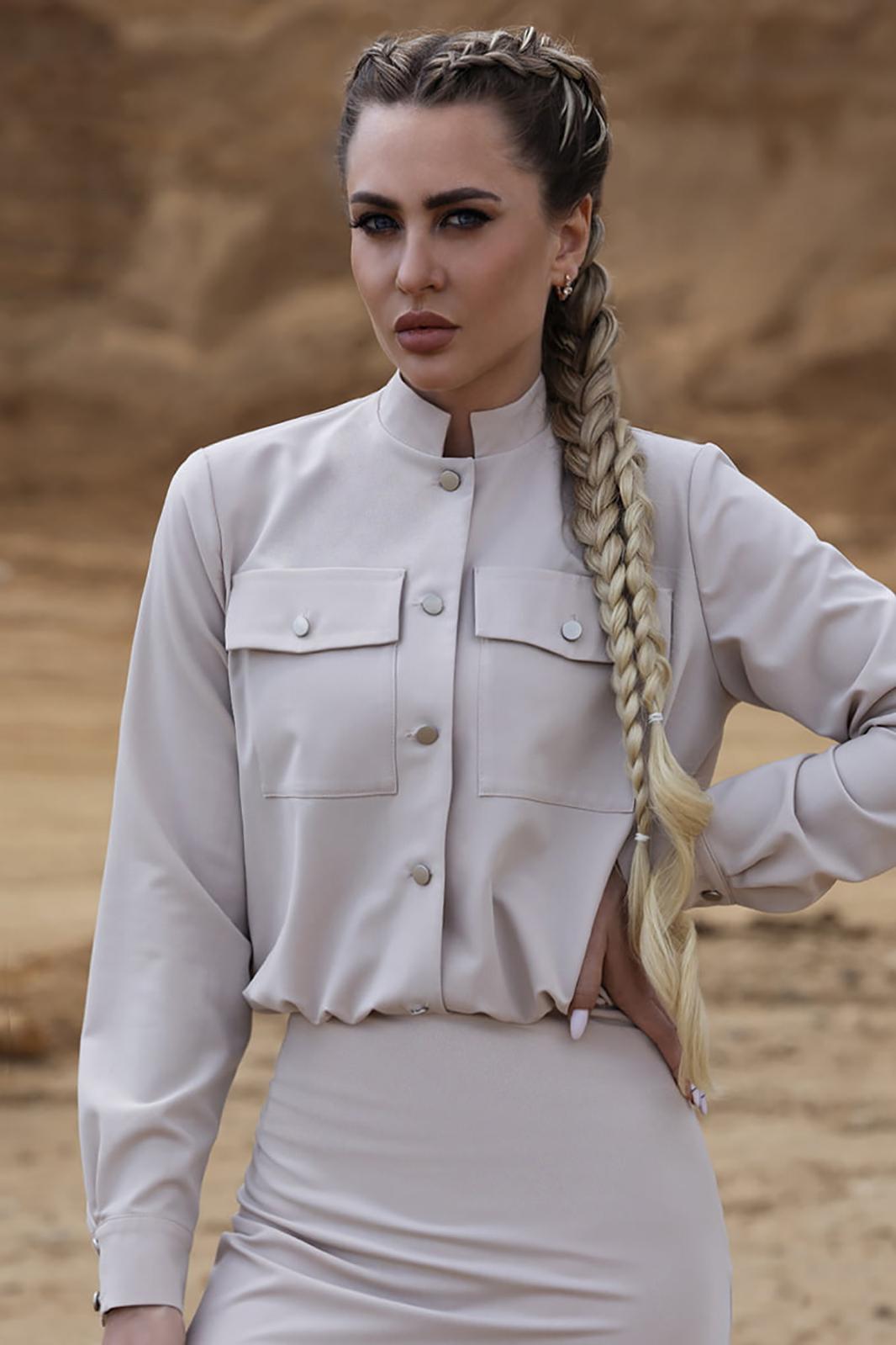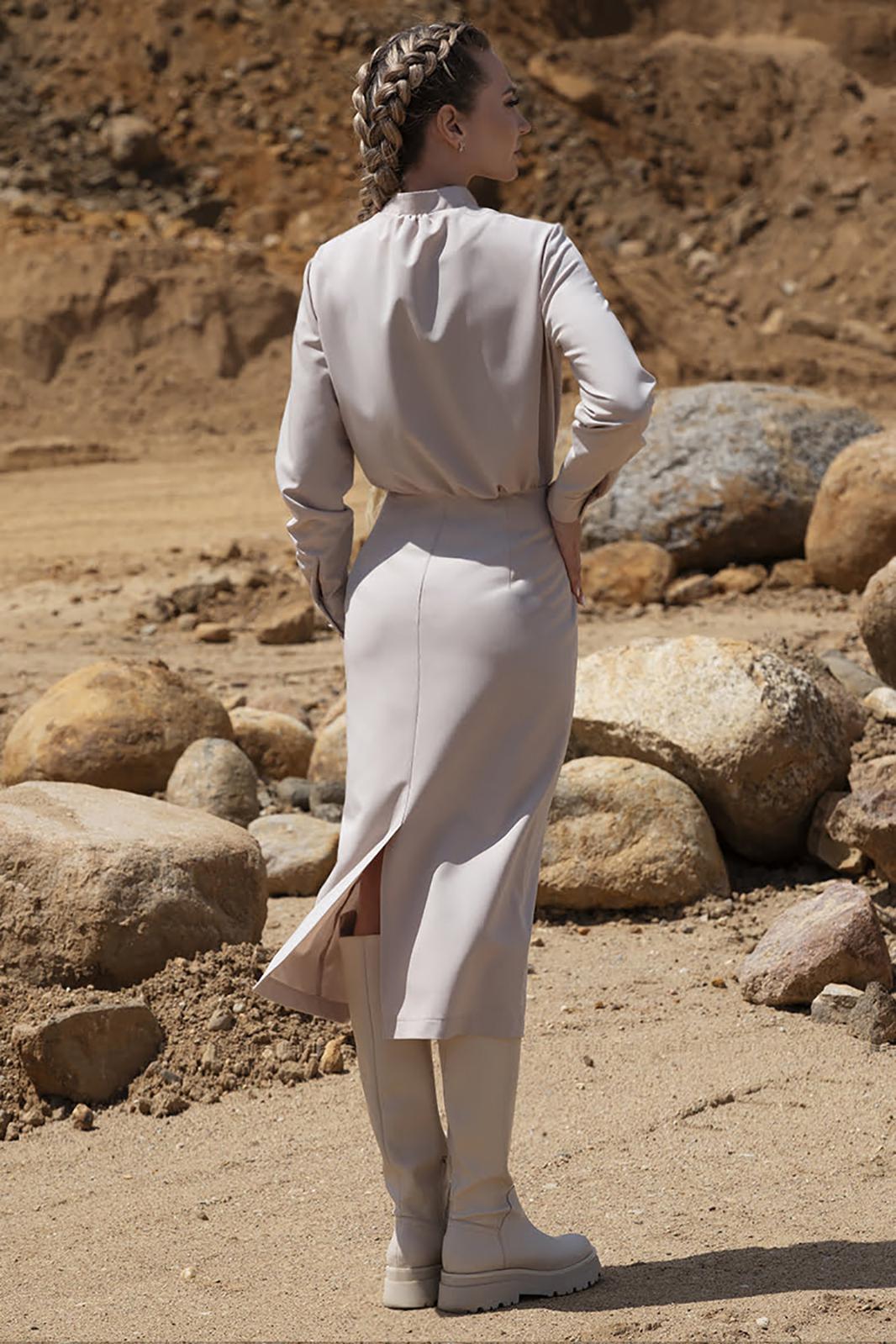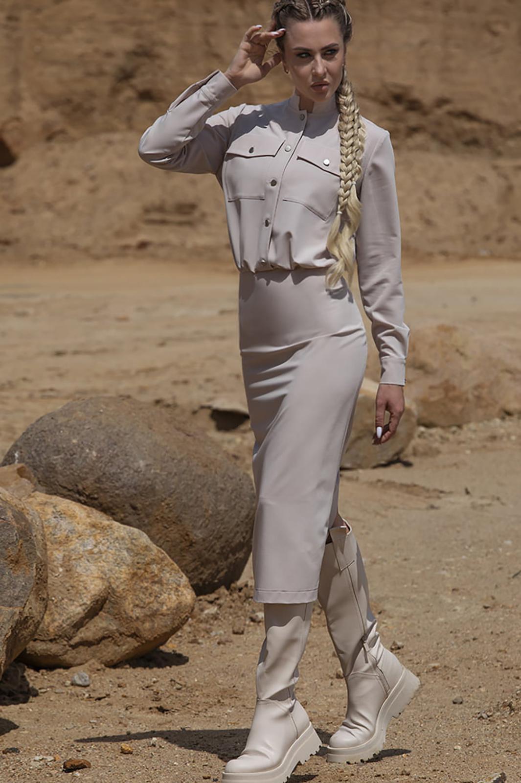 Платье с центральной застежкой на петли и пуговицы,с отрезной стойкой. Платье отрезное по линии талии. Верхняя часть переда с накладными карманами с клапанами. Верхняя часть спинки со сборкой по шву притачивания стойки. Нижняя часть спинки со средним швом, заканчивающимся шлицей. Шов по талии присборен. В левом боковом шве- застежка на потайную молнию. Рукав втачной, длинный, с отрезной манжетой.