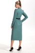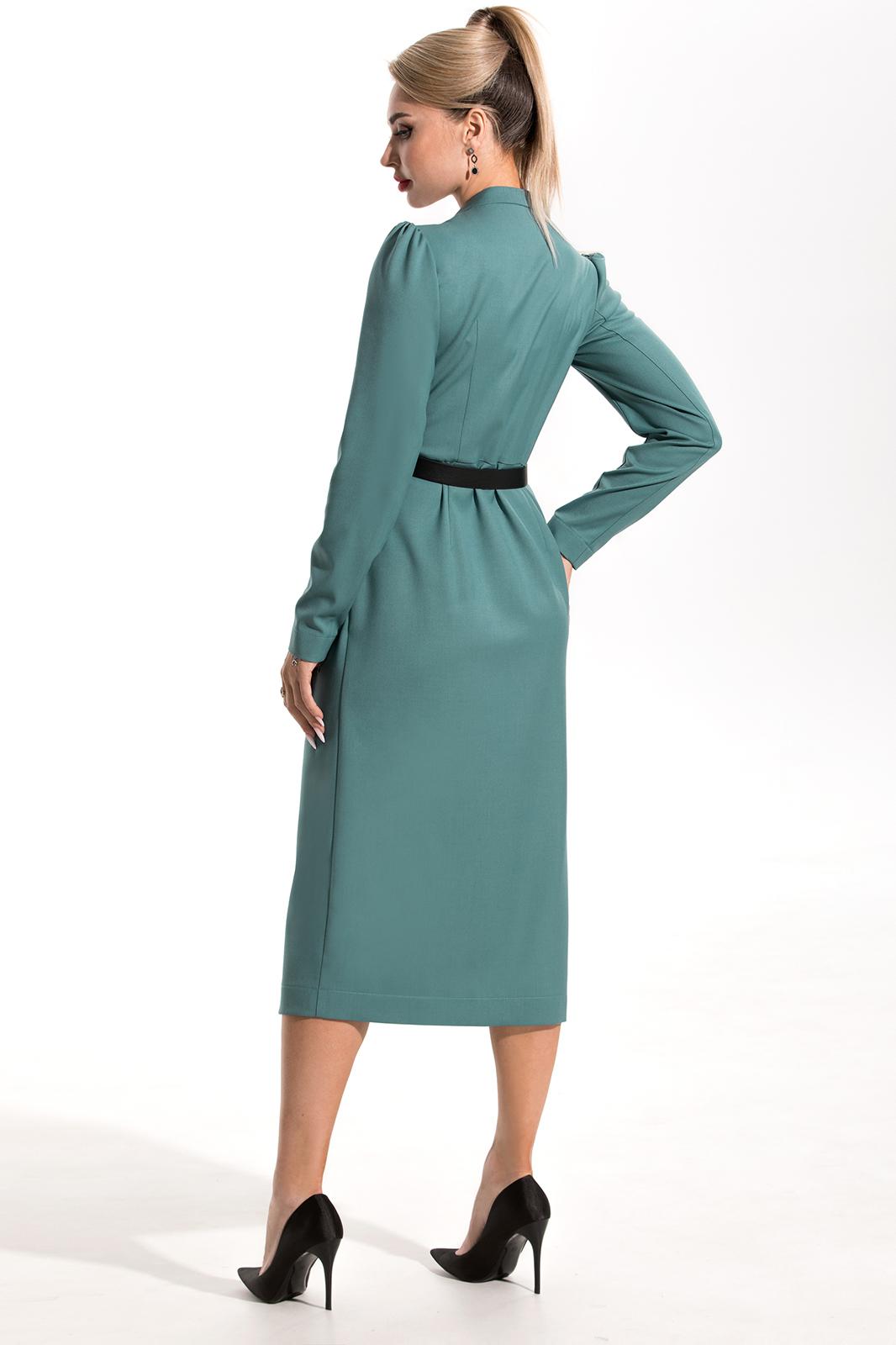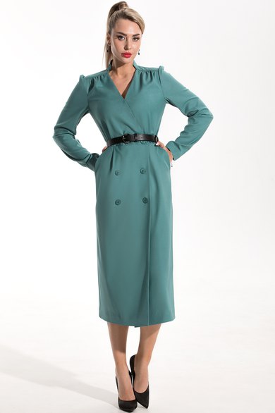 Платье, с центральной двубортной застежкой на петли и пуговицы, отрезной стойкой. Платье отрезное по линии талии, с небольшой сборкой по шву в области полочек. Верхние части полочек с отрезными кокетками. Полочки присборены по шву притачивания кокеток. Верхняя часть спинки с талиевыми вытачками. В боковых швах расположены карманы, вход в карман наклонный к боковому шву. Рукав втачной, длинный. Платье со съемным поясом.