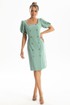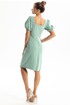 Платье с центральной двубортной застежкой на петли и пуговицы, без вортника, с квадратным вырезом горловины. По переду с рельефами, выходящими из горловины. По спинке с рельефами, выходящими из горловины. Рукав корткий, втачной, с отрезной манжетой. По шву притачивания манжеты рукав присборен.
