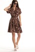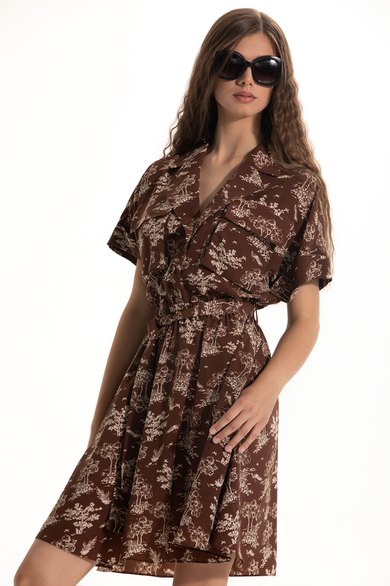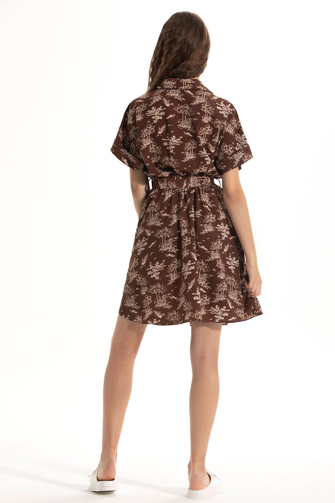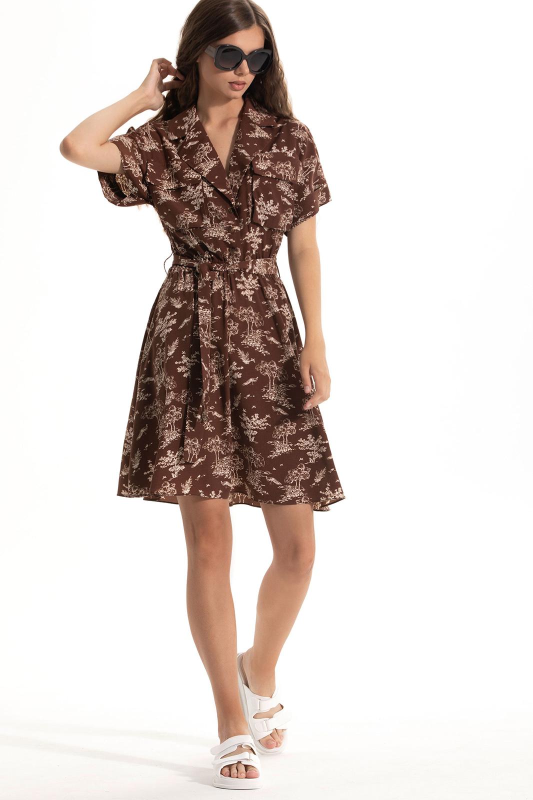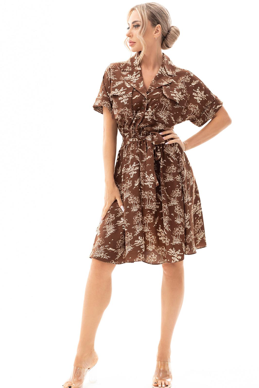 Платье, с центральной застежкой на петли и пуговицы, отложным воротником и лацканами. Платье отрезное по линии талии, с втачным поясом. Втачной пояс присборен на резинку. По переду и спинке фигурные рельефные швы. На верхней части переда- накладные карманы с клапанами. Рукав короткий, цельнокроенный, с отрезной манжетой. Платье со съемным поясом. Платье без подкладки.