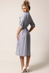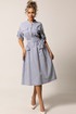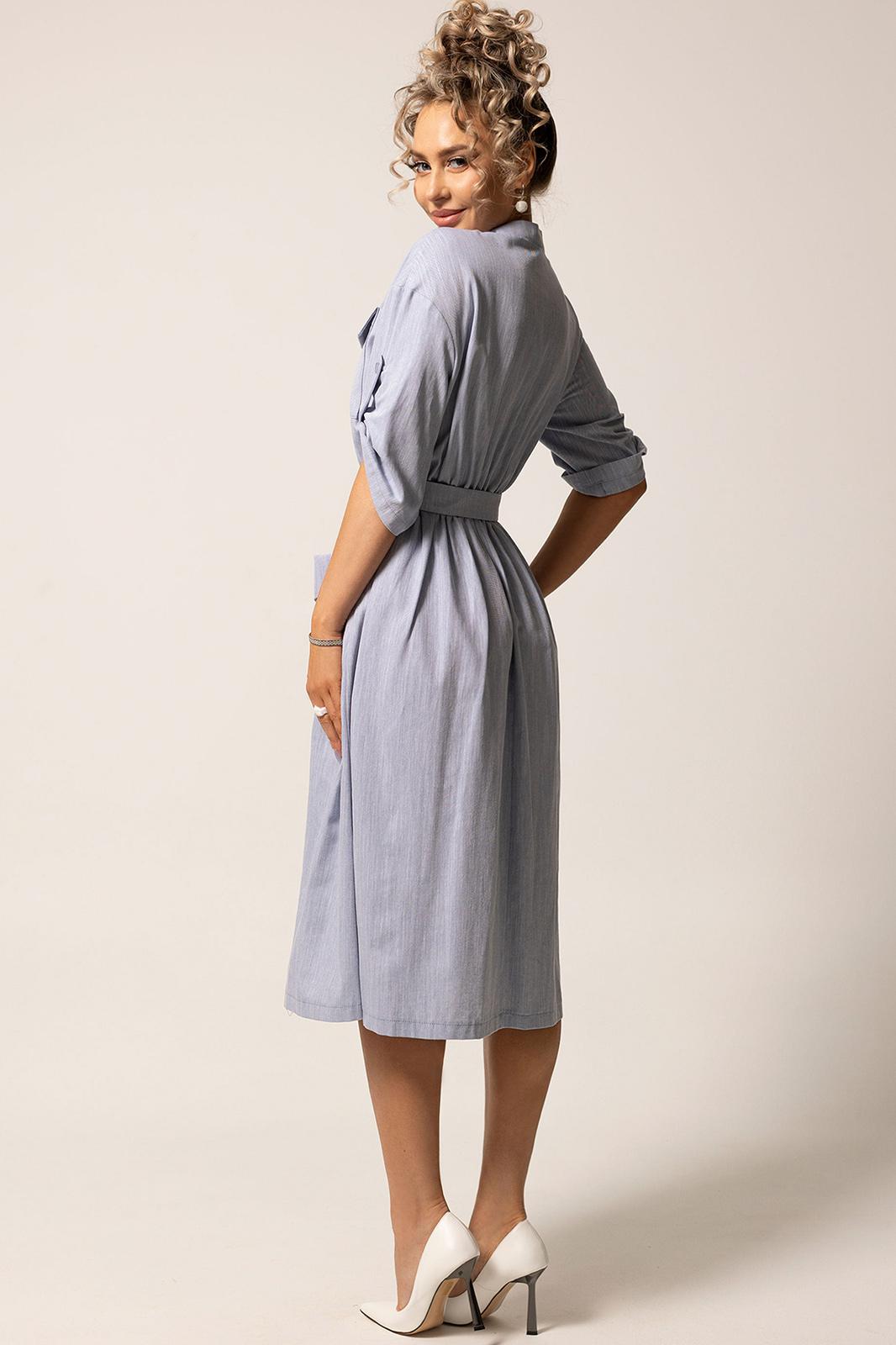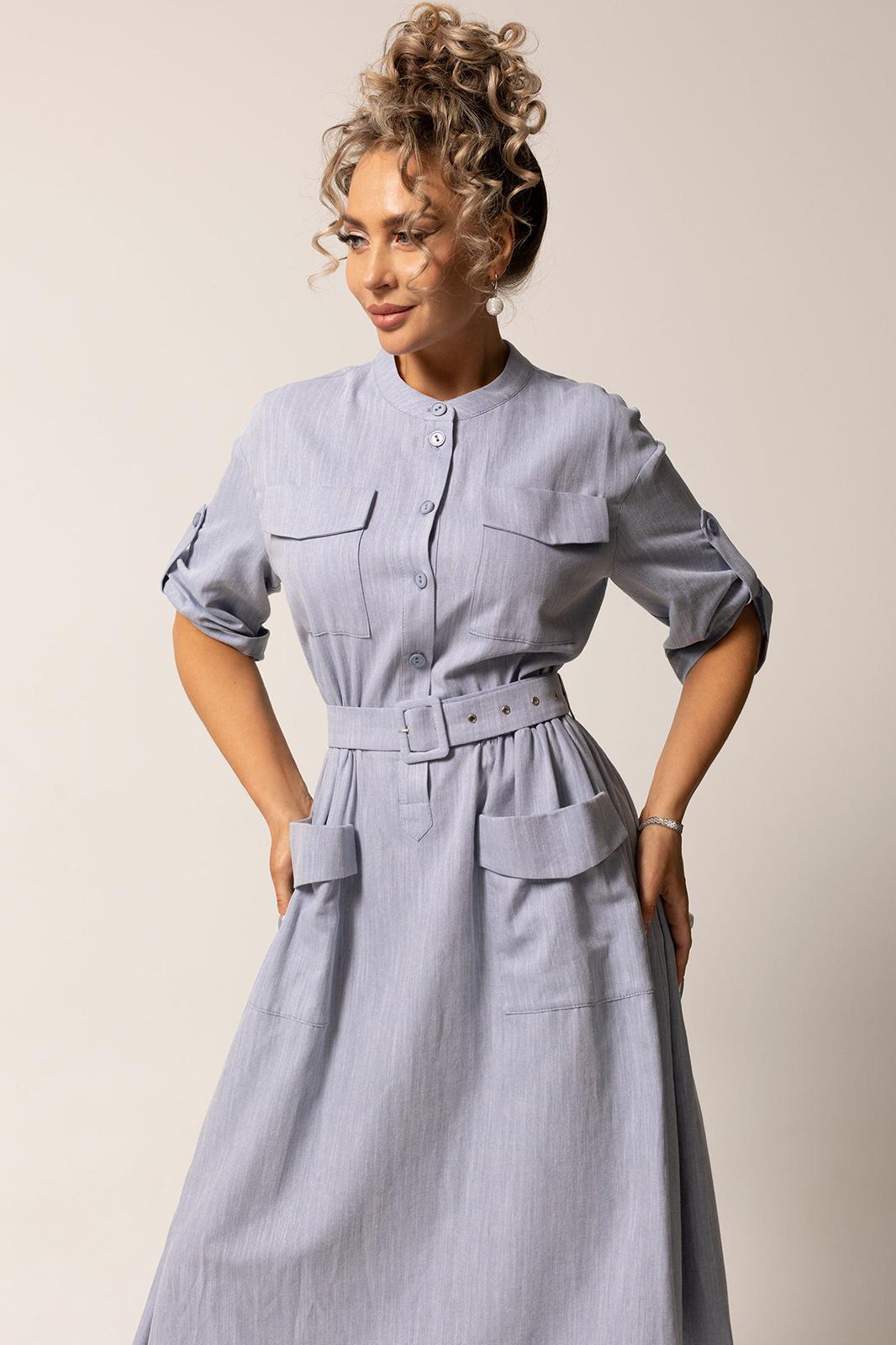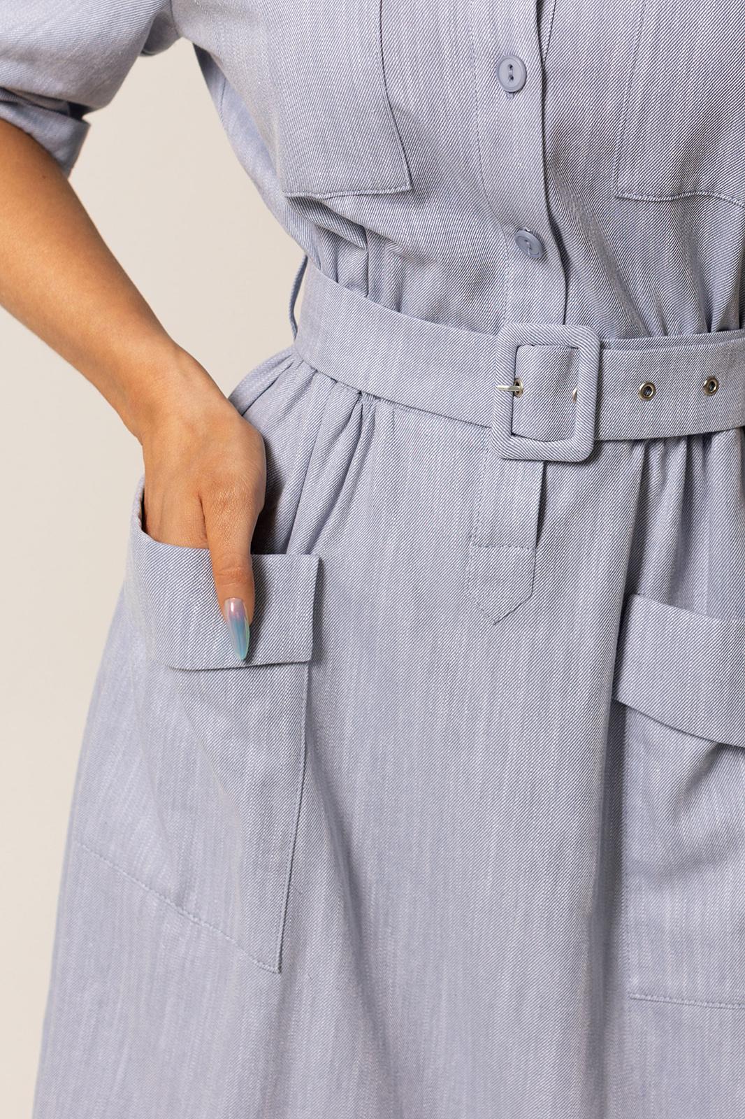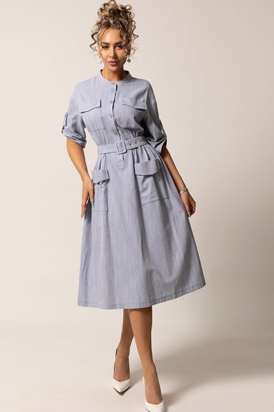 Платье с центральной застежкой на петли и пуговицы, с отрезным воротником- стойкой. Платье отрезное по линии талии. Шов по талии присборен на резинку. По верхней и нижней части переда накладные карманы с клапаном. Плечо спущенное. Рукав втачной, 3/4. Отворот по низу рукава фиксируется патой с петлей и пуговицей. Платье со съемным поясом.