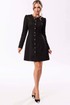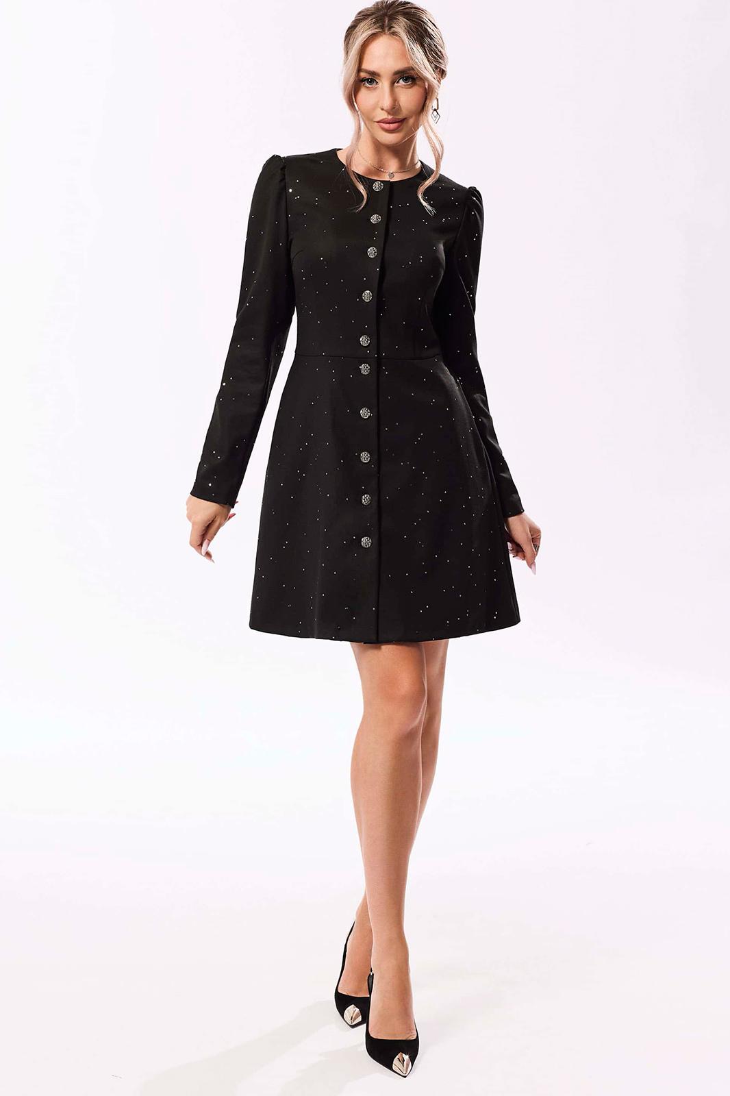 Платье без воротника, с центральной застежкой на петли и пуговицы, с круглым вырезом горловины. Платье отрезное по линии талии. Верхняя часть переда с нагрудными и талиевыми вытачками. Верхняя часть спинки со средним швом, талиевыми вытачками. Нижняя часть платья расклешенная. В боковых швах расположены карманы. Рукав втачной, длинный. По окату рукав присборен. Платье на подкладке.