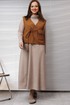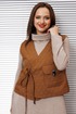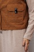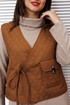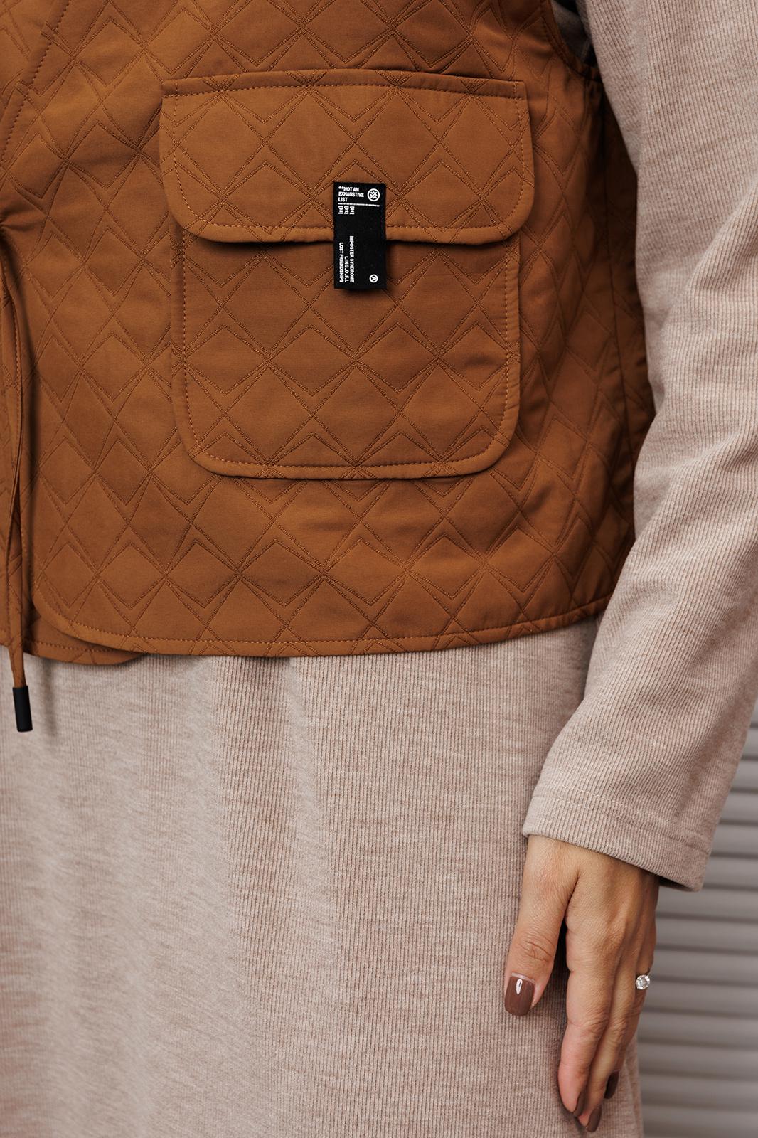 Жилет свободного силуэта из тонкой стежки на подкладке. Изделие двубортное на завязке, по полочке накладной карман с клапаном.