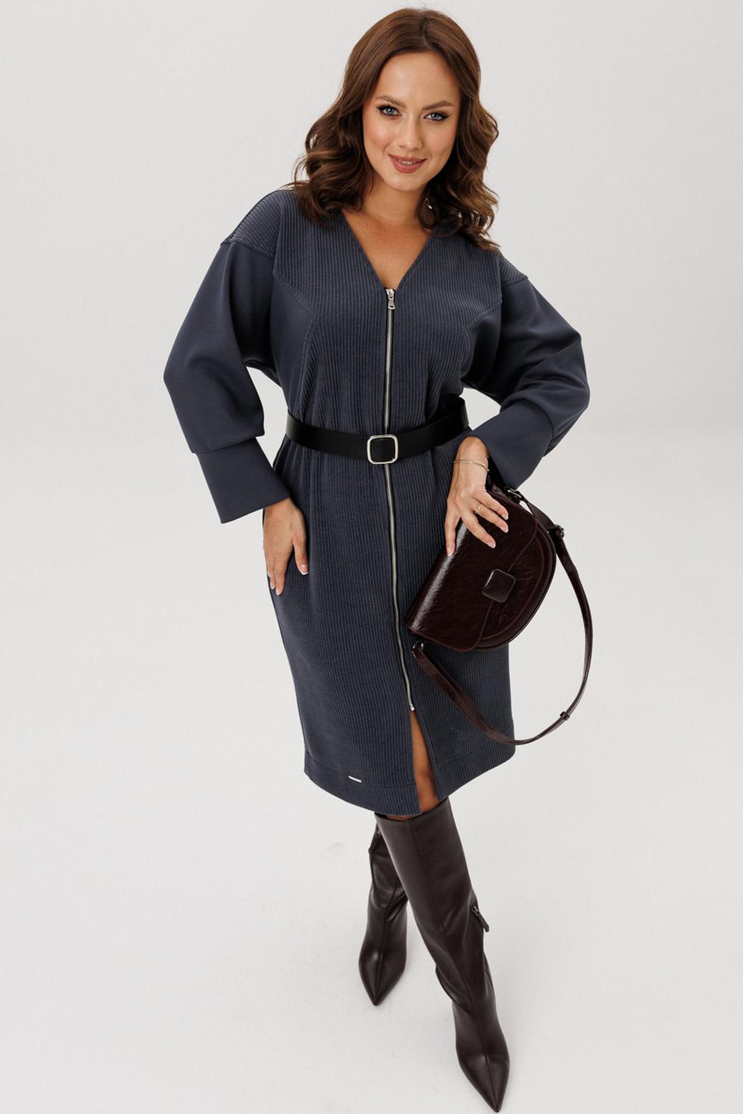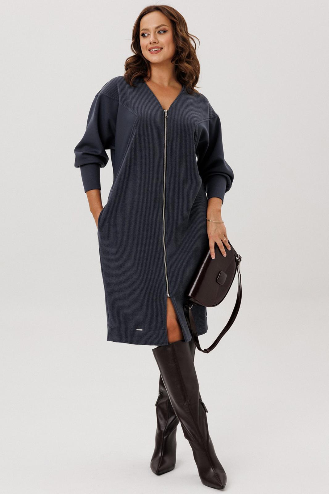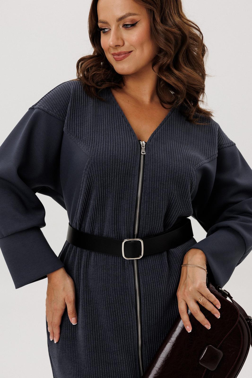 Платье полуприлегающего силуэта, вырез горловины V – образный, рукав цельнокроеный спущенный со вставками из кожи и на манжете внизу. По спинке кокетка, в боковых швах функциональные карманы. Застежка на тесьму-молнию. В комплекте ремень из экокожи.