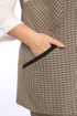 Костюм брючный 3-х предметный изготовлен из костюмной ткани состоит из жилетки, брюк и блузки. Жилетка с V-образным вырезом, застежка центрально-бортовая на три петли и пуговицы. Перед с подрезными боковыми деталями, в которых расположены карманы и отделочные элементы. Спинка с двумя рельефами, в которых обработаны шлицы. Жилетка по пройме и карманам дополнена планками из отделочной ткани. Жилетка на подкладке. Брюки средней посадки, пояс по боковым швам частично на резинке. По передним деталям брюк обработаны карманы. Блузка комбинированная, изготовлена из шифона и вискозного полотна по спинке. Горловина круглой формы, по переду сборка обработана окантовкой. Рукав втачной длиной ¾. Длина жилета по спинке – 75 см. Длина брюк по боковому шву – 103 см. Длина блузки по спинке – 65 см, рукава — 48 см.