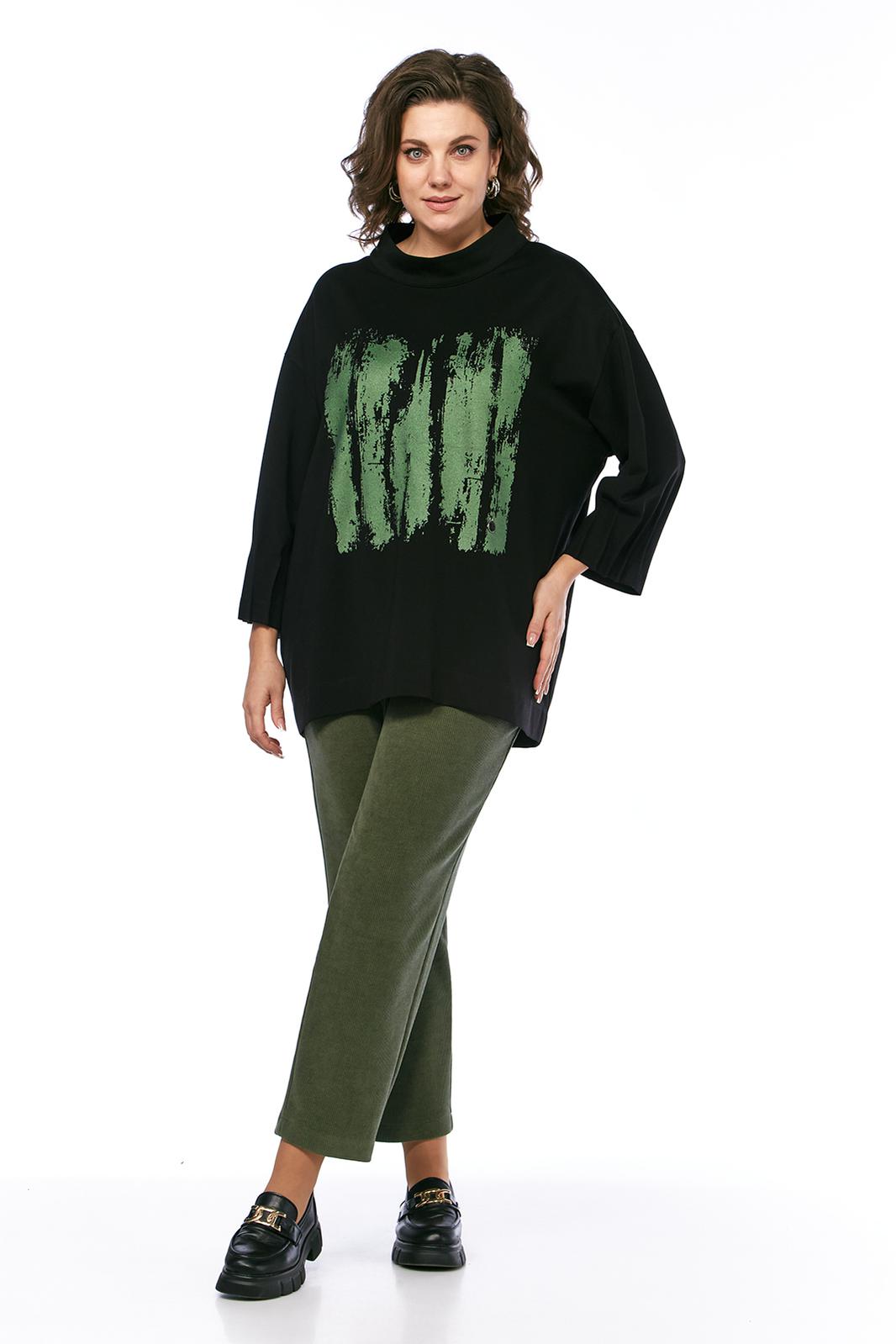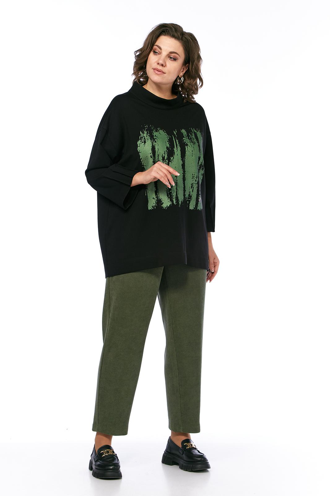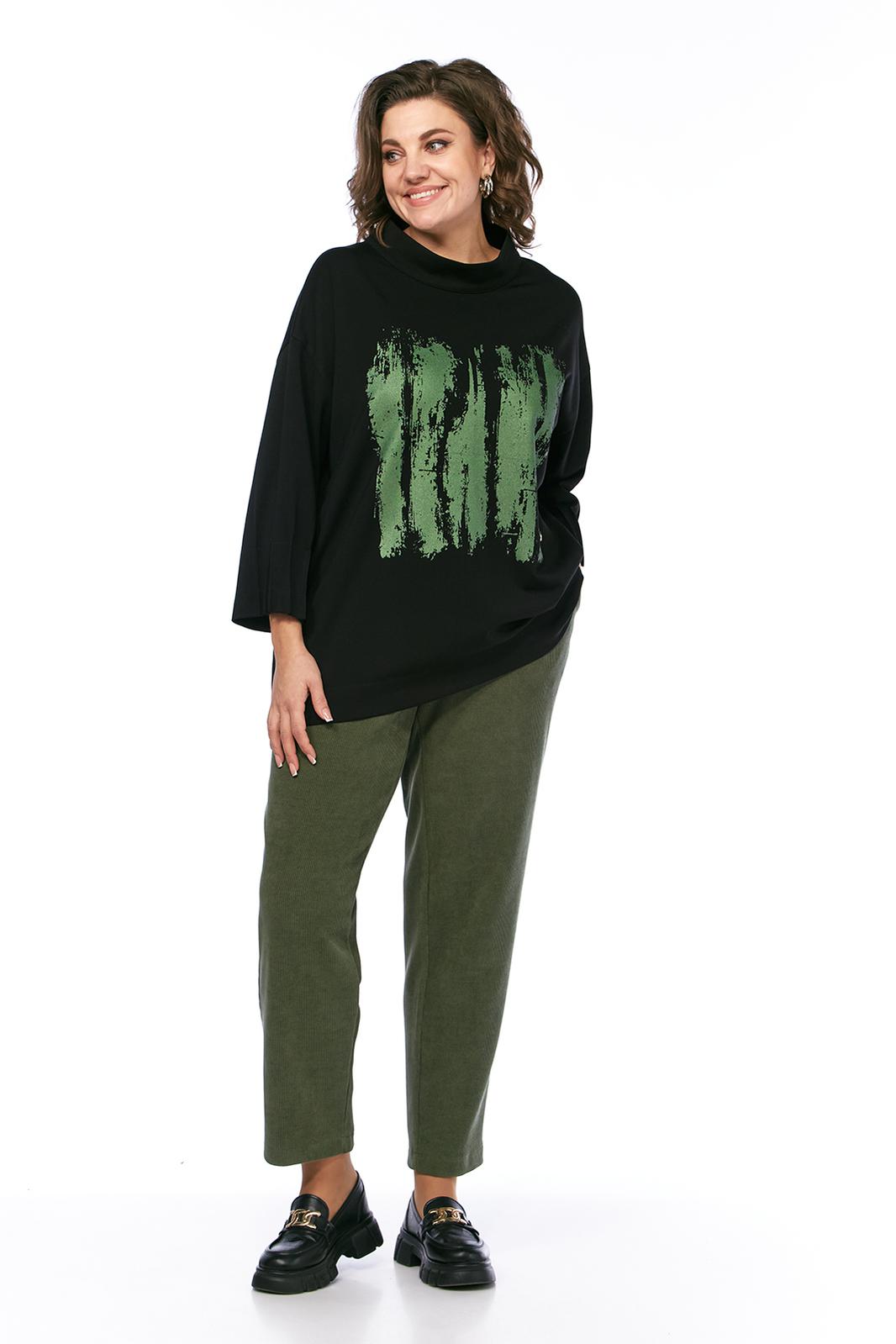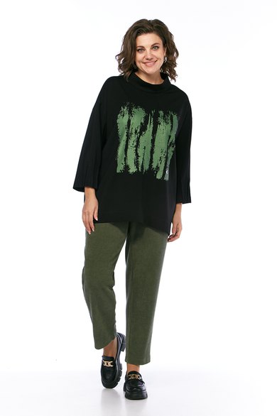 Комплект брючный двухпредметный, состоит из джемпера и брюк. Джемпер свободного силуэта, выполнен из трикотажного полотна. Горловина обработана воротником-стойка. Перед и спинка цельнокроеные. Рукава спущенные с защипами. Джемпер дополнен дизайнерской печатью. Брюки средней посадки, выполнены из вельветовой ткани. Заужены к низу. Пояс притачной со вставками с эластичной тесьмой. Застежка на молнию и петлю с пуговицей. В передних деталях брюк карманы с подрезным бочком.