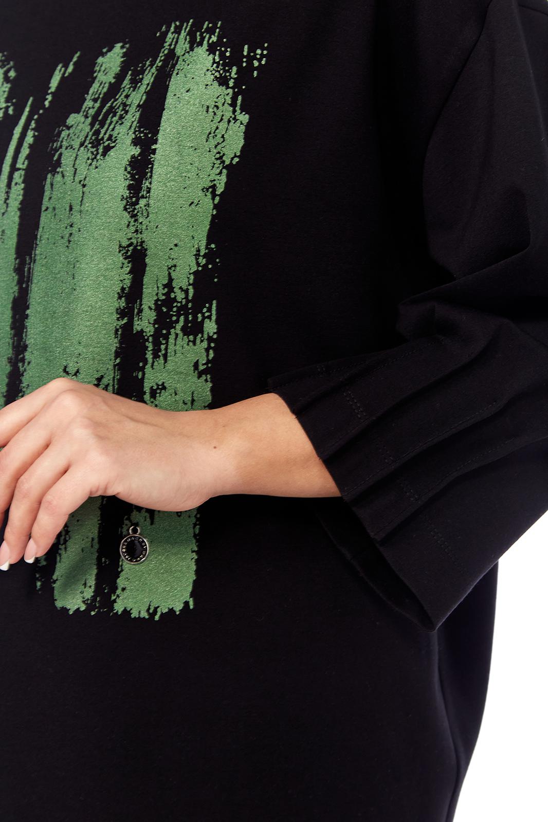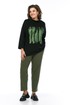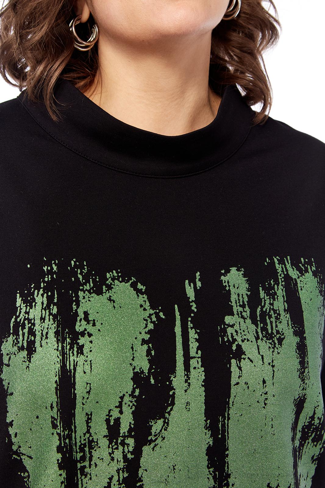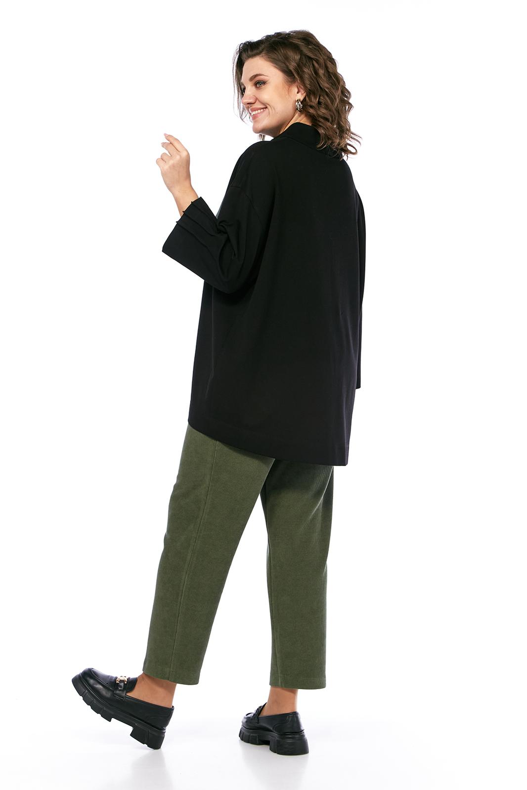 Комплект брючный двухпредметный, состоит из джемпера и брюк. Джемпер свободного силуэта, выполнен из трикотажного полотна. Горловина обработана воротником-стойка. Перед и спинка цельнокроеные. Рукава спущенные с защипами. Джемпер дополнен дизайнерской печатью. Брюки средней посадки, выполнены из вельветовой ткани. Заужены к низу. Пояс притачной со вставками с эластичной тесьмой. Застежка на молнию и петлю с пуговицей. В передних деталях брюк карманы с подрезным бочком.