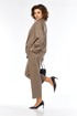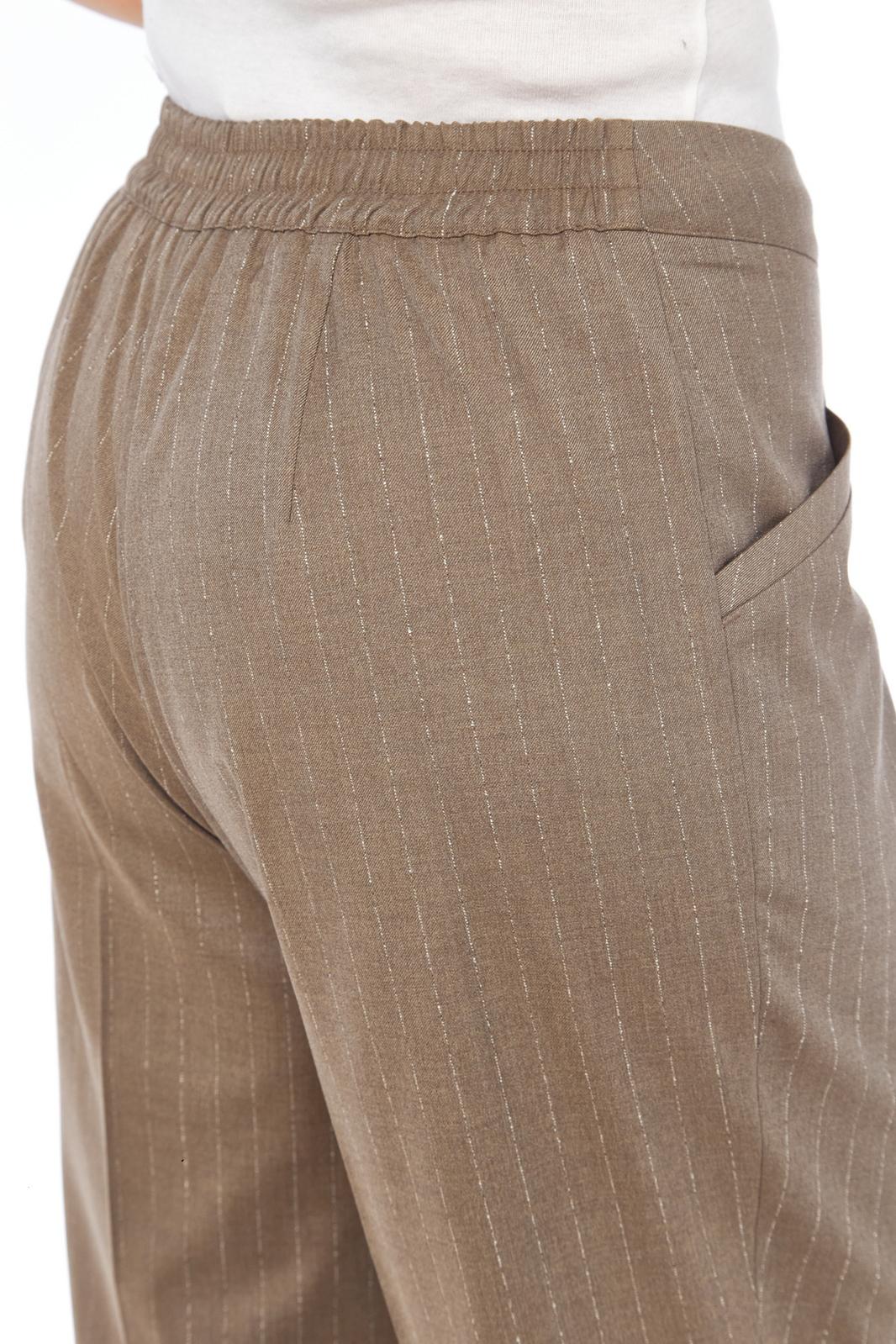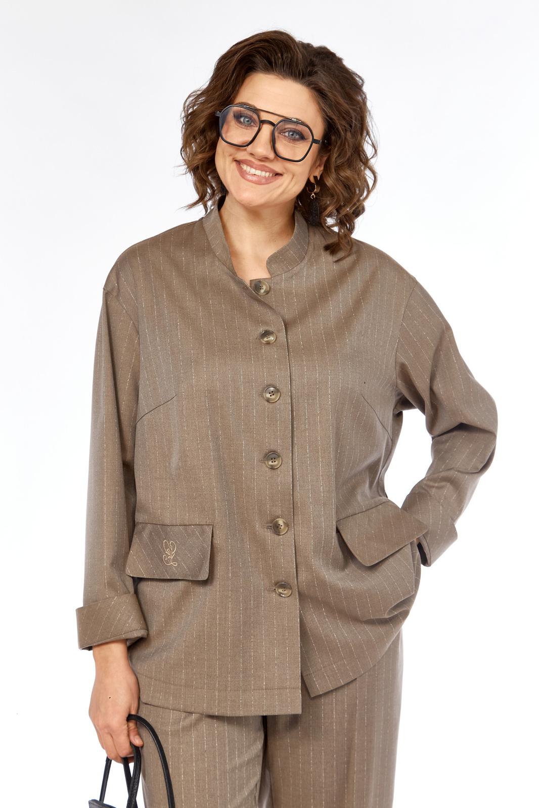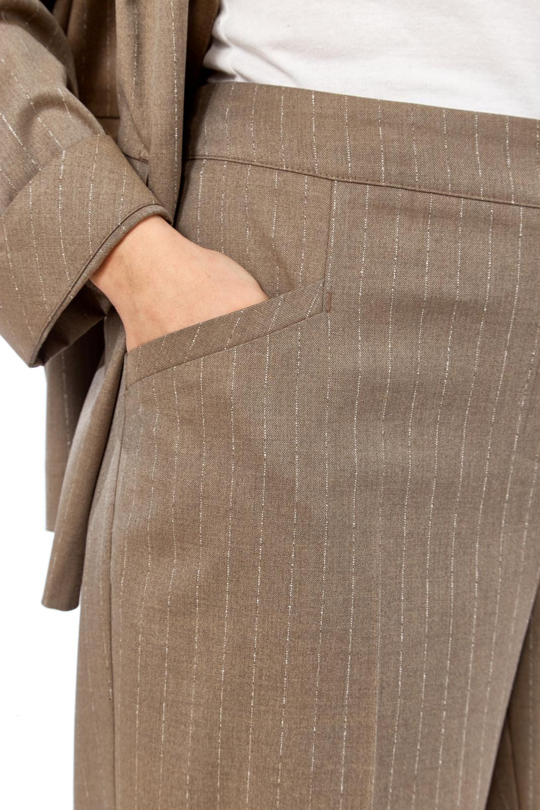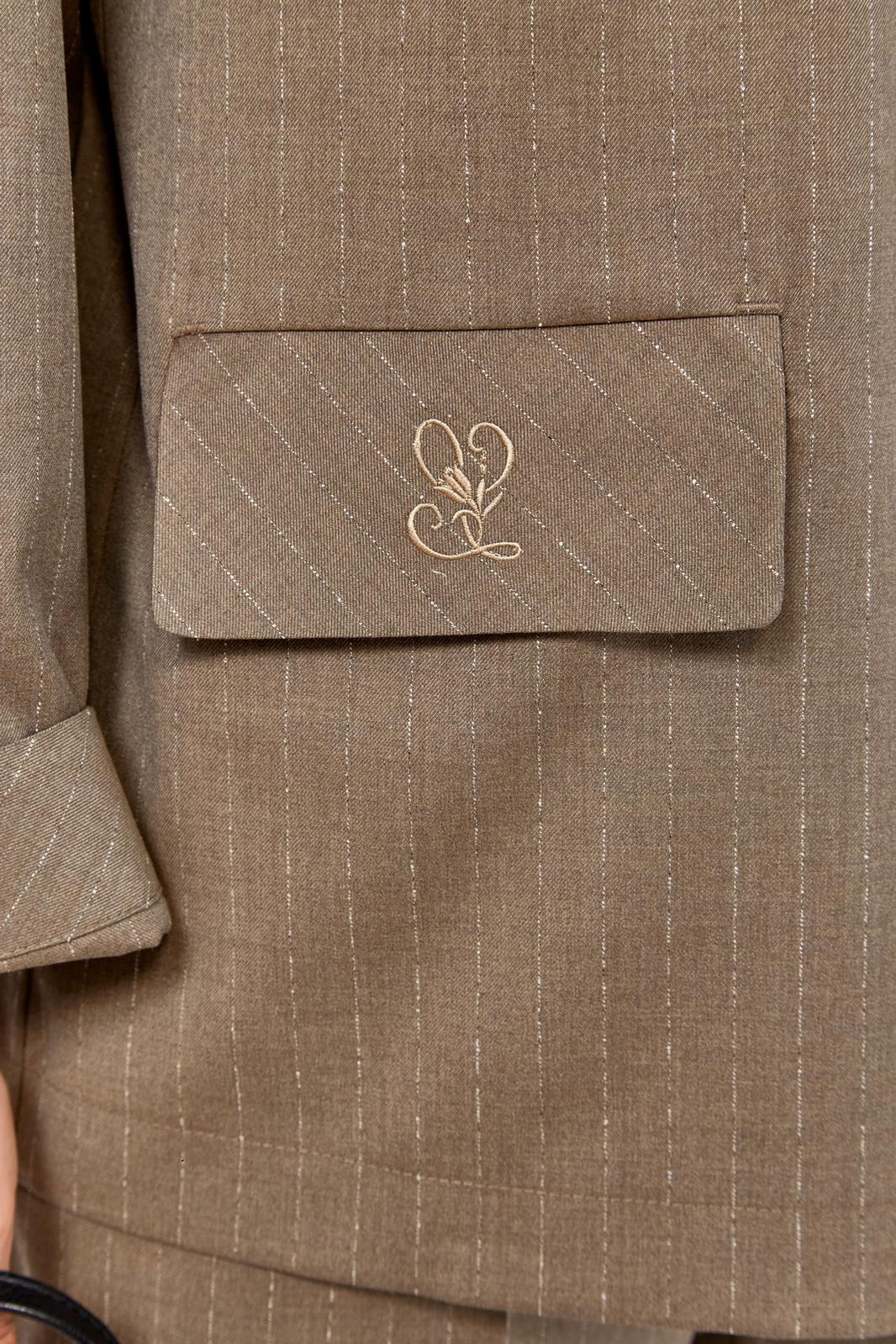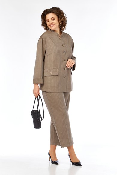 Костюм женский двухпредметный, состоит из жакета и брюк, выполнен из костюмной ткани в полоску. Жакет прямого силуэта. Горловина обработана воротником-стойкой, застежка центрально-бортовая на петли и пуговицы. По переду обработаны нагрудные вытачки и прорезные карманы с клапаном. Спинка с притачной кокеткой. Рукава длинные, линия плеча немного спущена. Брюки свободного силуэта с притачным поясом, частично на эластичной тесьме и застежкой на петлю и пуговицу. По передним деталям брюк обработаны карманы с планкой. Костюм дополнен дизайнерской вышивкой на клапане жакета.