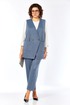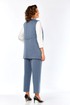 Костюм брючный 3х — предметный, состоит из жилета, лонгслива и брюк. Жилет и брюки выполнены из костюмной ткани, лонгслив из трикотажного вискозного полотна. Жилет прямого силуэта с двубортной застежкой на петлю и пуговицу. Горловина V-образной формы. По переду обработаны накладные карманы, в рельефах декоративные элементы с молниями. Спинка с фигурной кокеткой. Брюки свободного силуэта, с притачным поясом и вставками эластичной тесьмы. Застежка на петлю и пуговицу. В передних деталях брюк обработаны карманы с подрезным бочком. Лонгслив прямого силуэта, перед и спинка цельнокроеные, рукава втачные. Горловина обработана бейкой.
