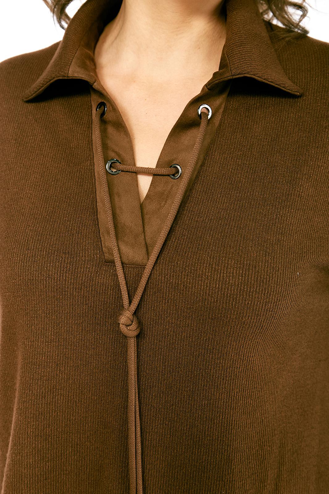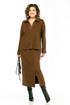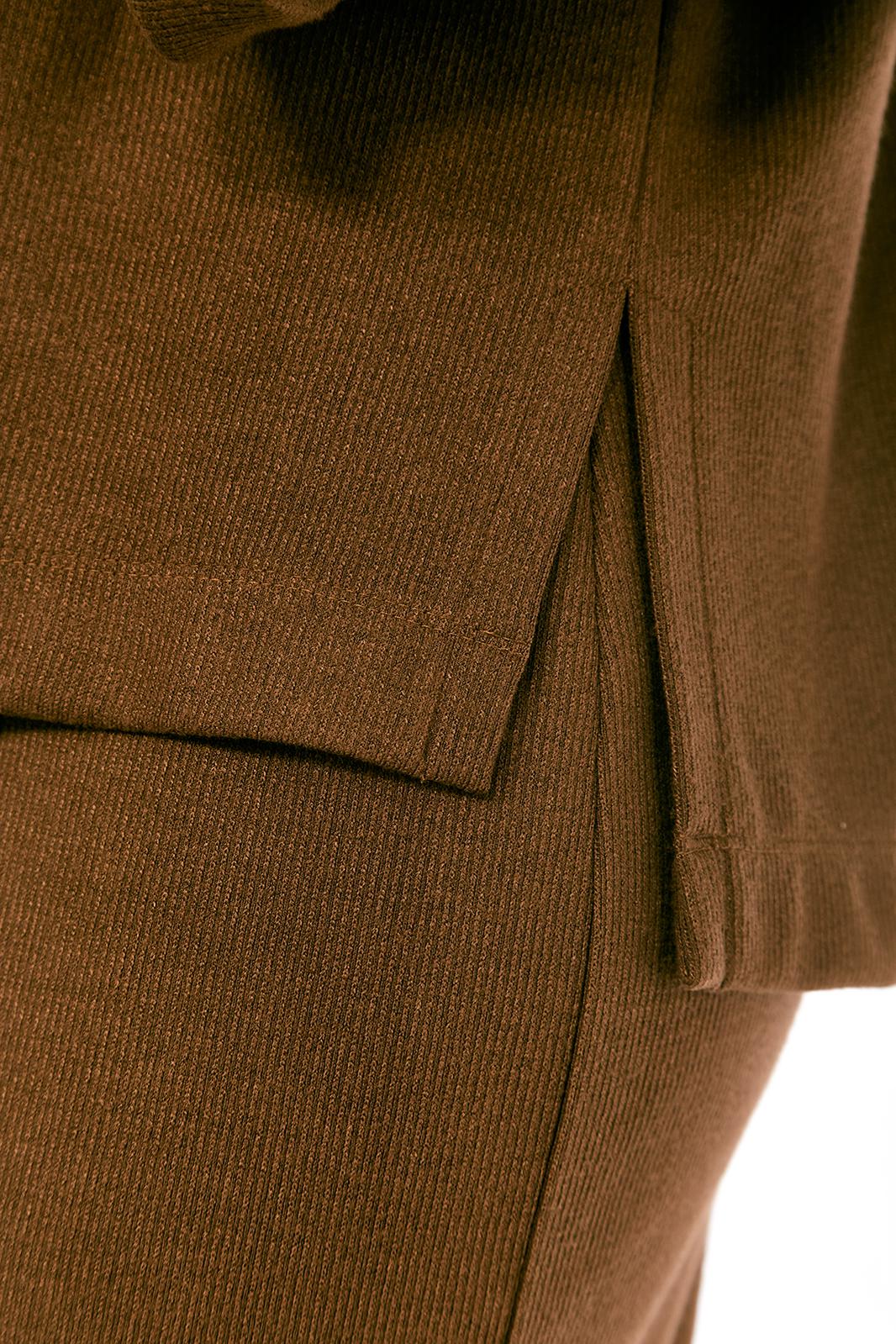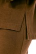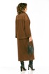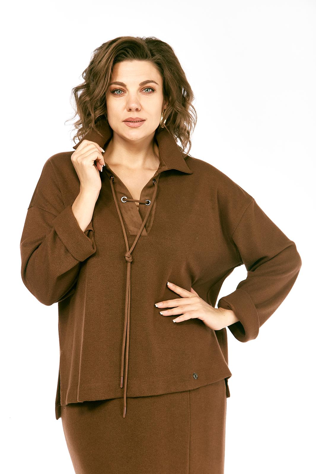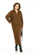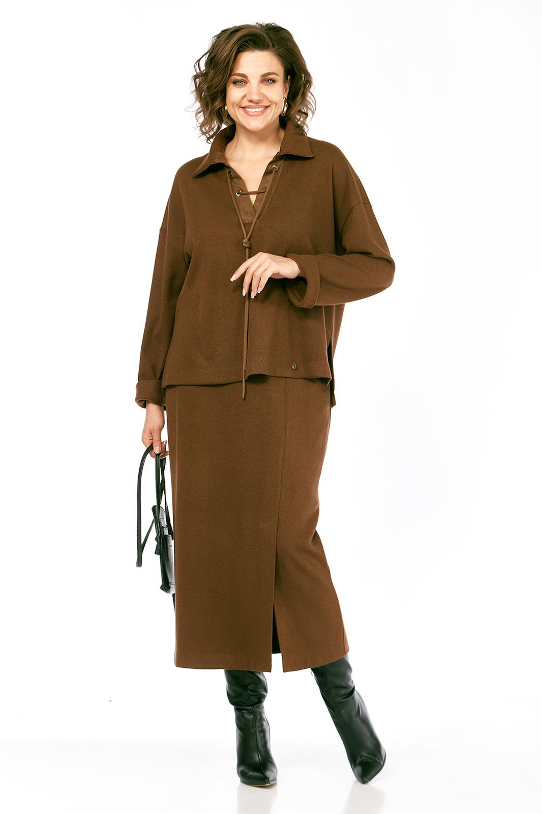 Костюм женский, юбочный, изготовлен из трикотажного полотна, состоит из джемпера и юбки. Джемпер свободного кроя. Горловина оформлена отложным воротником на стойке и планками, декорированными люверсами, с протянутым в них шнуром. Рукава спущенные, длинные. Низ изделия разной длины, в боковых швах разрезы. Кокетка спинки, планки и воротник джемпера выполнены из отделочной ткани. Юбка с цельнокроенным поясом на резинке. На передней части шов, внизу обработана шлица. Юбка на подкладке.