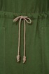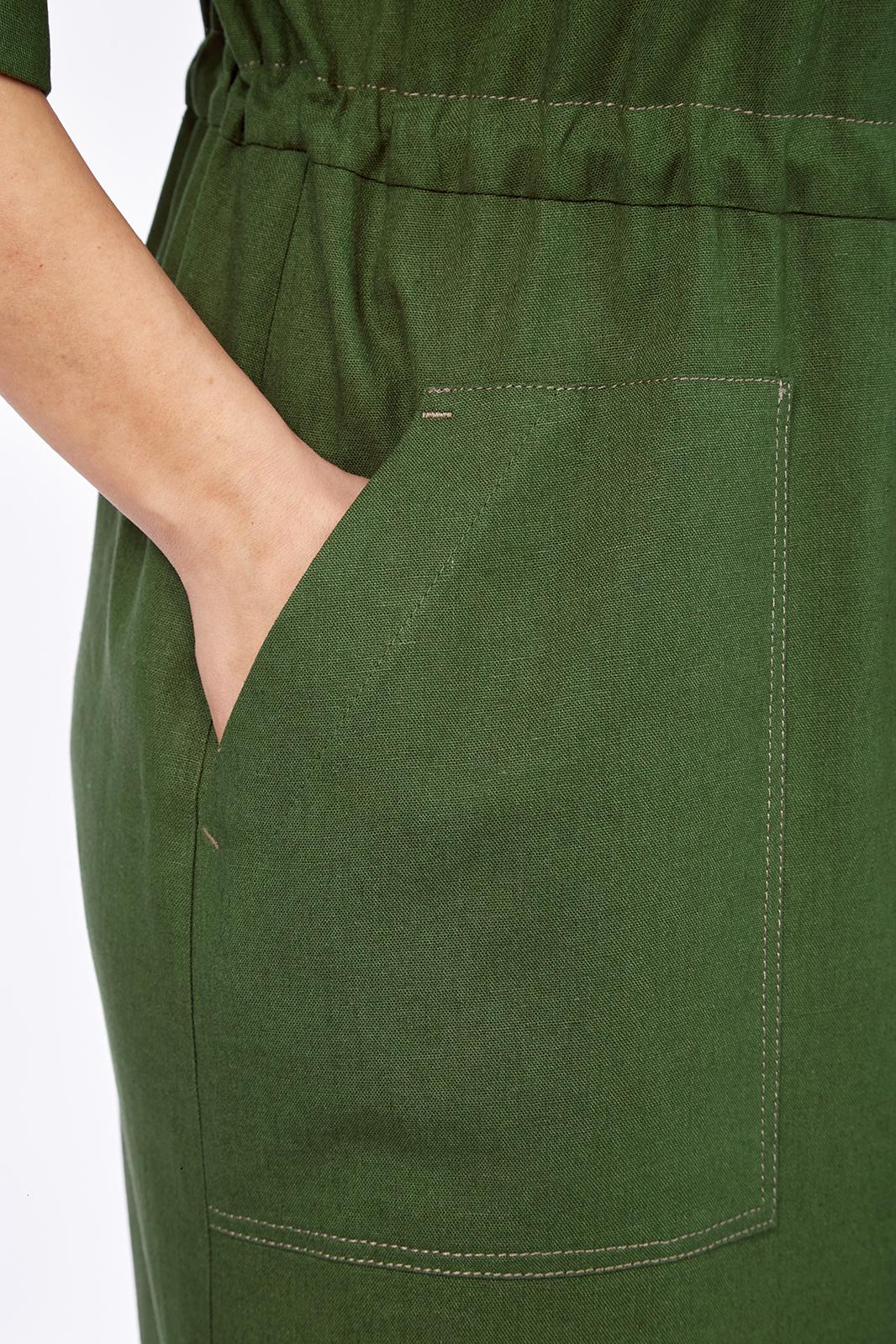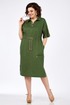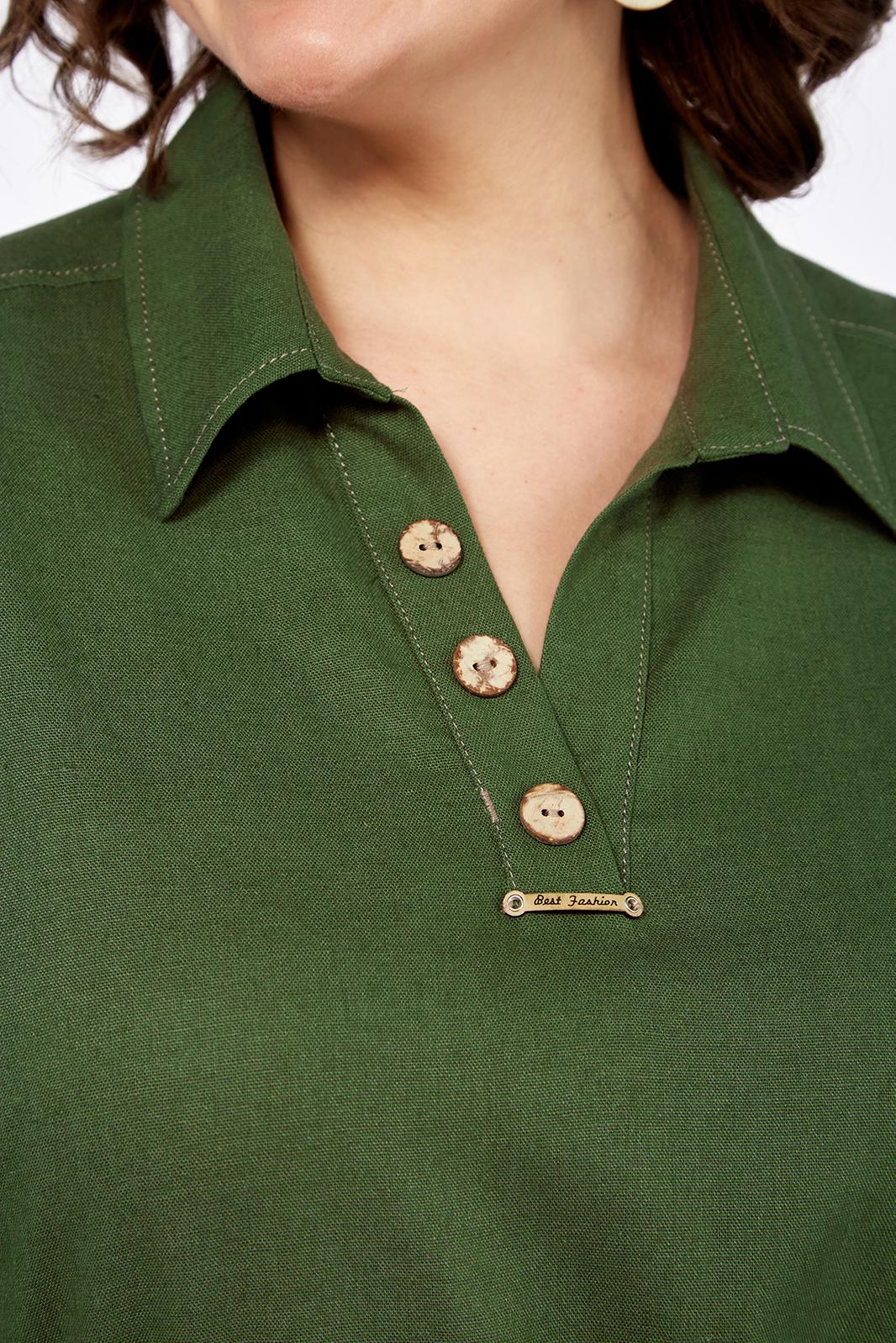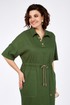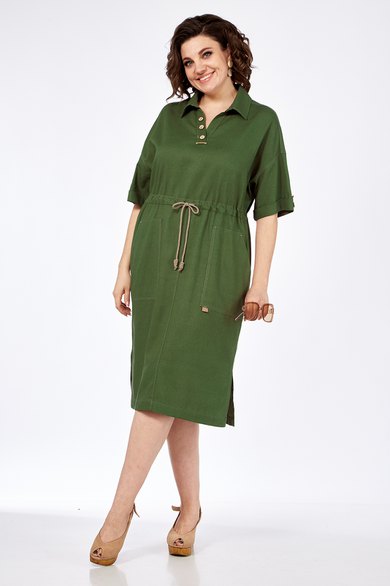 Платье женское, прямого силуэта из плательной ткани. Горловина оформлена воротником и планками, декорированными пуговицами. Платье отрезное по талии с кулисой. Обработаны накладные карманы. Рукав спущенный с отложной манжетой. По спинке кокетка, переходящая на перед. На юбке платья средний шов. В боковых швах разрезы. Платье декорировано отделочной тесьмой и шнуром в цвет тесьмы.