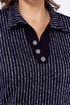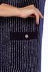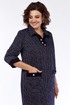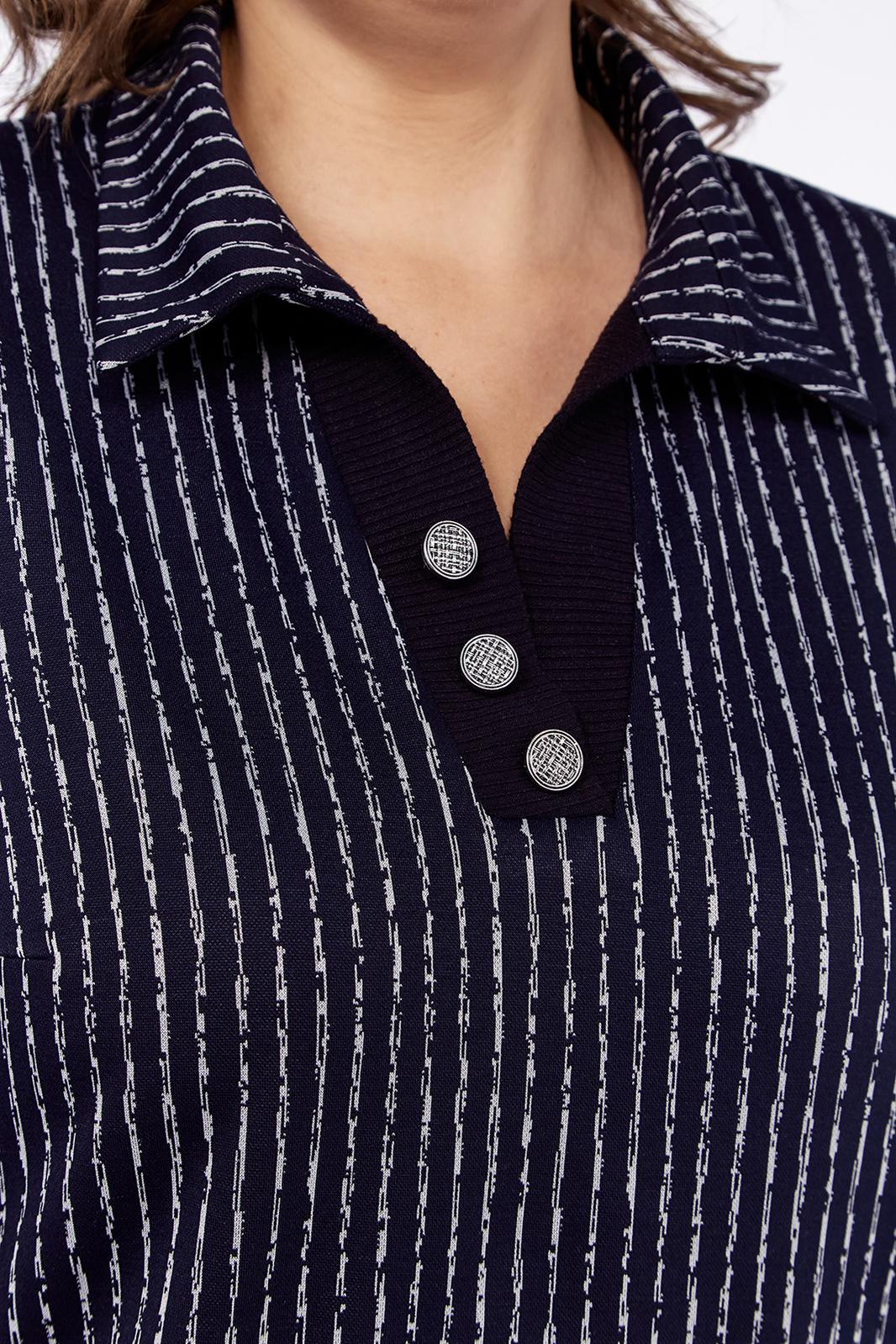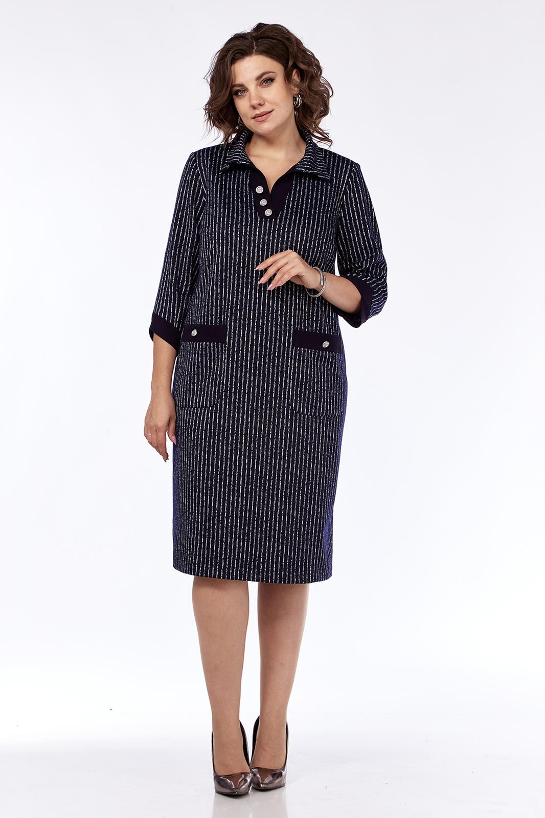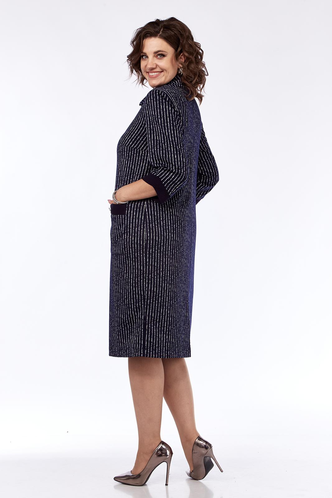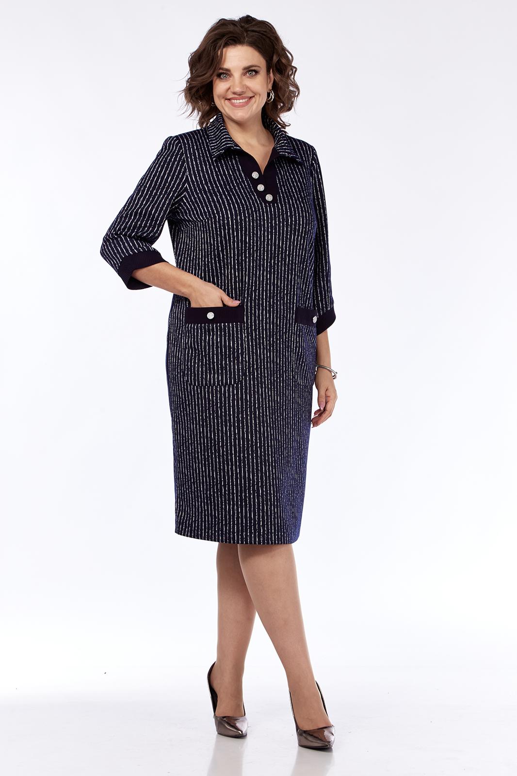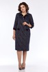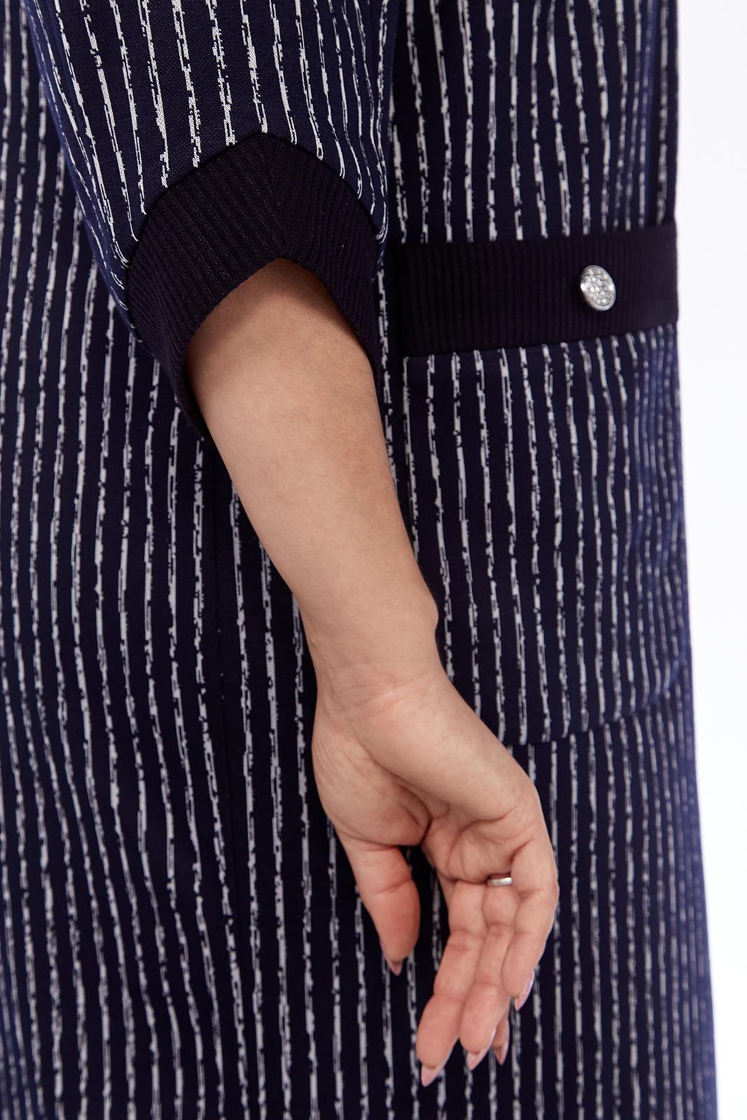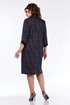 Платье женское, повседневное выполнено из трикотажного полотна прямого силуэта. Горловина V-образной формы с воротником и планками из отделочной ткани. По переду накладные карманы, спинка со средним швом в котором расположен разрез. Рукава втачные, с фигурной манжетой из отделочной ткани. Длина платья по спинке -110 см. Длина рукава — 45 см, длина плеча — 12,5 см.