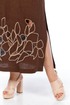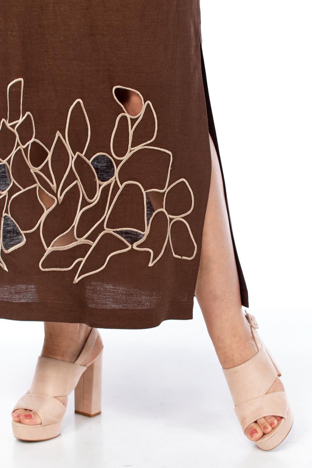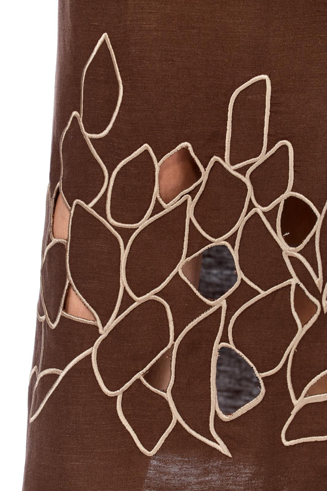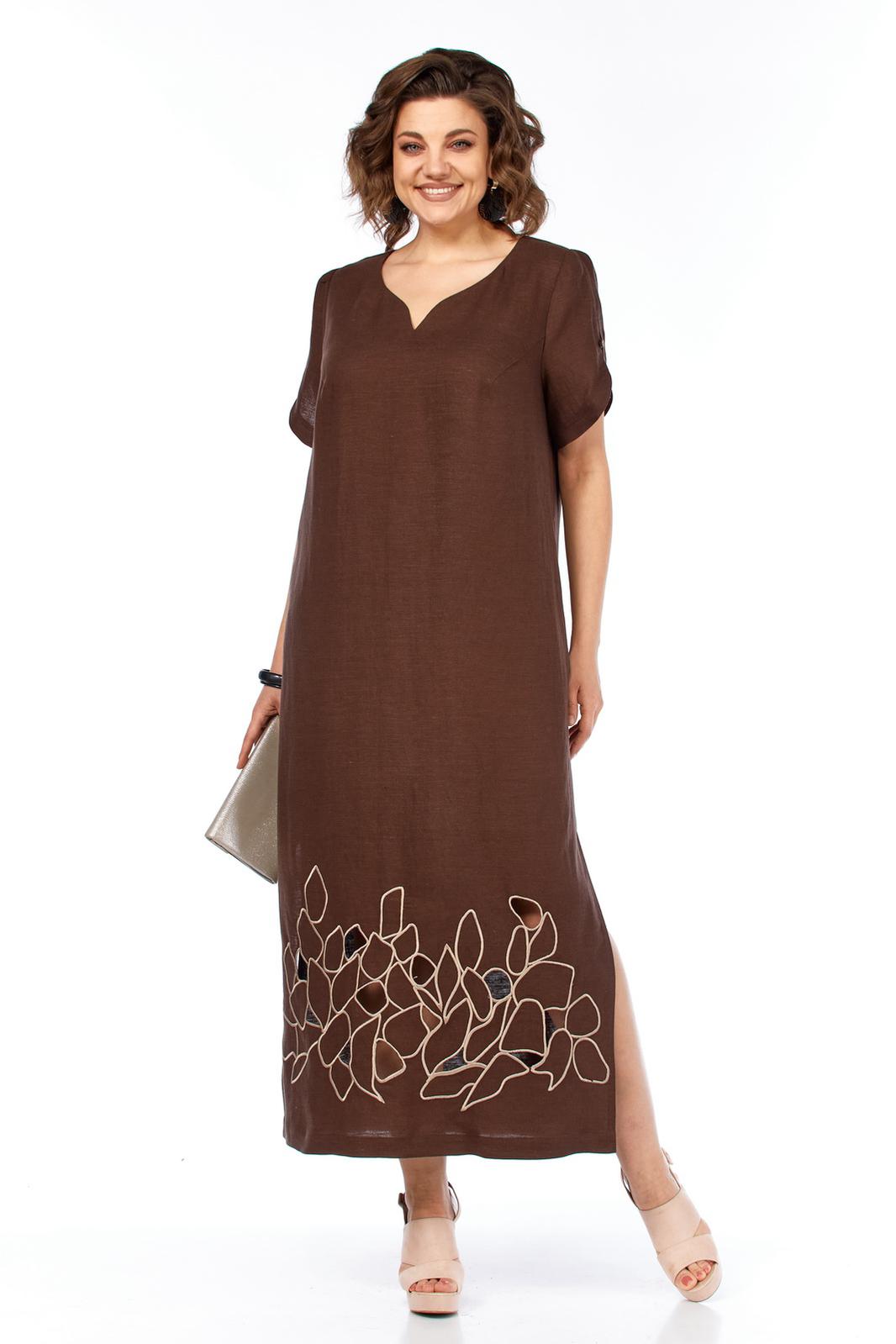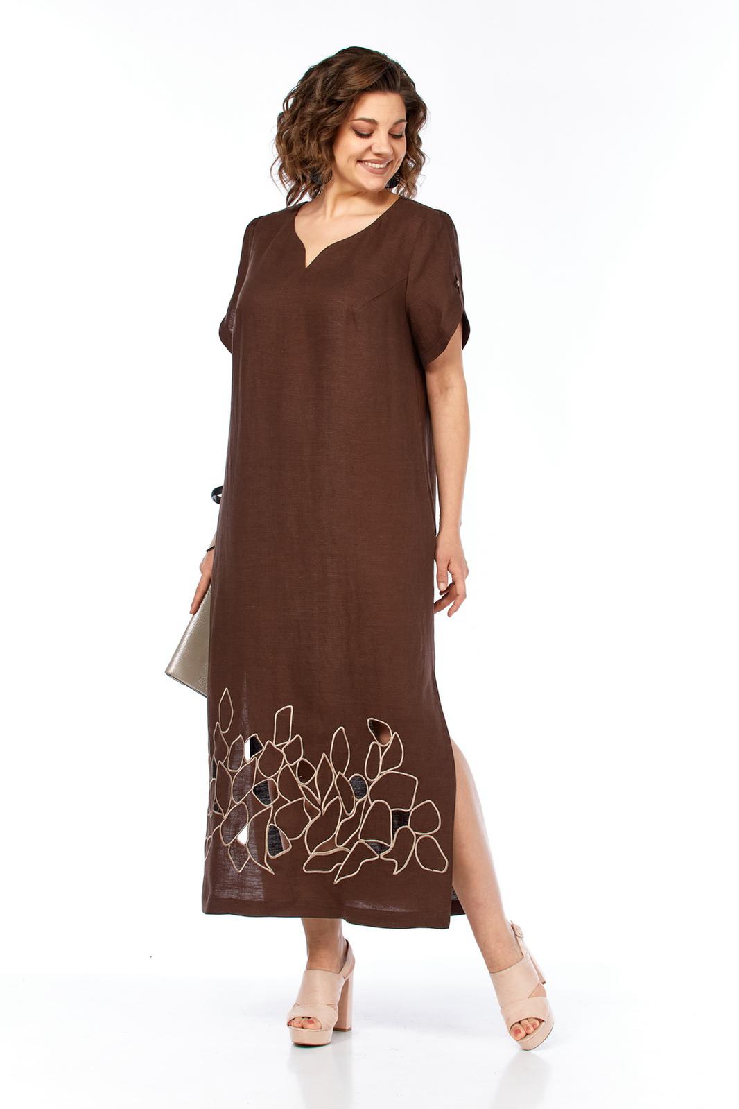 Платье женское, прямого силуэта, выполнено из льняной ткани с фигурным вырезом по горловине. По переду обработаны нагрудные вытачки. Спинка цельнокроенная. Рукава втачные, по окату рукава сборка, нижний срез фигурной формы. Рукав декорирован навесной петлей и пуговицей. Платье дополнено дизайнерской вышивкой в стиле ришелье.