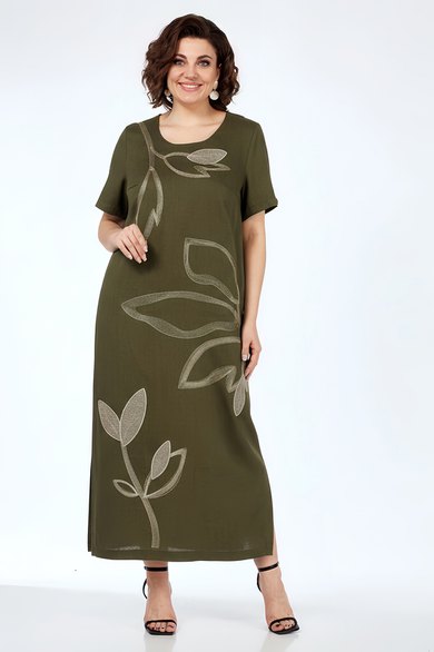 Платье женское прямого силуэта, изготовлено из натуральной ткани. Горловина круглой формы. По переду нагрудные вытачки. На спинке средний шов. В боковых швах обработаны карманы, внизу разрезы. Рукава втачные, разрезные с фигурным вырезом. Платье декорировано дизайнерской вышивкой.