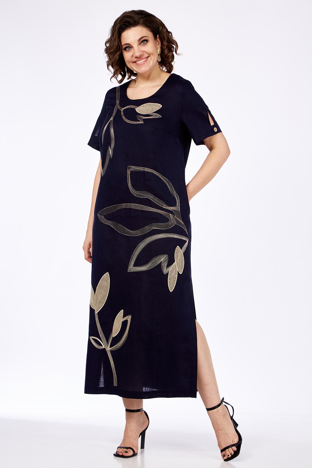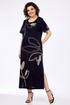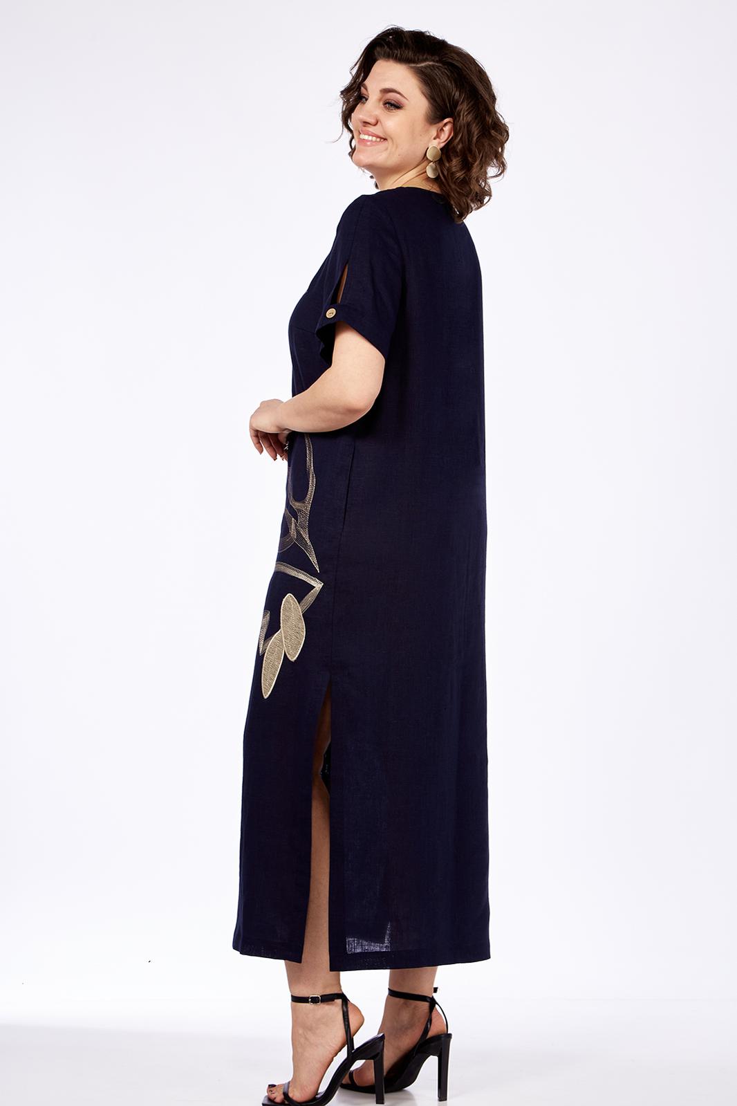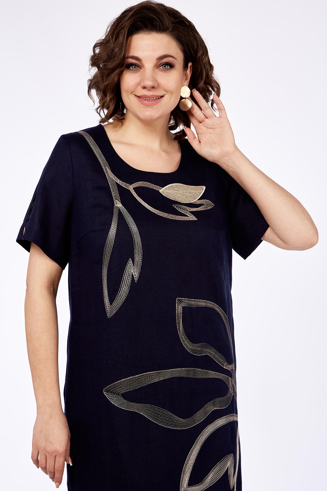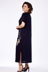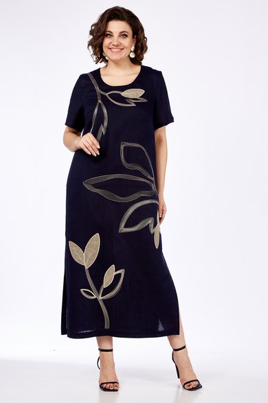 Платье женское прямого силуэта, изготовлено из натуральной ткани. Горловина круглой формы. По переду нагрудные вытачки. На спинке средний шов. В боковых швах обработаны карманы, внизу разрезы. Рукава втачные, разрезные с фигурным вырезом. Платье декорировано дизайнерской вышивкой.