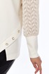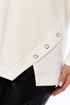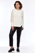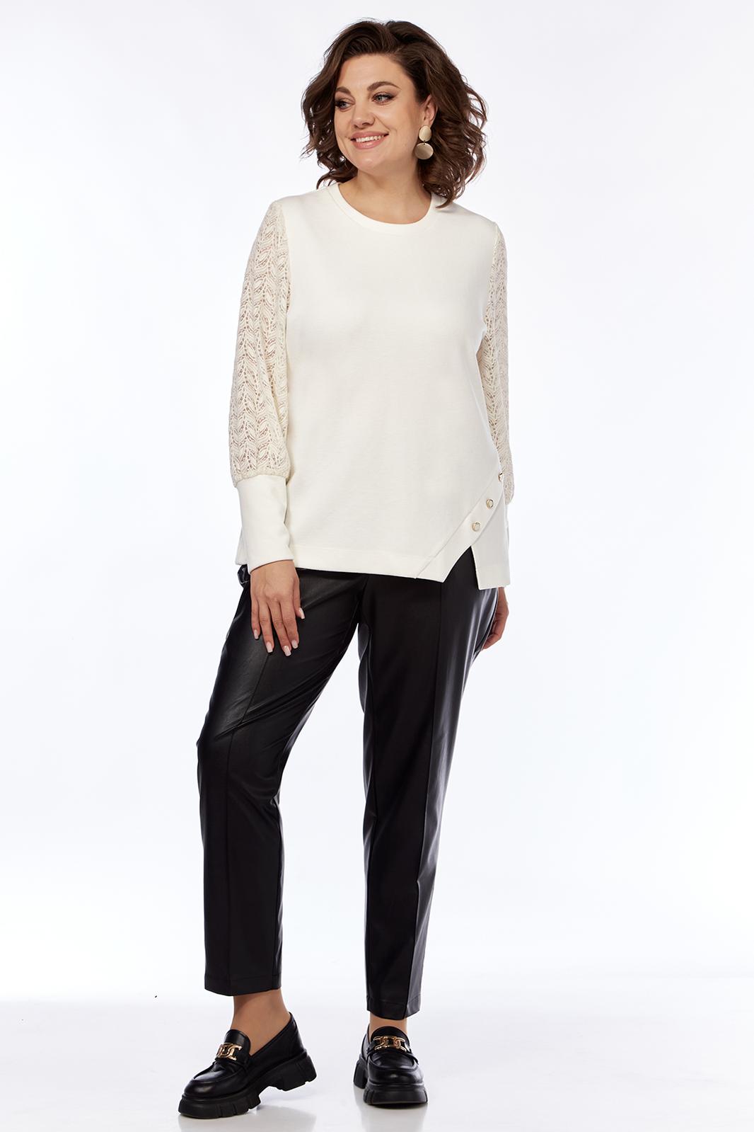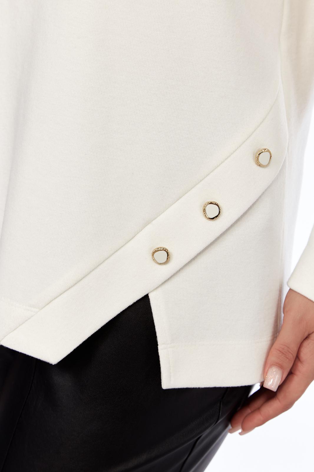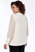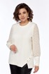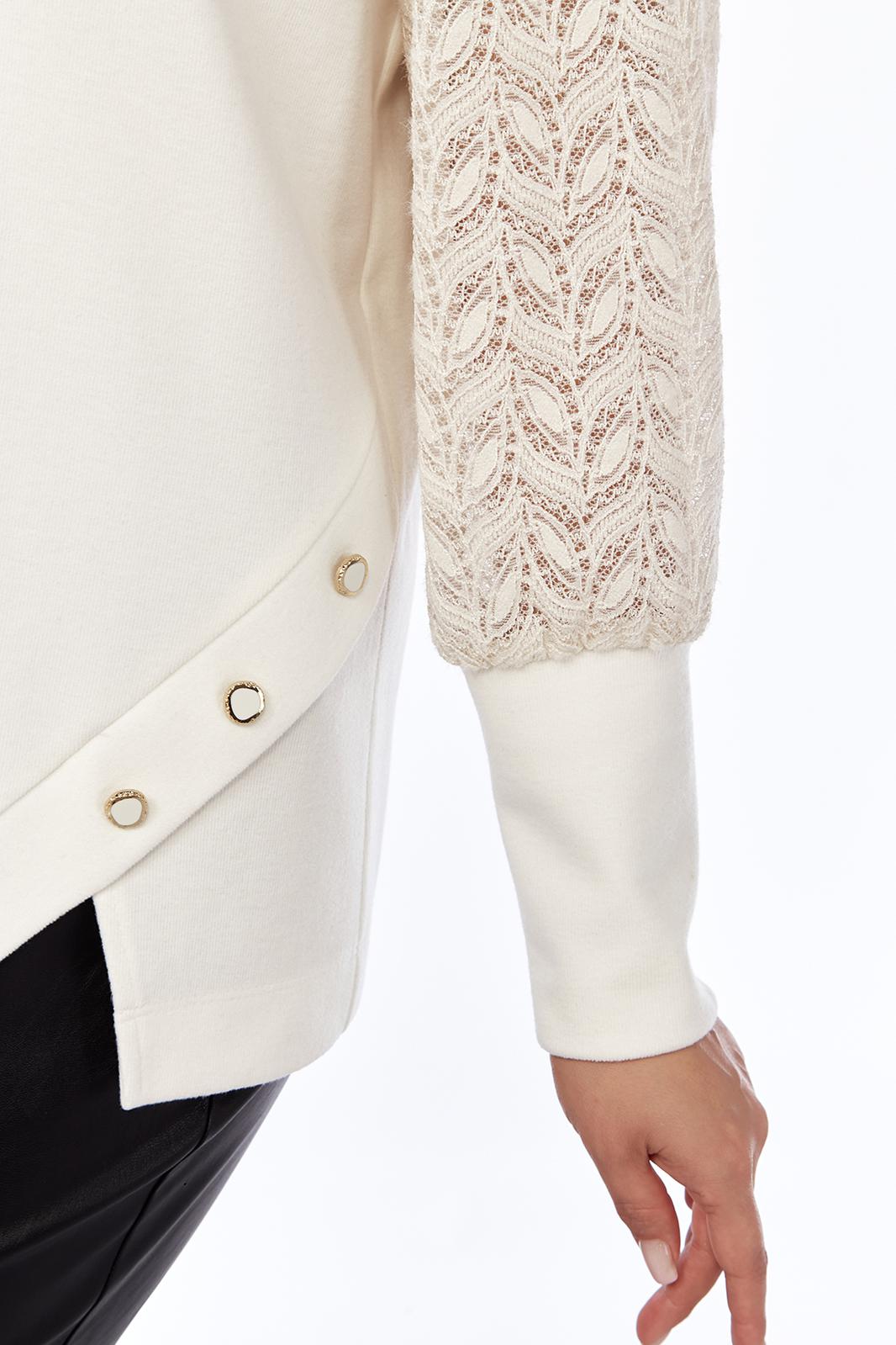 Джемпер женский нарядный, прямого силуэта, выполнен из трикотажного полотна. Горловина округлой формы. Низ переда с асимметричным элементом, декорированный пуговицами. Спинка цельнокроенная. Рукава втачные на манжете выполнены из ажурного трикотажного полотна.