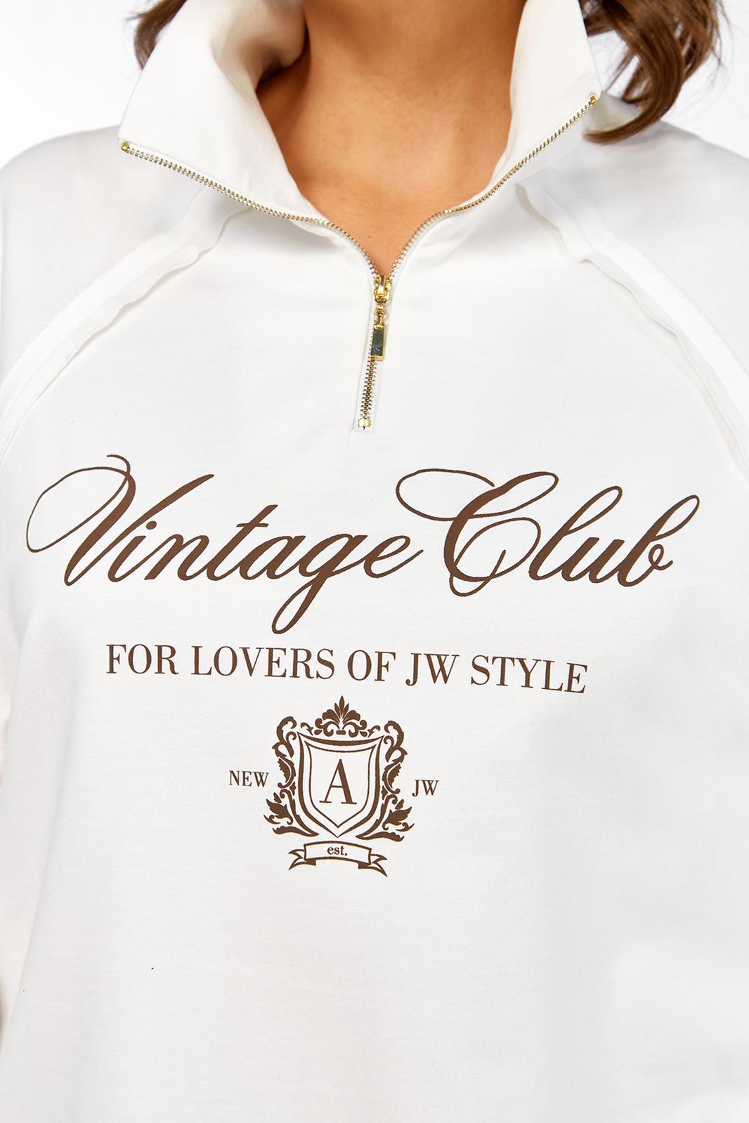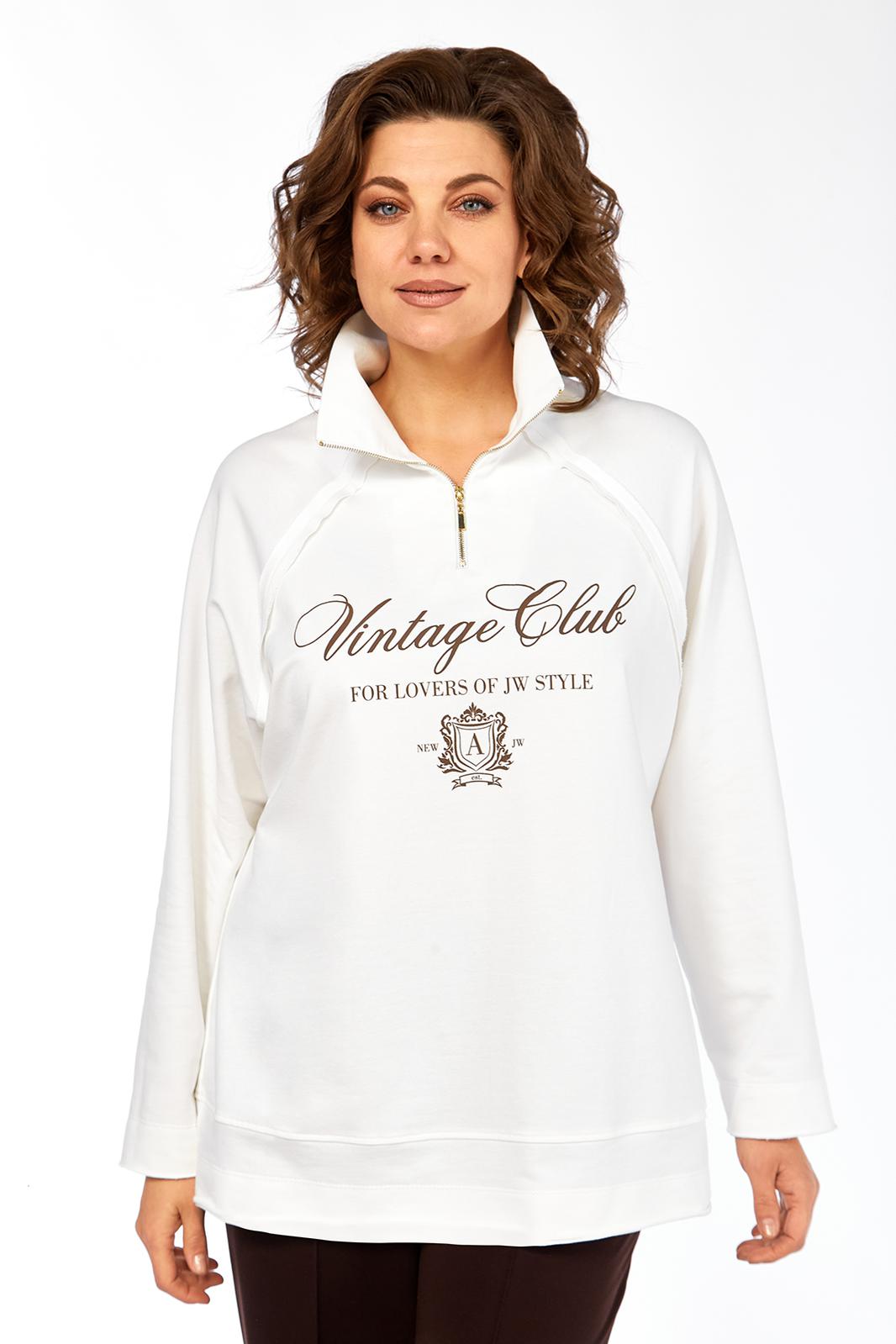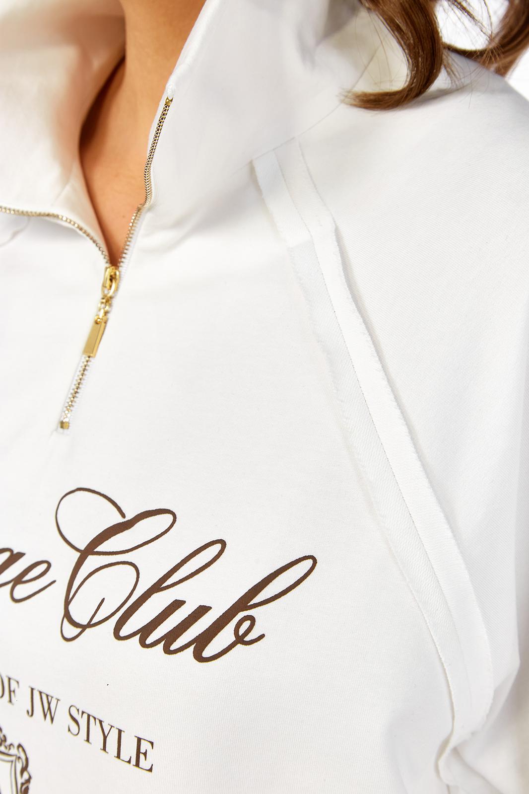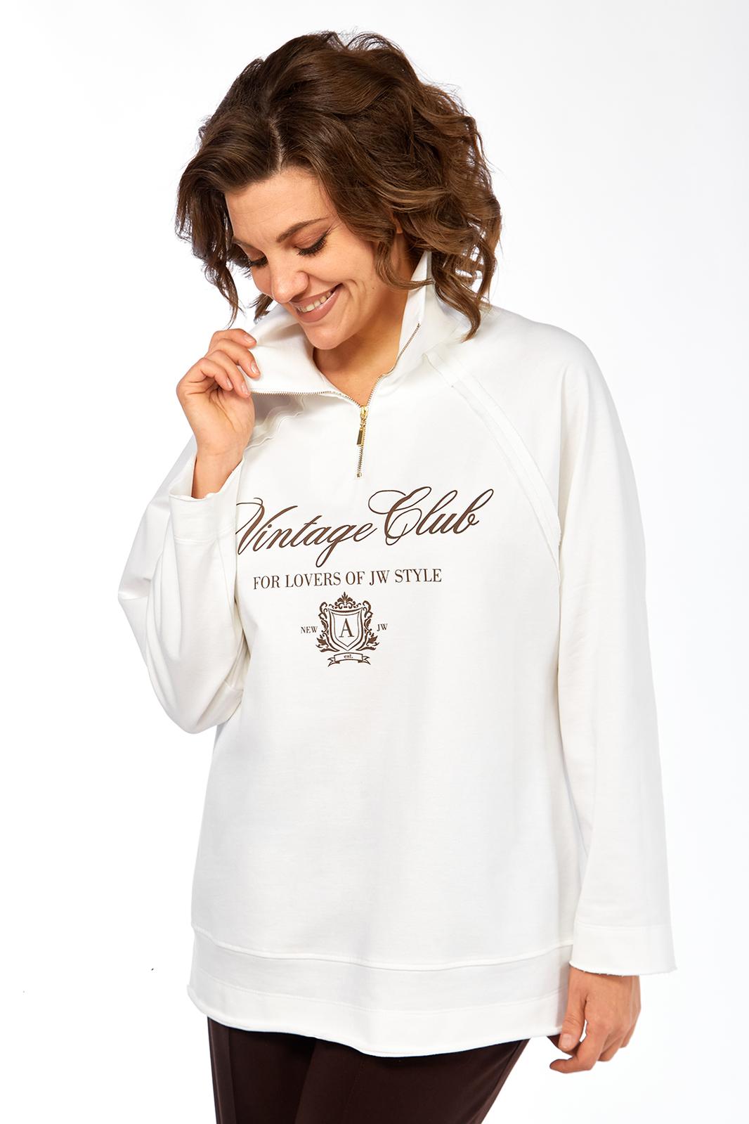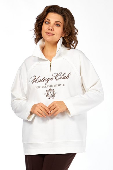 Джемпер свободного силуэта, выполнен из трикотажного хлопкового полотна, с воротником стойка на молнии. Перед и спинка в области бедер с декоративным подрезом. Рукава — реглан. Низ изделия, низ рукавов и швы втачивания рукавов выполнены декоративным необработанным срезом. Джемпер дополнен дизайнерской печатью.