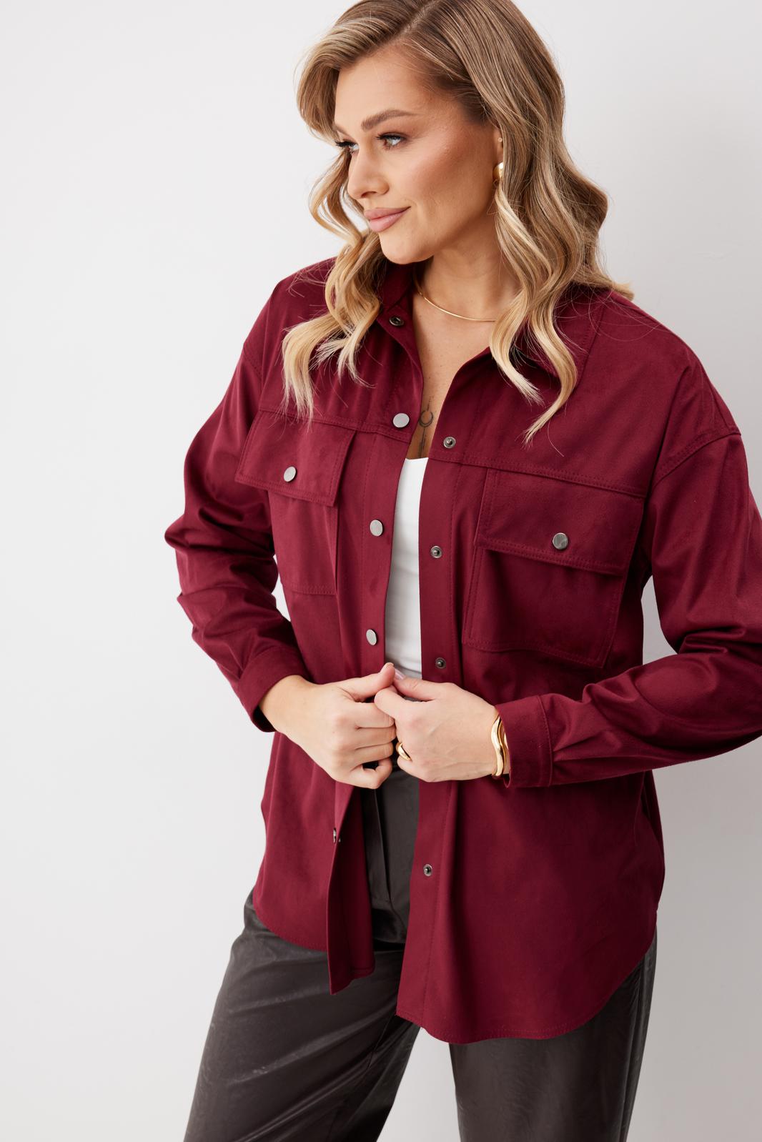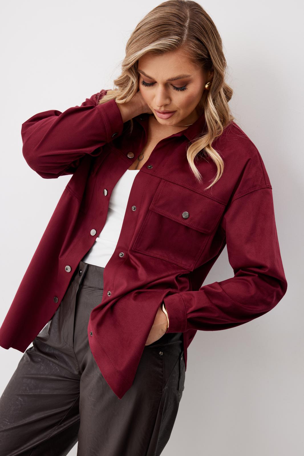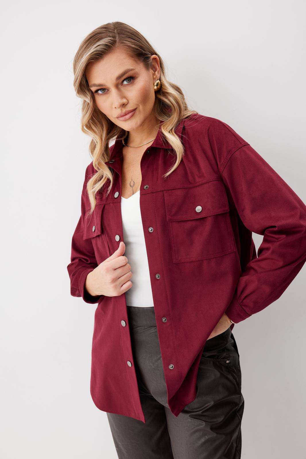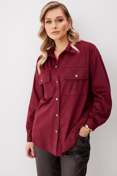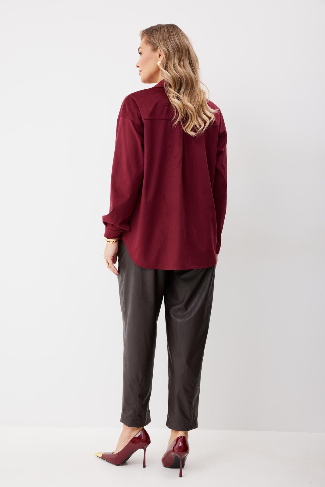 Блузка женская прямого силуэта из замшевой ткани длиной за линию бедер. По переду блузки отрезные кокетки и нагрудные накладные карманы с клапаном, застегивающиеся на кнопку. Спинка с отрезной кокеткой и встречной складкой. Линия плеча спущена. Рукав рубашечный втачной по низу с 2 –мя складками и отрезной манжетой, застегивающейся на кнопку. Воротник втачной рубашечный. Линия низа имеет фигурную форму. Воротник, кокетки, карманы, линия проймы отстрочены отделочными строчками. Застежка на кнопки центральная.