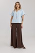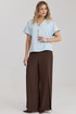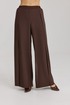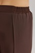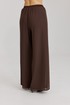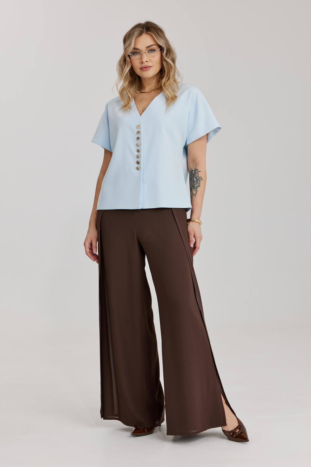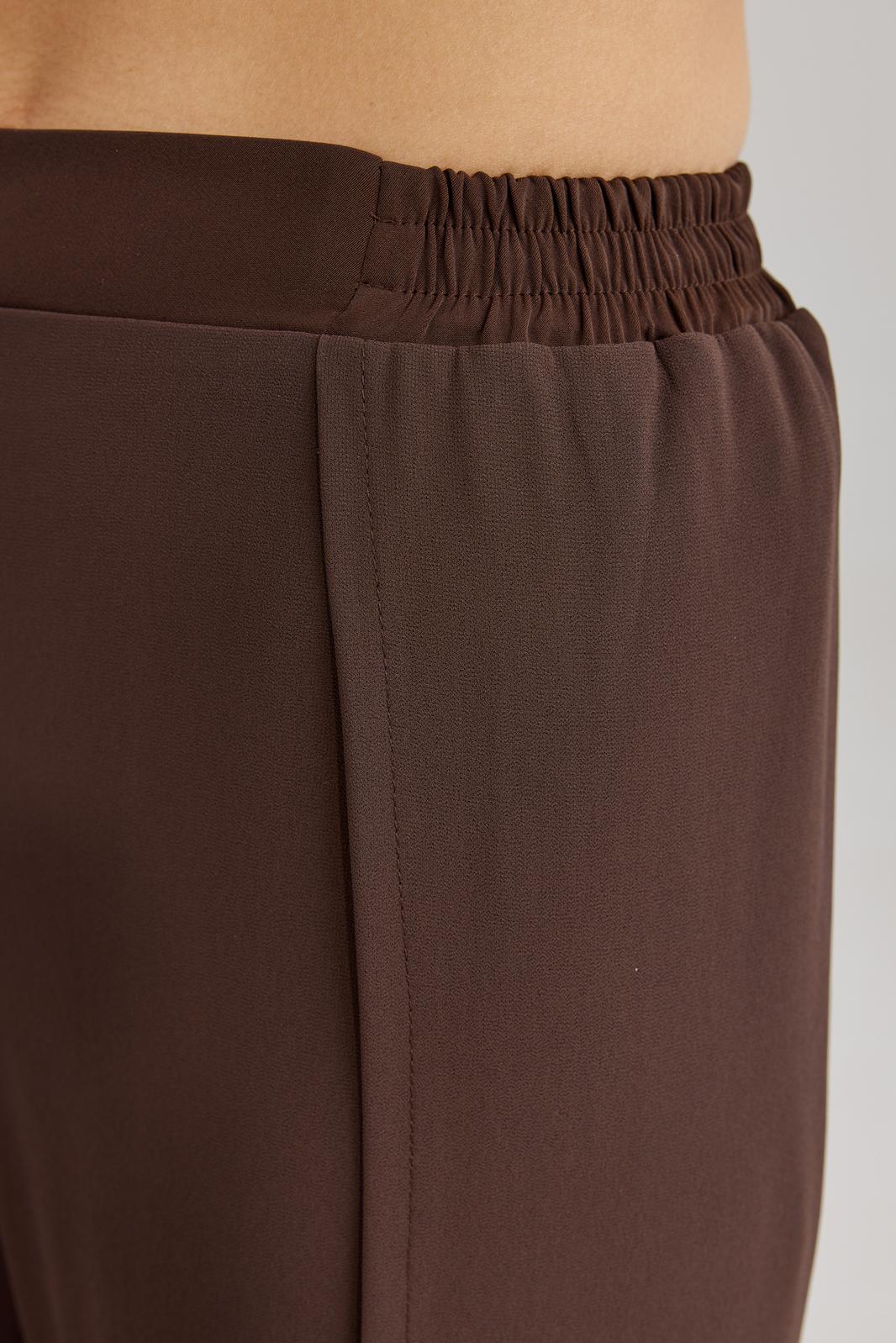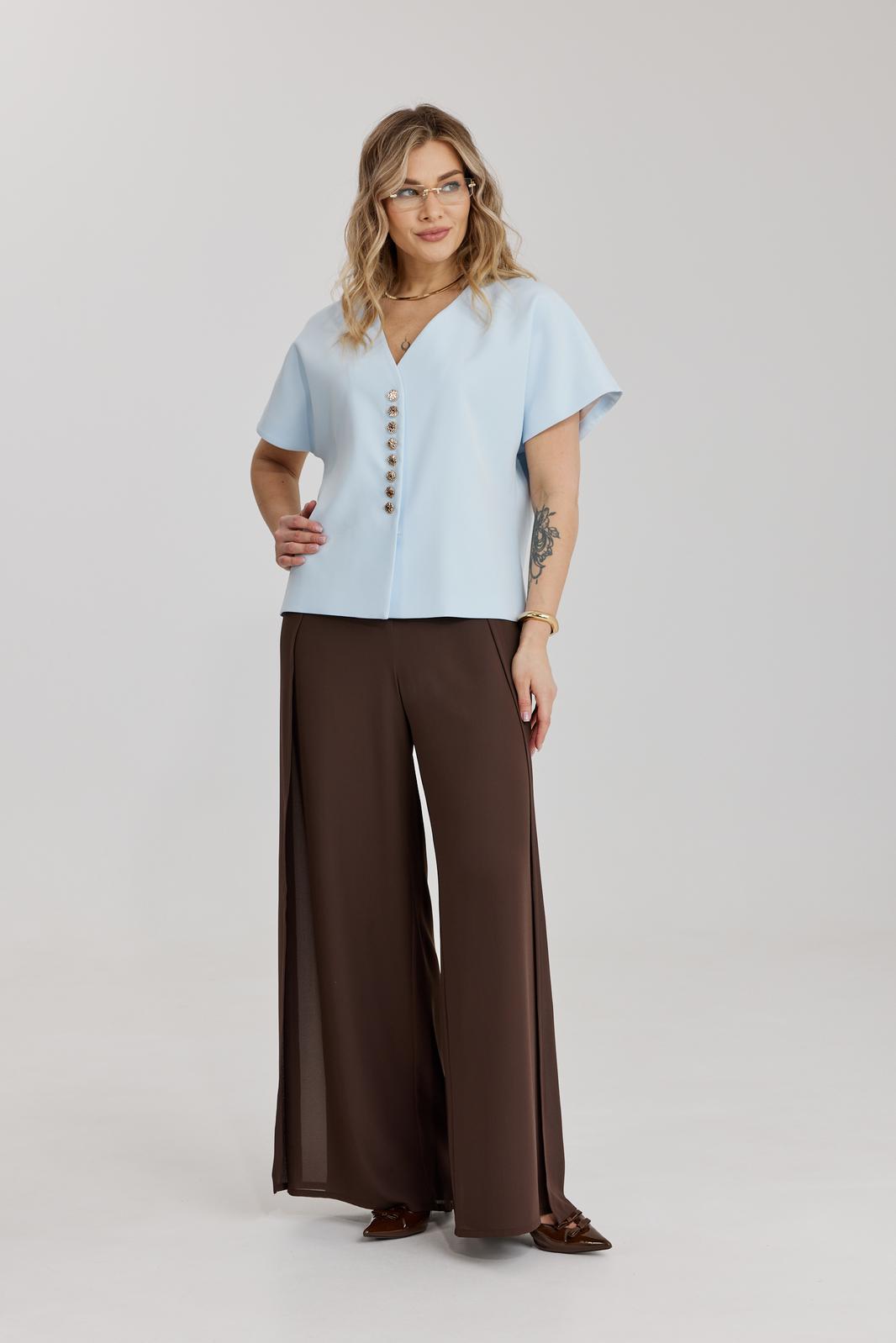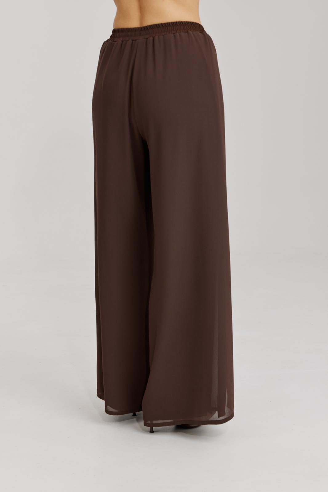Брюки прямого силуэта, выполнены из шифоновой ткани на подкладке полной длинны. Боковой шов брюк открыт. Синка брюк заходит на перед по верхней части. Подкладка из не просвещающейся креповой ткани. Верх брюк обработан отрезным поясом. Центральная часть пояса без резинки, остальной пояс на резинке. Низ брюк обработан швом « в подгибку».