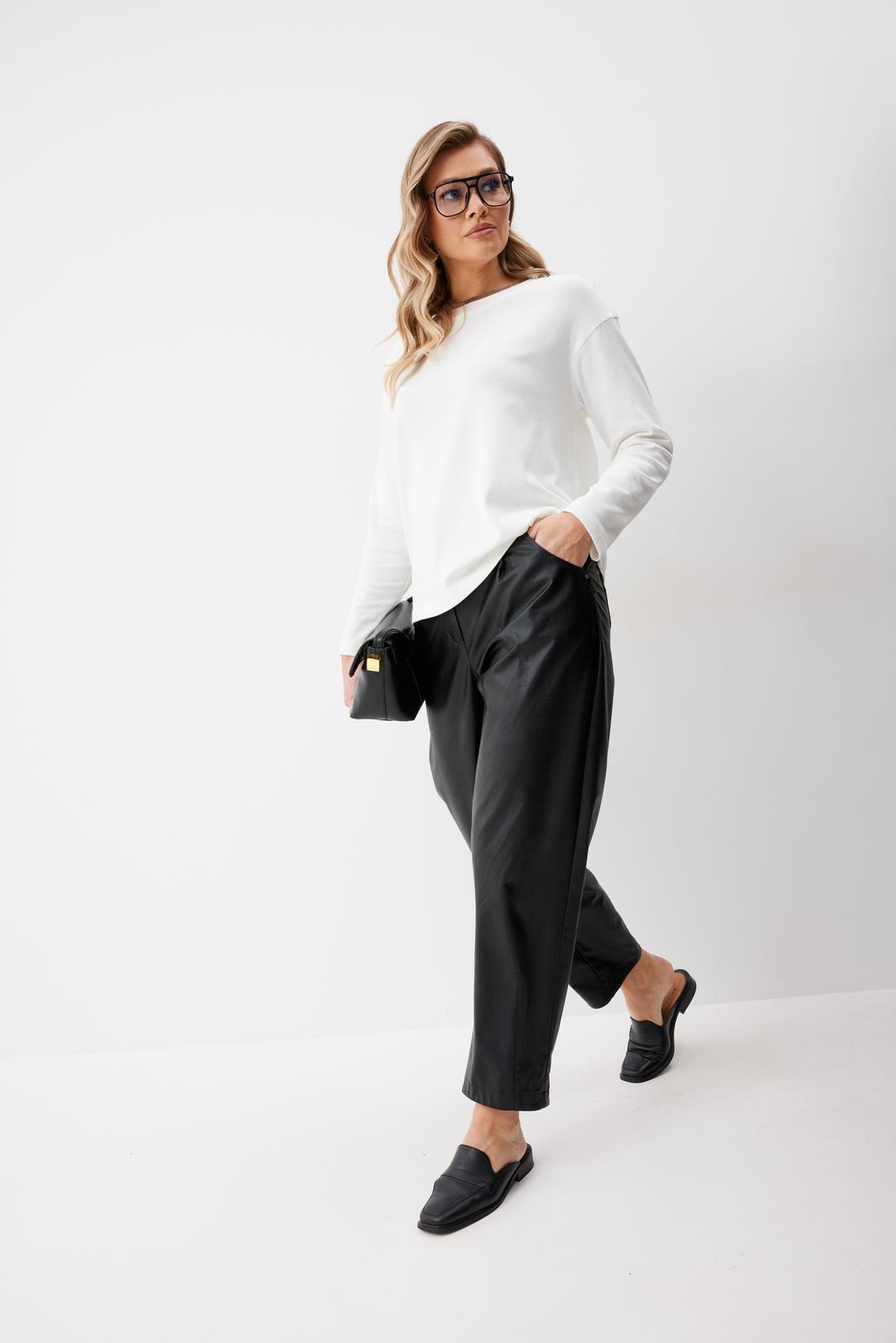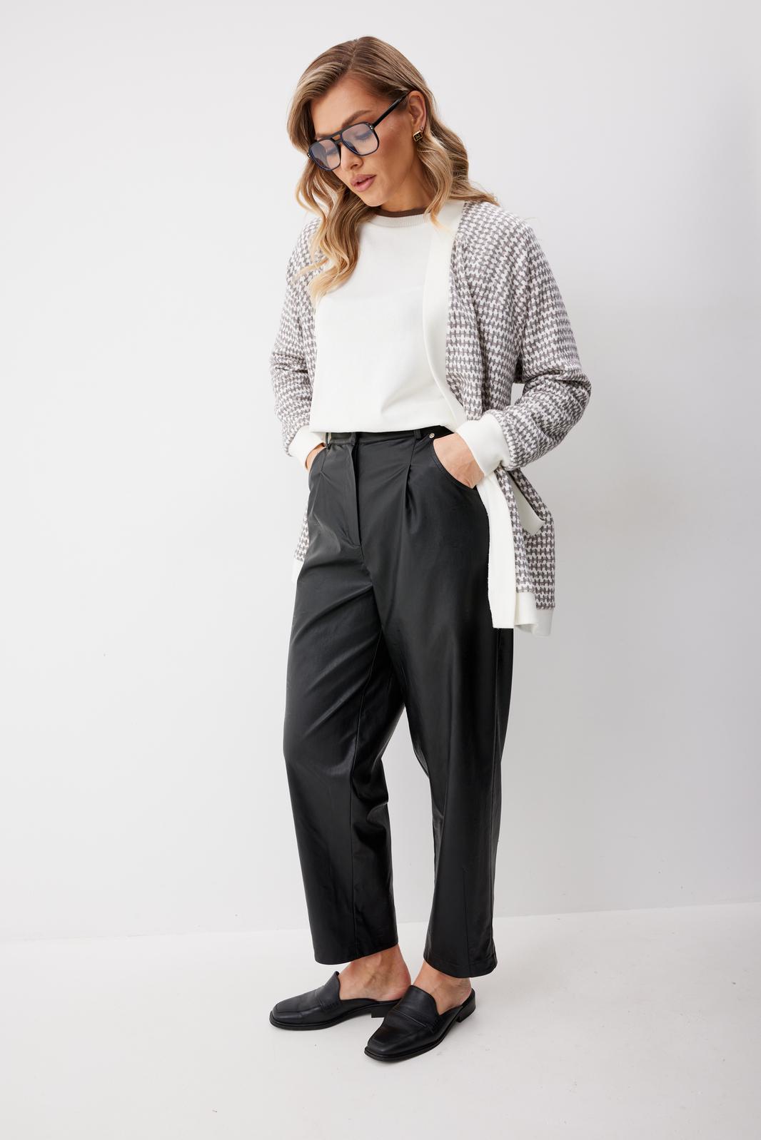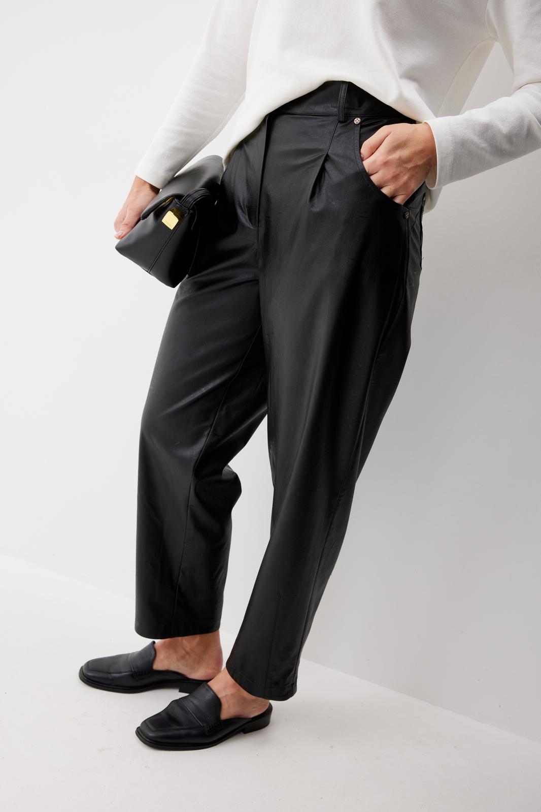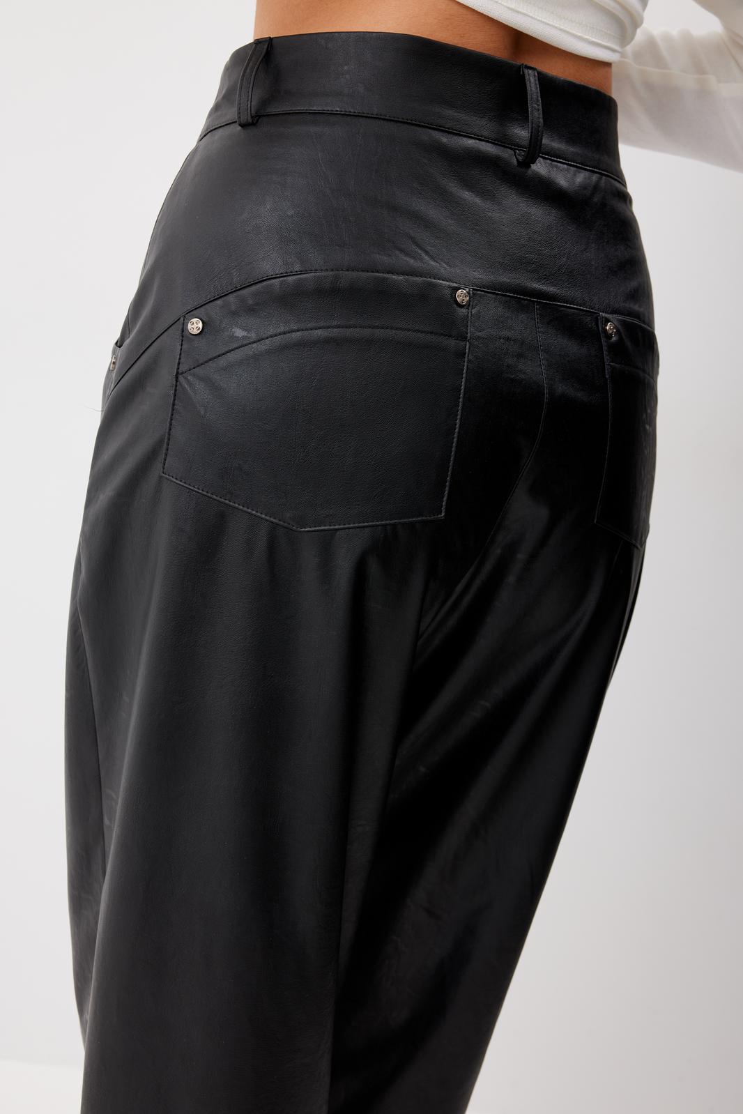 Брюки женские из искусственной кожи зауженные к низу. На передних частях брюк обработаны карманы с отрезным бочком и застрочены складки. По концам кармана установлены хольнитены. По спинке брюк накладные карманы с хольнитенами на концах и отрезной кокеткой. Верхний срез брюк обработан отрезным поясом со шлевками. Брюки застегиваются по переду на «молнию» в гульфике и кнопку по поясу.