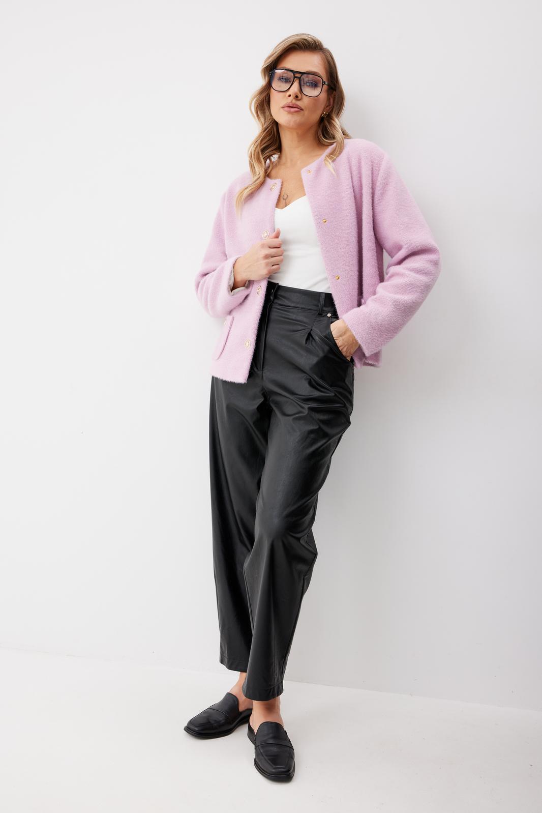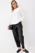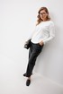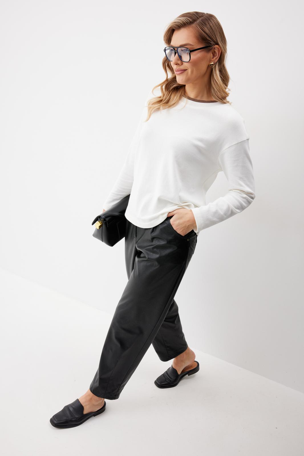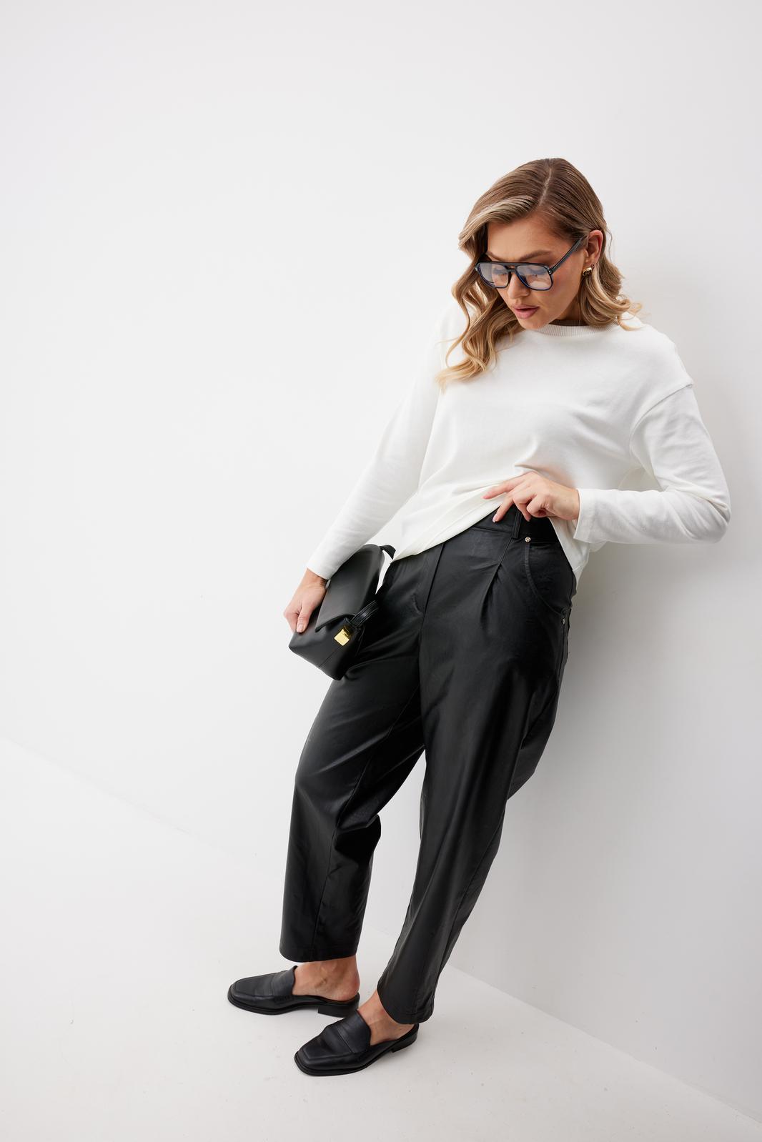 Брюки женские из искусственной кожи зауженные к низу. На передних частях брюк обработаны карманы с отрезным бочком и застрочены складки. По концам кармана установлены хольнитены. По спинке брюк накладные карманы с хольнитенами на концах и отрезной кокеткой. Верхний срез брюк обработан отрезным поясом со шлевками. Брюки застегиваются по переду на «молнию» в гульфике и кнопку по поясу.