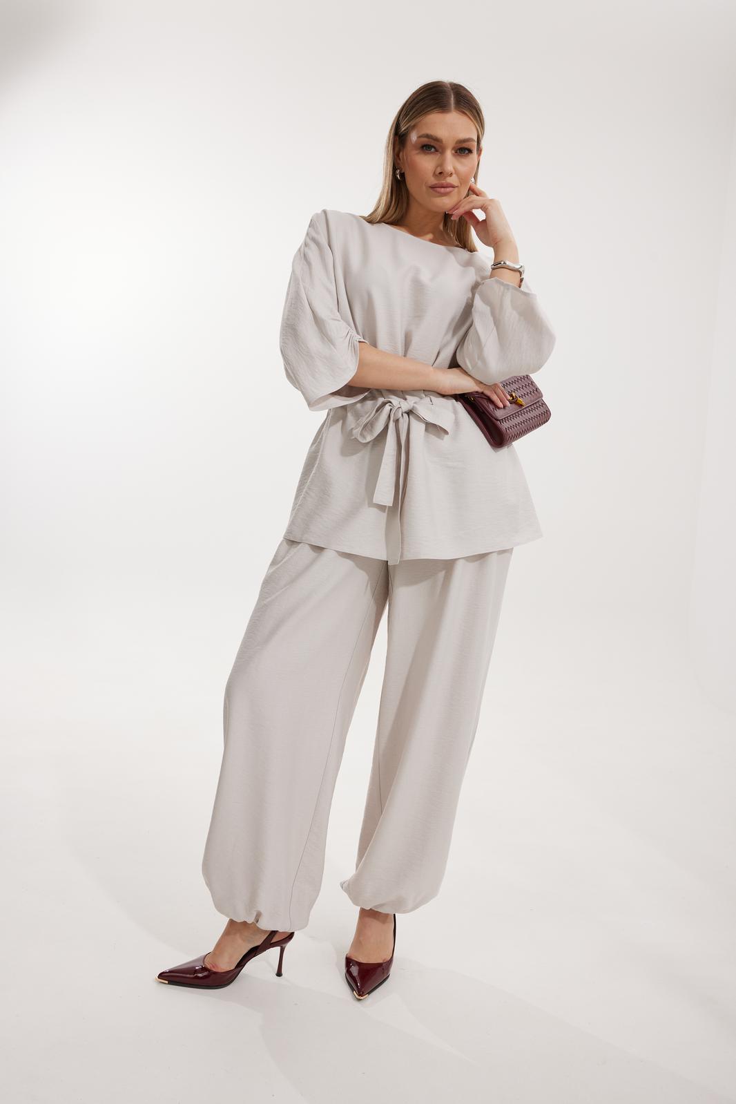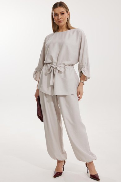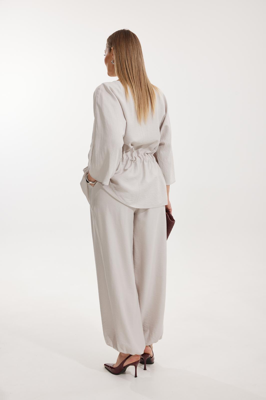 Брюки прямого силуэта с карманами в боковом шве и имитацией гульфика. Пояс притачной на резинке со шнуром в цвет отделочного канта. На задних половинках брюк застрочены вытачки. По низу брюки собраны на резинку.