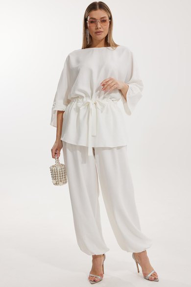 Брюки прямого силуэта с карманами в боковом шве и имитацией гульфика. Пояс притачной на резинке со шнуром в цвет отделочного канта. На задних половинках брюк застрочены вытачки. По низу брюки собраны на резинку.
