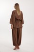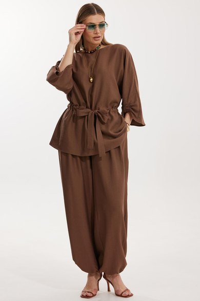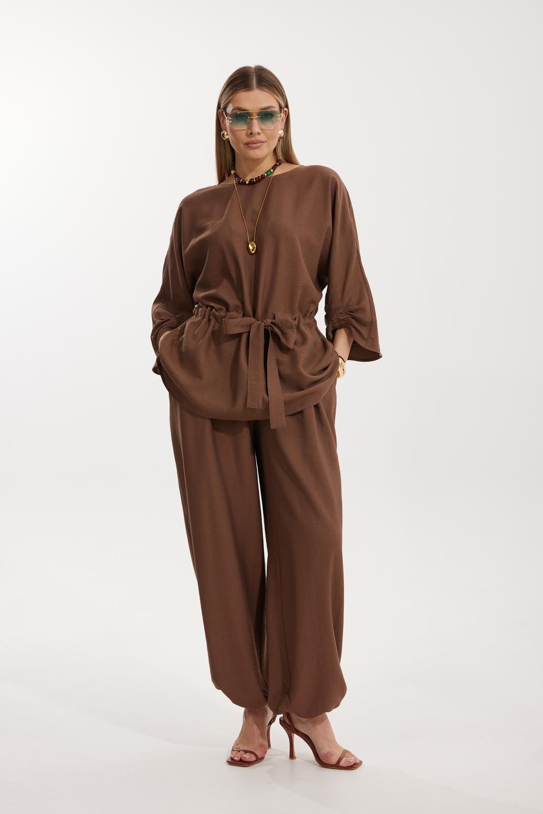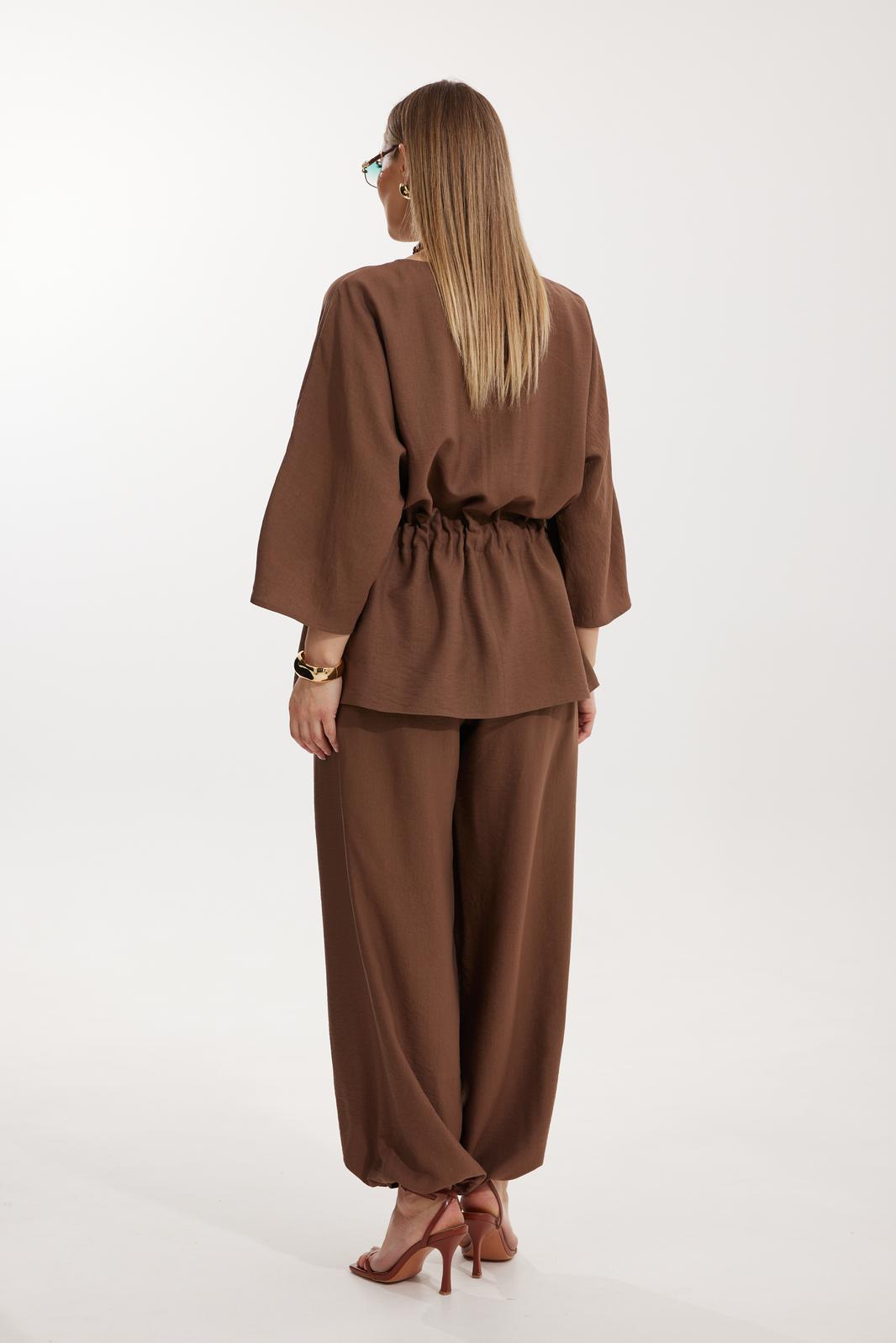 Брюки прямого силуэта с карманами в боковом шве и имитацией гульфика. Пояс притачной на резинке со шнуром в цвет отделочного канта. На задних половинках брюк застрочены вытачки. По низу брюки собраны на резинку.