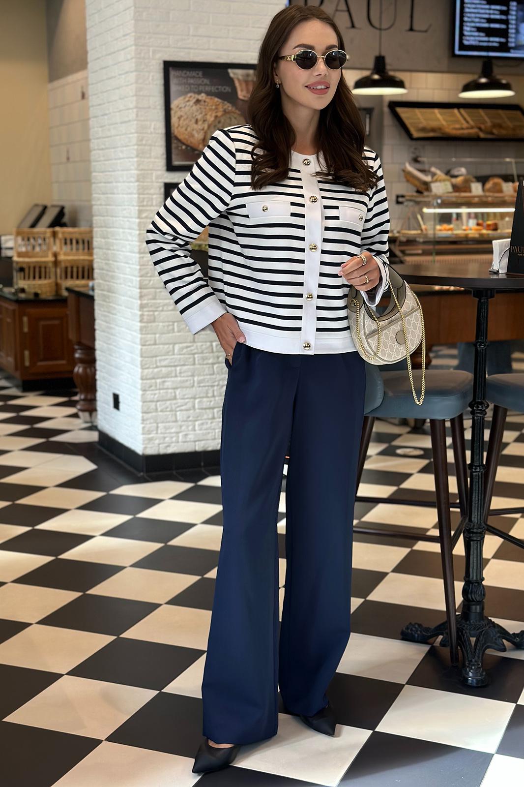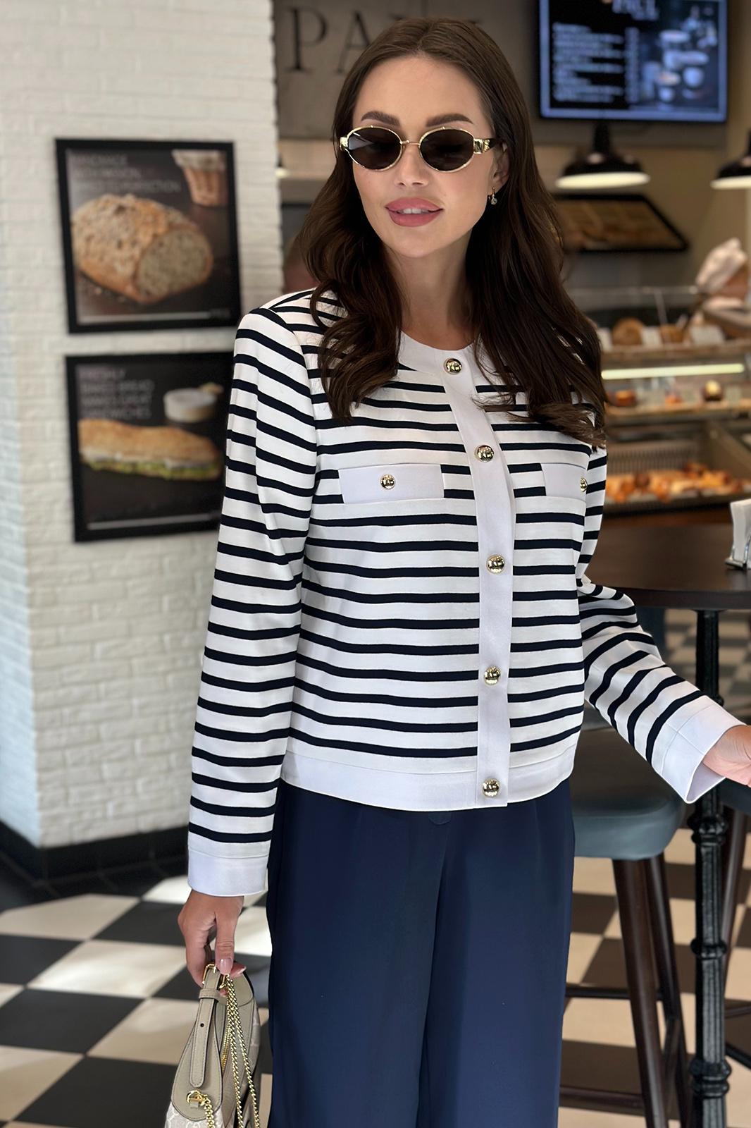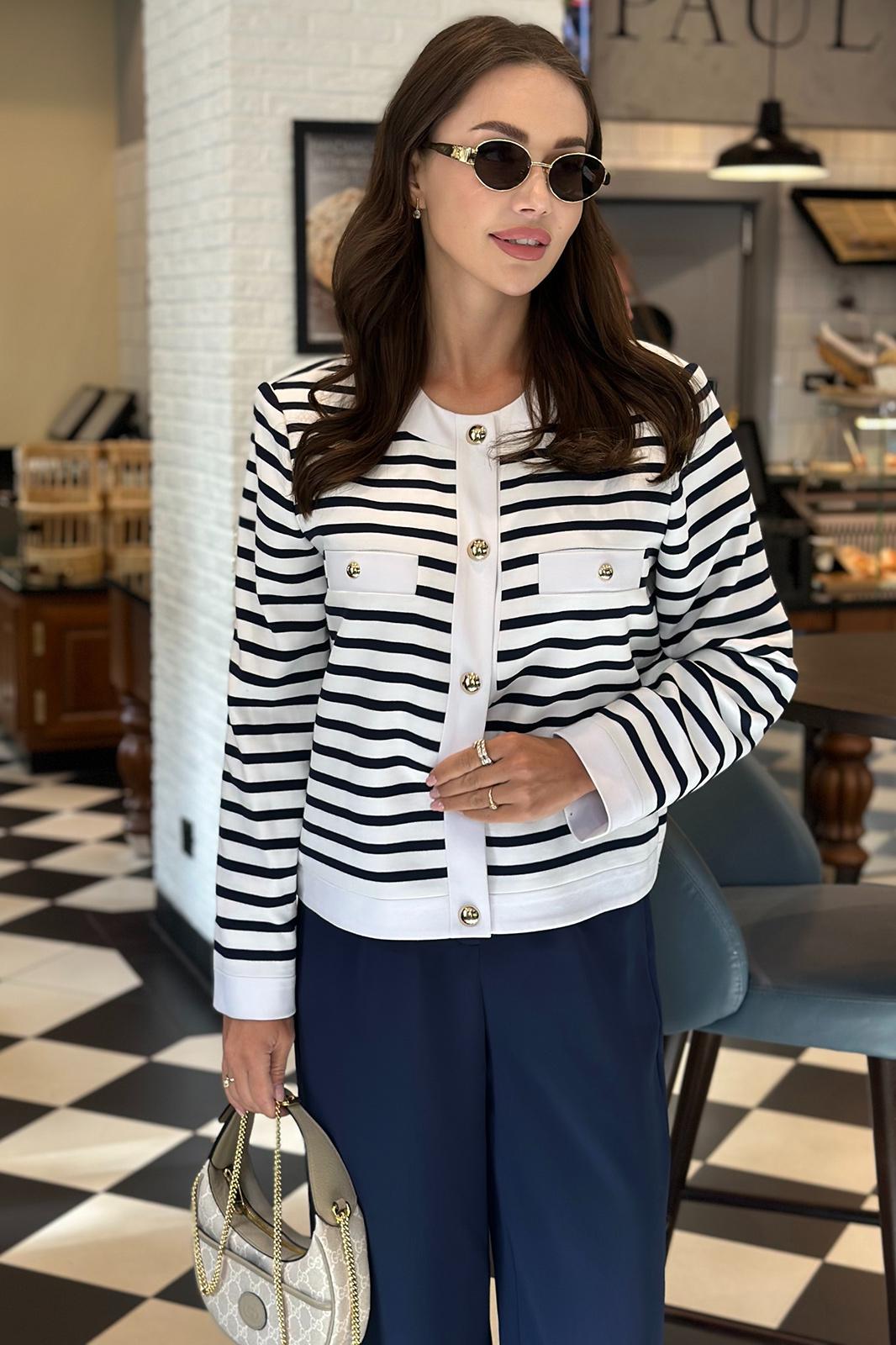 Жакет женский прямого силуэта, на подкладке, застегивающийся на кнопки. По переду в области груди расположены прорезные нефункциональные карманы с листочкой из ткани-компаньона. Спинка цельнокроеная. Плечо спущено. Рукав длинный, одношовный. Горловина округлой формы. Обтачка горловины, низ жакета, манжета рукава и планки переда выполнены из ткани-компаньона.Цвет материала может отличаться по тону в зависимости от настроек вашего монитора!